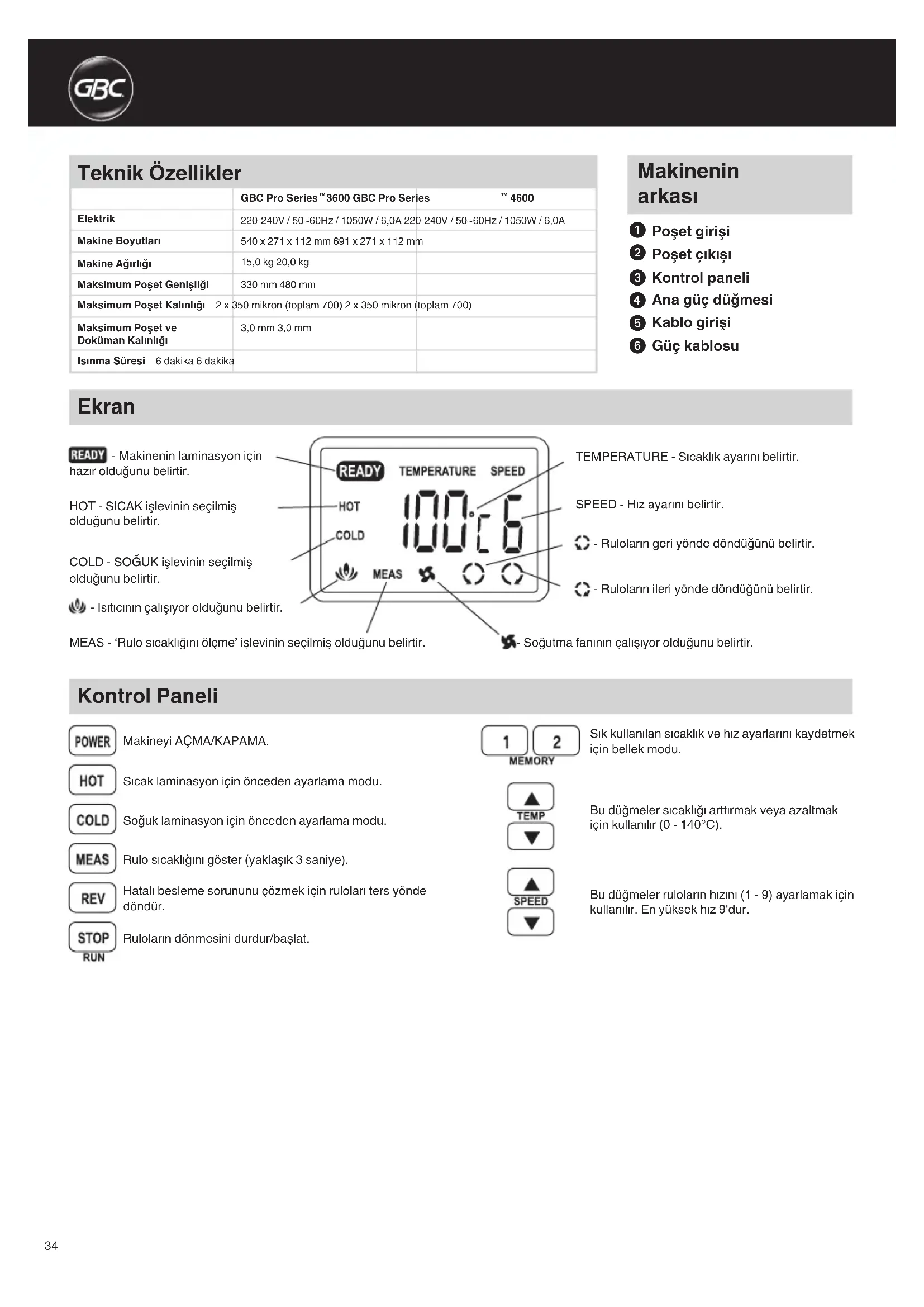 - Laminasyondan önce poşetleri kesmeyin. LaminasyonKılavuzu Kağıttipi Filmkalınlığı Taşıyıcısızsıcaklık Taşıyıcılısıcaklık Sıcaklık Hız Sıcaklık Hız Fotokopikağıdı 75-100 mikron 100°C 6 130°C 4 125-150 mikron 120°C 4 130°C 3 175-250 mikron 120°C 3 140°C 2 300-350 mikron 130°C 2 - - Kuşekağıt 75-100 mikron 100°C 5 130°C 4 125-150 mikron 120°C 3 140°C 3 175-250 mikron 130°C 2 140°C 2 300-350 mikron 140°C 2 - - Fotoğrafkağıdı 75-100 mikron 100°C 4 130°C 3 125-150 mikron 130°C 3 140°C 2 175-250 mikron 140°C 2 140°C 1 NOT: “BEKLEME” modu için, lütfen sıcaklığı 70°C derecede ve hızı 2'de tutun. Garanti Bu makinenin işleyişi, normal şekilde kullanılması kaydıyla, satın alındığı tarihten itibaren 1 yıl süreyle garantilidir. Garanti süresi içinde ACCO Brands Europe, kendi takdirine göre arızalı makineyi ücretsiz olarak ya tamir edecek ya da değiştirecektir. Kullanma hatalarından veya makinenin amacı dışında kullanılmasından kaynaklanan arızalar garanti kapsamında değildir. Garantiden yararlanabilmek için satın alma tarihinin kanıtlanması gerekmektedir. ACCO Brands Europe tarafından yetki verilmemiş kişilerce yapılacak onarımlar ya da değişiklikler garantiyi geçersiz kılacaktır. Amacımız ürünlerimizin belirtilen teknik özelliklere göre performans göstermesini sağlamaktır. Bu garanti, tüketicinin satılan mallara ilişkin ulusal mevzuat uyarınca sahip olduğu yasal hakları etkilemez. Garanti süresi içerisinde üründe teknik bir kusur bulunması halinde, lütfen ilgili ACCO servis merkezi ile irtibat kurun. Sorun tanımlanmasına ve model tipine bağlı olarak, ya bir mühendisin servis için sizi ziyaret etmesini sağlayacağız, ya da sizden makineyi ACCO'ya iade etmenizi isteyeceğiz. Makineyi iade etmeniz halinde, takdir yetkisi kendine ait olmak üzere ve kanunlara uygun olarak ACCO ya (1) makineyi yeni veya yenilenmiş parçalar kullanarak onaracak, ya da (2) makineyi eşdeğer yeni veya yenilenmiş bir makineyle değiştirecektir. Bu ürünü www.accobrands.com adresinde online olarak kaydettirin.38 Τεχνικέςπροδιαγραφές GBC Pro Series