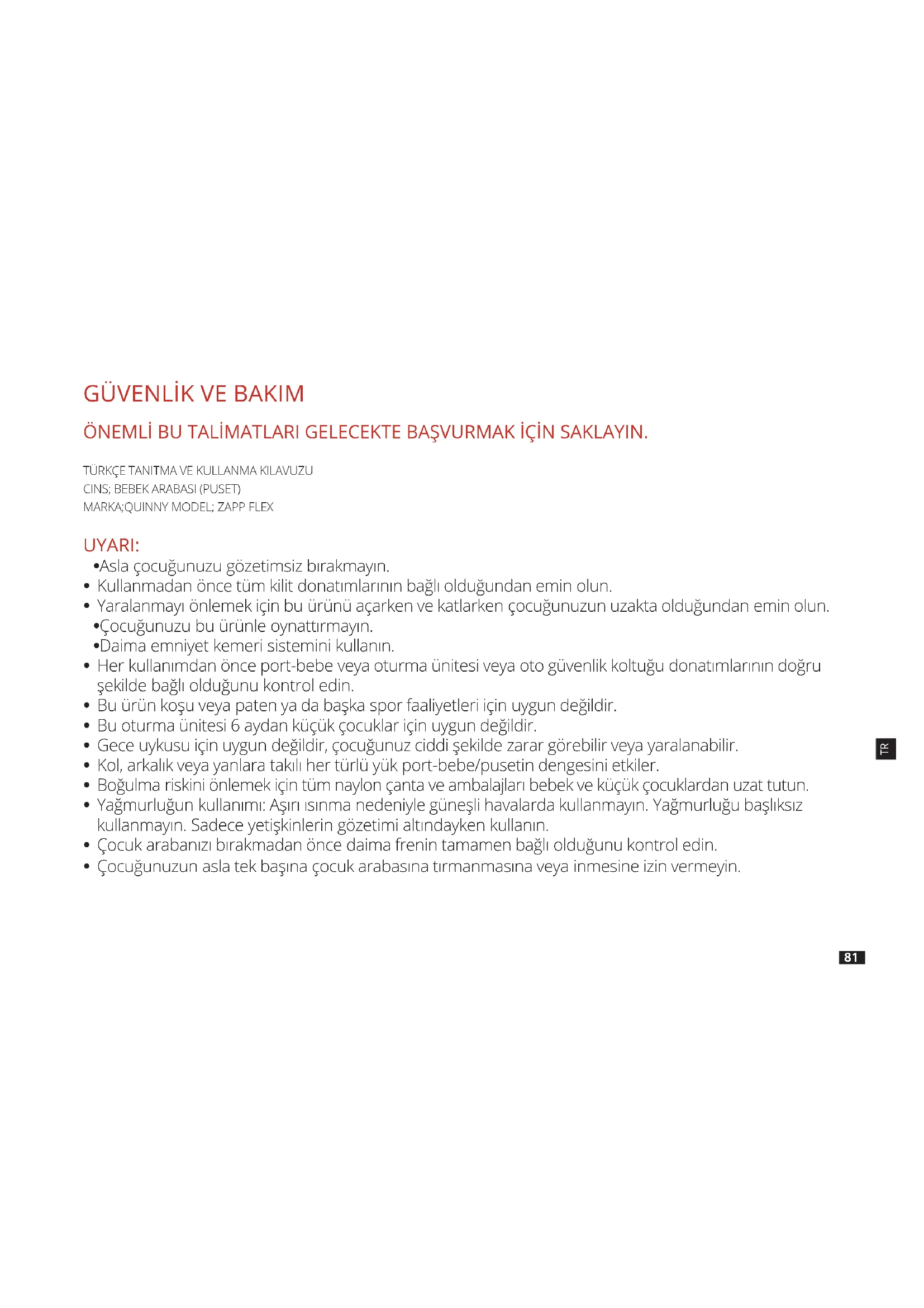 sitemizde yayınlanan durum ve şartlar altında üretici olarak ilk kullanıcılara yönelik gönüllü bir Lifetime Warranty sunmaktadır. Bu Lifetime Warranty hakkından yararlanmak için, web sitemizden kayıt yaptırmanız gerekmektedir. Ömür Boyu Garanti sadece seçilen ülkelerde geçerli bir uygulamadır. (1) Etiketleri veya tanımlama numaralarını kaldıran veya değiştiren tedarikçi veya bayilerden satın alınan ürünler onaysız olarak değerlendirilecektir. Bu ürünlerin orijinalliği doğrulanamadığı için garanti verilmemektedir. İMALATÇI FİRMA: DOREL NETHERLANDS. P.O. Box 6071, 5700 ET Helmond Korendijik 5, 5704 RD Helmond The Netherlands. Tel: 0031 (0)492-845738 - Fax: 0031 (0)492-578003 www.quinny.com TÜRKİYE DİSTRİBÜTÖRÜ (İTHALATÇI FİRMA) & SERVİS İSTASYONLARI: GRUP ELEKTRONİK İÇ VE DIŞ TİC. LTD. ŞTİ. Mimar Sinan Mah. Özgürlük Cad. No: 71/1-2-3-4 Sultanbeyli Istanbul. Tel: 0090 216-5736200 - Fax: 0090 216 573 6209 E-mail: destek@grupbaby.com.tr www.grupbaby.com.tr PT HE ET BG SK SI HR HU TR FI NO SV DA CS RU GR PL PT IT ES NL DE FR EN85 Biztonság és karbantartás FONTOS! ŐRIZZE MEG AZ ALÁBBI ÚTMUTATÓT JÖVŐBELI HIVATKOZÁS CÉLJÁBÓL. FIGYELMEZTETÉS: