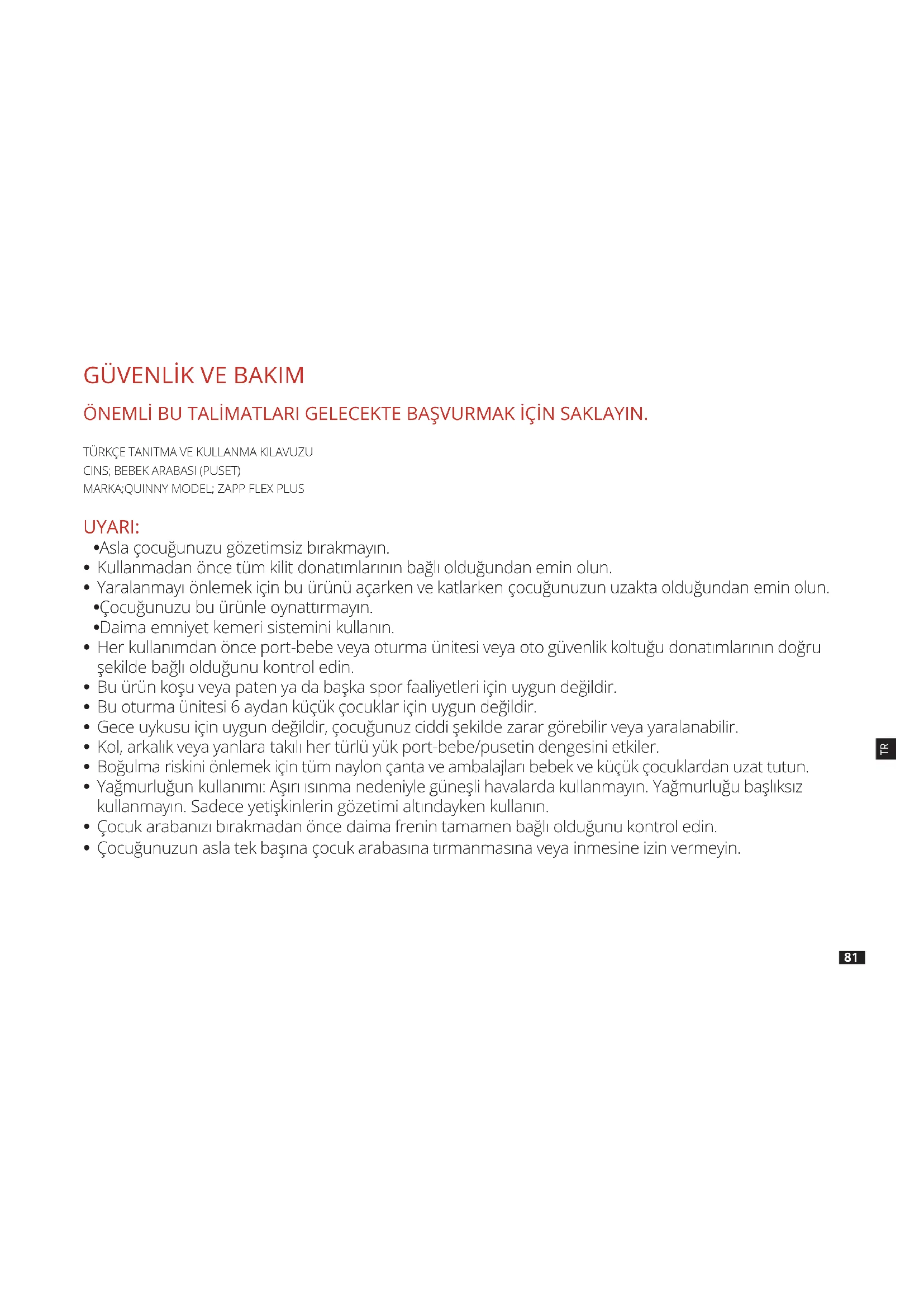 sitemizde yayınlanan durum ve şartlar altında üretici olarak ilk kullanıcılara yönelik gönüllü bir Lifetime Warranty sunmaktadır. Bu Lifetime Warranty hakkından yararlanmak için, web sitemizden kayıt yaptırmanız gerekmektedir. Ömür Boyu Garanti sadece seçilen ülkelerde geçerli bir uygulamadır. (1) Etiketleri veya tanımlama numaralarını kaldıran veya değiştiren tedarikçi veya bayilerden satın alınan ürünler onaysız olarak değerlendirilecektir. Bu ürünlerin orijinalliği doğrulanamadığı için garanti verilmemektedir. İMALATÇI FİRMA: DOREL NETHERLANDS. P.O. Box 6071, 5700 ET Helmond Korendijik 5, 5704 RD Helmond The Netherlands. Tel: 0031 (0)492-845738 - Fax: 0031 (0)492-578003 www.quinny.com TÜRKİYE DİSTRİBÜTÖRÜ (İTHALATÇI FİRMA) & SERVİS İSTASYONLARI: GRUP ELEKTRONİK İÇ VE DIŞ TİC. LTD. ŞTİ. Mimar Sinan Mah. Özgürlük Cad. No: 71/1-2-3-4 Sultanbeyli Istanbul. Tel: 0090 216-5736200 - Fax: 0090 216 573 6209 E-mail: destek@grupbaby.com.tr www.grupbaby.com.tr PT HE ET BG SK SI HR HU TR FI NO SV DA CS RU GR PL PT IT ES NL DE FR EN85 Biztonság és karbantartás FONTOS! ŐRIZZE MEG AZ ALÁBBI ÚTMUTATÓT JÖVŐBELI HIVATKOZÁS CÉLJÁBÓL. FIGYELMEZTETÉS: