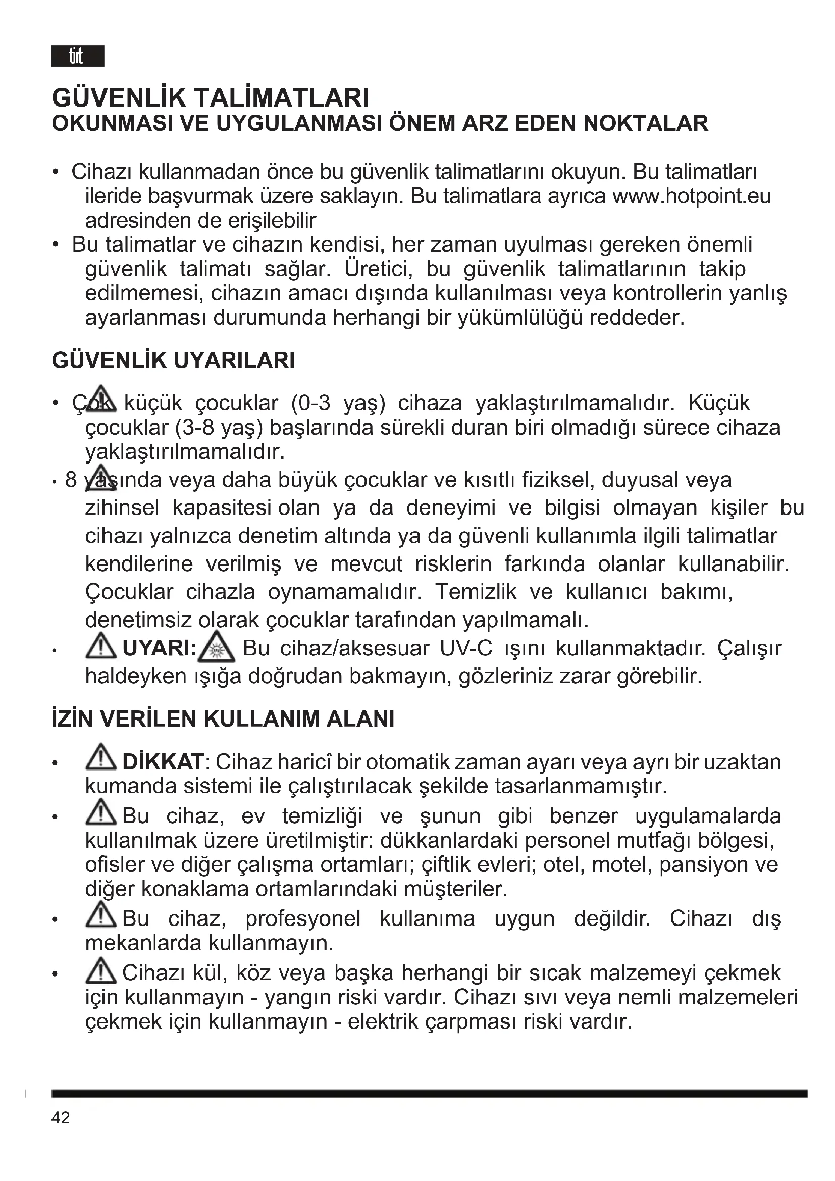- Cihazı kullanmadan önce bu güvenlik talimatlarını okuyun. Bu talimatları ileride başvurmak üzere saklayın. Bu talimatlara ayrıca www.hotpoint.eu adresinden de erişilebilir