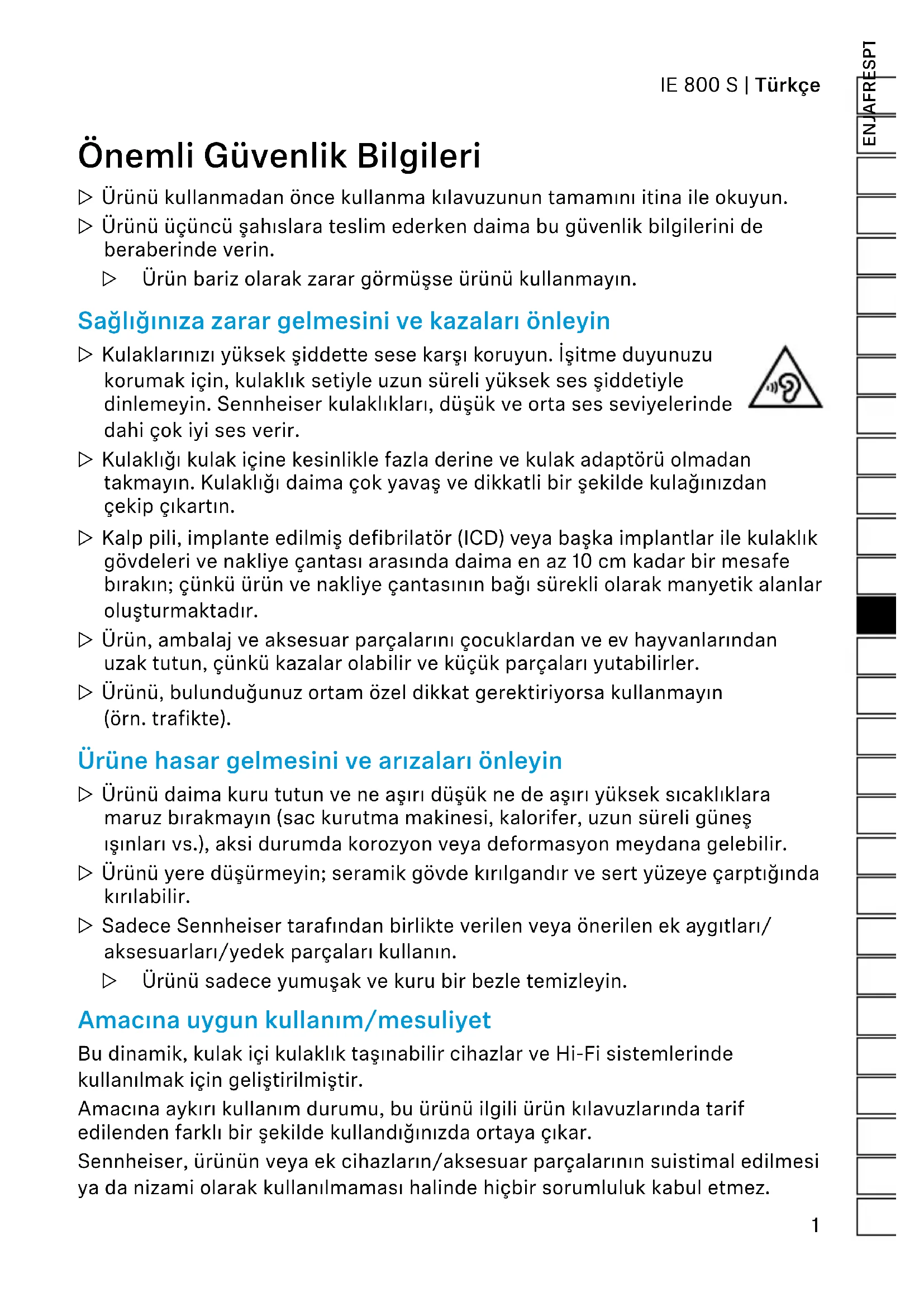 - Dyrektywa WEEE (2012/19/UE) Symbol przekreślonego śmietnika na kółkach, umieszczony na produkcie, baterii / akumulatorze (jeśli dotyczy) i / lub opakowaniu, oznacza, że produktów tych nie należy wyrzucać do pojemnika na zwykłe odpady komunalne po zakończeniu ich eksploatacji, lecz należy je przekazać do specjalnego punktu recyklingu. W przypadlu opakowań prosimy uwzględnić krajoweprzepisy ustawowe dotyczące segregacji odpadów. Dalsze informacje dotyczące recyklingu tych produktów można uzyskać w lo- kalnym urzędzie gminy, komunalnych punktach zbiórki odpadów lub u lokalnego przedstawiciela firmy Sennheiser. Oddzielne zbieranie zużytych urządzeń elektrycznych ielektronicznych, baterii / akumulatorów (jeśli dotyczy) i opakowań służy wspieraniu odzysku i/lub ponow- nego wykorzystania surowców wtórnych oraz minimalizowaniu ich negatywnych skutków, np. ze względu zawartość potencjalnie szkodliwych substancji. W ten sposób przyczyniają się Państwo do ochrony środowiska i zdrowia.1 IE 800 S | Türkçe ENJAFRESPTNLITDASVFIELPLTRRUZHTWKOIDEELVLTCSSKHUROBGSLHR DE Önemli Güvenlik Bilgileri ▷ Ürünü kullanmadan önce kullanma kılavuzunun tamamını itina ile okuyun. ▷ Ürünü üçüncü şahıslara teslim ederken daima bu güvenlik bilgilerini de beraberinde verin. ▷ Ürün bariz olarak zarar görmüşse ürünü kullanmayın. Sağlığınıza zarar gelmesini ve kazaları önleyin ▷ Kulaklarınızı yüksek şiddette sese karşı koruyun. İşitme duyunuzu korumak için, kulaklık setiyle uzun süreli yüksek ses şiddetiyle dinlemeyin. Sennheiser kulaklıkları, düşük ve orta ses seviyelerinde dahi çok iyi ses verir. ▷ Kulaklığı kulak içine kesinlikle fazla derine ve kulak adaptörü olmadan takmayın. Kulaklığı daima çok yavaş ve dikkatli bir şekilde kulağınızdan çekip çıkartın. ▷ Kalp pili, implante edilmiş defibrilatör (ICD) veya başka implantlar ile kulaklık gövdeleri ve nakliye çantası arasında daima en az 10 cm kadar bir mesafe bırakın; çünkü ürün ve nakliye çantasının bağı sürekli olarak manyetik alanlar oluşturmaktadır. ▷ Ürün, ambalaj ve aksesuar parçalarını çocuklardan ve ev hayvanlarından uzak tutun, çünkü kazalar olabilir ve küçük parçaları yutabilirler. ▷ Ürünü, bulunduğunuz ortam özel dikkat gerektiriyorsa kullanmayın (örn. trafikte). Ürüne hasar gelmesini ve arızaları önleyin ▷ Ürünü daima kuru tutun ve ne aşırı düşük ne de aşırı yüksek sıcaklıklara maruz bırakmayın (sac kurutma makinesi, kalorifer, uzun süreli güneş ışınları vs.), aksi durumda korozyon veya deformasyon meydana gelebilir. ▷ Ürünü yere düşürmeyin; seramik gövde kırılgandır ve sert yüzeye çarptığında kırılabilir. ▷ Sadece Sennheiser tarafından birlikte verilen veya önerilen ek aygıtları/ aksesuarları/yedek parçaları kullanın. ▷ Ürünü sadece yumuşak ve kuru bir bezle temizleyin. Amacına uygun kullanım/mesuliyet Bu dinamik, kulak içi kulaklık taşınabilir cihazlar ve Hi-Fi sistemlerinde kullanılmak için geliştirilmiştir. Amacına aykırı kullanım durumu, bu ürünü ilgili ürün kılavuzlarında tarif edilenden farklı bir şekilde kullandığınızda ortaya çıkar. Sennheiser, ürünün veya ek cihazların/aksesuar parçalarının suistimal edilmesi ya da nizami olarak kullanılmaması halinde hiçbir sorumluluk kabul etmez. TR Kullanma kılavuzu2 Türkçe | IE 800 S Teslimat kapsamı 1 Kulak içi kulaklık IE 800 S, kablo uzunluğu yakl. 0,25 m Bağlantı kablosu 1 2,5 mm stereo fiş, simetrik, uzunluk yakl. 1 m 1 3,5 mm stereo fiş, uzunluk yakl. 1 m 1 4,4 mm Pentaconn stereo fiş, simetrik, uzunluk yakl. 1,1 m Kulak adaptörü (çift halinde): 3 Silikon, boy S, M (teslimatta kulaklıklara takılı) ve L 3 Comply™, boy S, M ve L 1 kullanım kılavuzu 1 nakliye çantası 1 mikroelyaflı bez IE 800 S’iniz