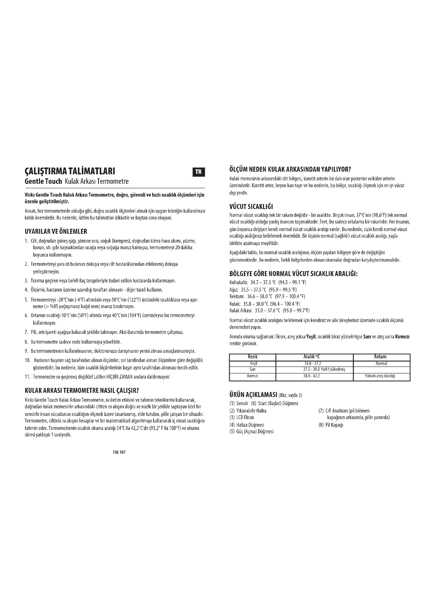 Normal vücut sıcaklığı tek bir rakam değildir - bir aralıktır. Birçok insan, 37°C’nin (98,6°F) tek normal vücut sıcaklığı olduğu yanlış inancını taşımaktadır. Evet, bu sadece ortalama bir rakamdır. Her insanın, gün boyunca değişen kendi normal vücut sıcaklık aralığı vardır. Bu nedenle, sizin kendi normal vücut sıcaklığı aralığınızı belirlemek önemlidir. Bir kişinin normal (sağlıklı) vücut sıcaklık aralığı, yaşla birlikte azalmaya meyillidir. Aşağıdaki tablo, bu normal sıcaklık aralığının, ölçüm yapılan bölgeye göre de değiştiğini göstermektedir. Bu nedenle, farklı bölgelerden alınan okumalar doğrudan karşılaştırılmamalıdır. BÖLGEYE GÖRE NORMAL VÜCUT SICAKLIK ARALIĞI: Koltukaltı: 34.7 – 37.3 °C (94.5 – 99.1 °F) Ağız: 35.5 – 37.5 °C (95.9 – 99.5 °F) Rektum: 36.6 – 38.0 °C (97.9 – 100.4 °F) Kulak: 35.8 – 38.0 °C (96.4 – 100.4 °F) Kulak Arkası: 35.0 – 37.6 °C (95.0 – 99.7°F) Normal vücut sıcaklık aralığını belirlemek için kendiniz ve aile bireyleriniz üzerinde sıcaklık ölçümü denemeleri yapın. Anında okuma sağlamak: Ekran, ateş yoksa Yeşil, sıcaklık biraz yükselmişse Sarı ve ateş varsa Kırmızı renkte görünür. ÜRÜN AÇIKLAMASI (Bkz. sayfa 3) (1) Sensör (6) Start (Başlat) Düğmesi (2) Yıkanabilir Halka (7) C/F Anahtarı (pil bölmesi (3) LCD Ekran kapağının arkasında, pilin yanında) (4) Hafıza Düğmesi (8) Pil Kapağı (5) Güç (Açma) Düğmesi Renk Aralık ºC Anlam Yeşil 34.0 - 37.2 Normal Sarı 37.2 - 38.0 Ha f yükselmiş Kırmızı 38.0 - 42.2 Yüksek ateş olasılığı108 109