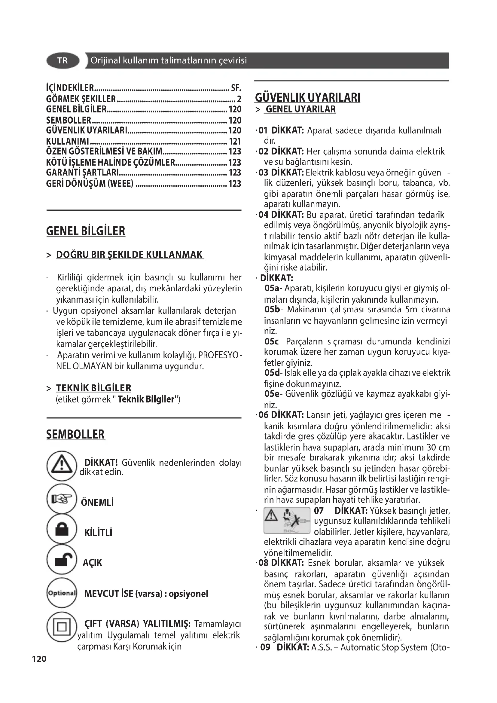 - 09 DİKKAT: A.S.S. – Automatic Stop System (Oto- Orijinal kullanım talimatlarının çevirisi İÇİNDEKİLER ................................................................. SF.
