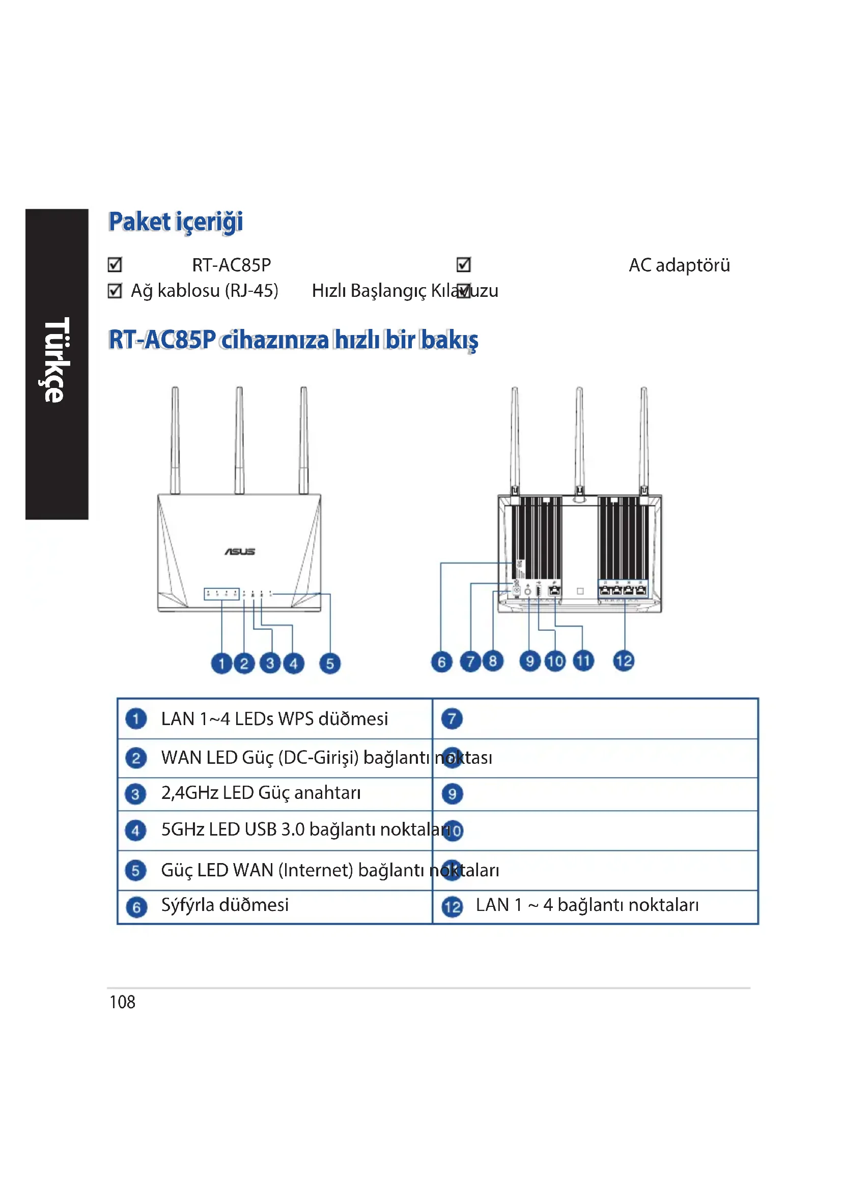 RT-AC85P cihazınıza hızlı bir bakış Paket içeriği RT-AC85P AC adaptörü Ağ kablosu (RJ-45) Hızlı Başlangıç Kılavuzu LAN 1~4 LEDs WPS düðmesi WAN LED Güç (DC-Girişi) bağlantı noktası 2,4GHz LED Güç anahtarı 5GHz LED USB 3.0 bağlantı noktaları Güç LED WAN (Internet) bağlantı noktaları Sýfýrla düðmesi LAN 1 ~ 4 bağlantı noktalarıTürkçe