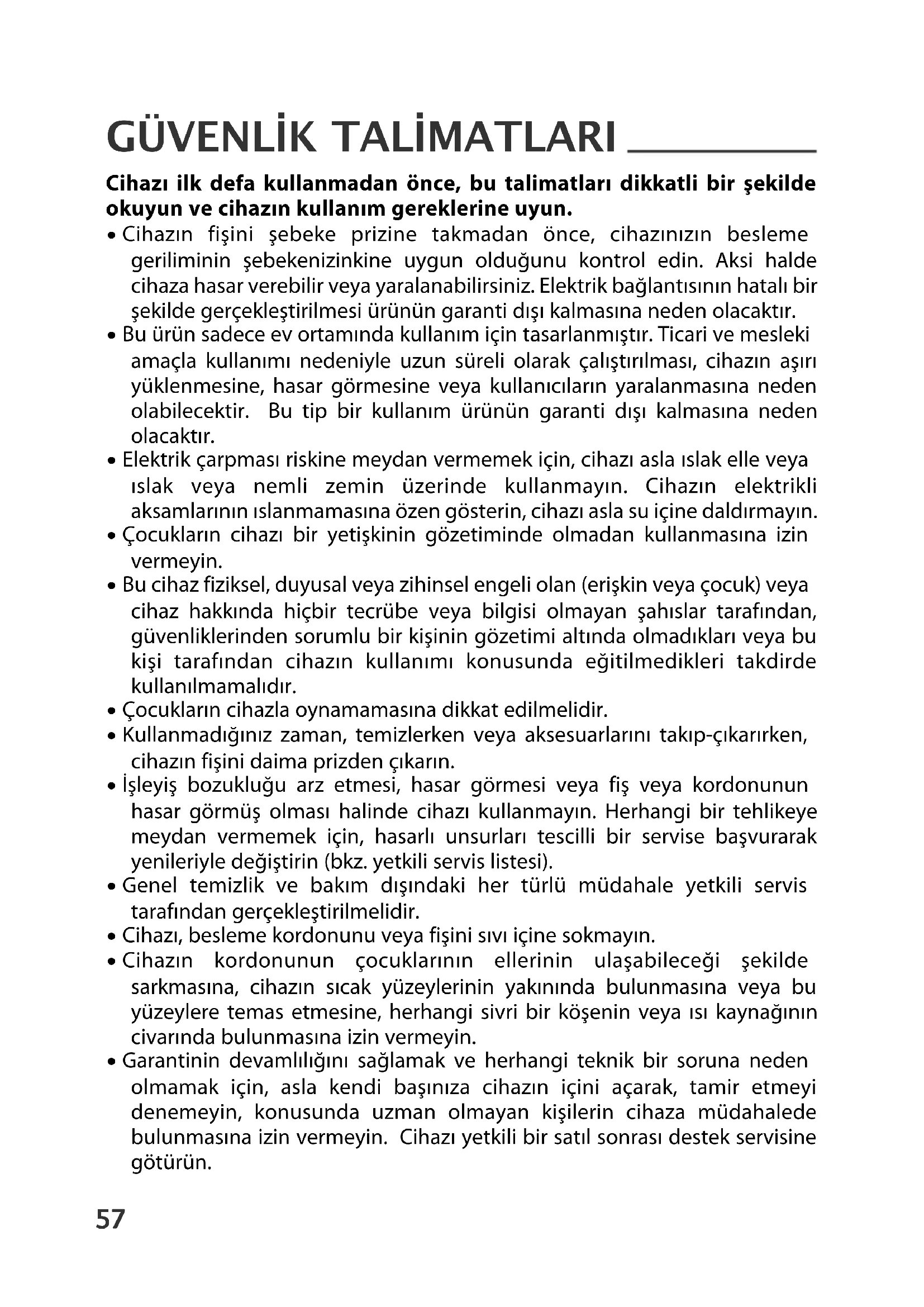 - Bu ürün sadece ev ortamında kullanım için tasarlanmıştır. Ticari ve mesleki amaçla kullanımı nedeniyle uzun süreli olarak çalıştırılması, cihazın aşırı yüklenmesine, hasar görmesine veya kullanıcıların yaralanmasına neden olabilecektir. Bu tip bir kullanım ürünün garanti dışı kalmasına neden olacaktır.