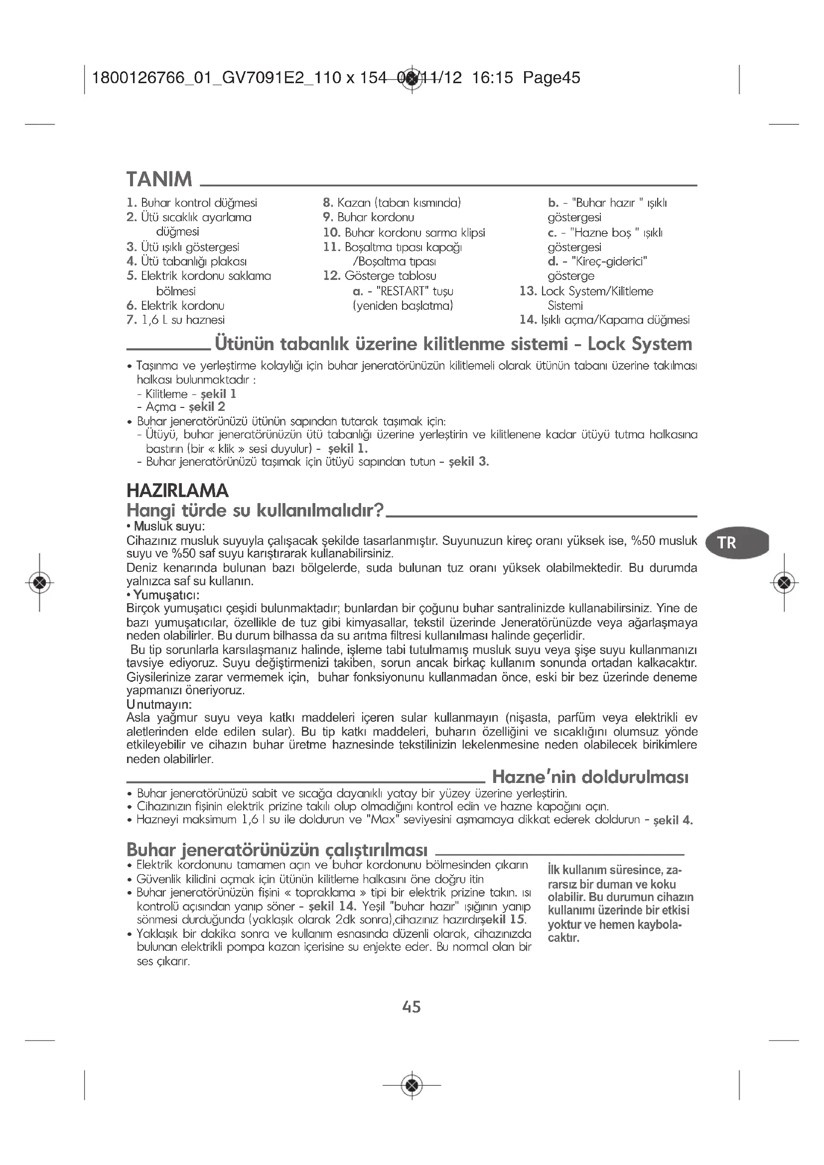 Buhar jeneratörü çalışmıyor veya ütünün ışığı yanmıyor. Cihaz elektriğe bağlı değildir. Cihaz›n fiflinin sa¤lam bir prize tak›lm›fl oldu¤undan ve elektri¤in iletildi¤inden emin olun (›fl›kl› açma/kapama dü¤mesi yan›k olmal›d›r). Tabanın deliklerinden su akıyor. Ütünüz yeterince sıcak olmadığı halde buhar kullanabiliyorsunuz. Su, borular içerisinde birikmiş, çünkü buharı ilk defa kullanıyorsunuz veya bir süredir kul- lanmadınız. Termostat ayarını kontrol edin. Buhar ku- manda düğmesini kullanmadan önce ütü- nün ışığının sönmesini bekleyiniz. Ütü masası kılıfınız suya doymuş çünkü bir buhar jeneratörünün gücüne uygun değil. Çamaşır üzerinde su izleri oluşuyor. Ütü masası kılıfınız suya doymuş çünkü bir buhar merkezinin gücüne uygun değil. Ütü masanızın uygun olmasından emin olun (yoğunlaşmayı önleyen delikli tabla). Tabanın deliklerinden beyaz renkte akıntılar çıkıyor. Kazanınız kireç atıyor çünkü düzenli olarak durulanmamış. Kazanın durulanması (“Jeneratöru!nu!zdeki kireçten kolayca kurtulun” paragrafına bakınız). Tabanın deliklerinden kah- verengi renkte akıntılar çıkıyor ve çamaşırı lekeliyor. Ütüleme suyunda kireç giderici veya yardımcı kimyasal ek ürünler kullanıyorsunuz Hazneye asla hiçbir ürün eklemeyin (bakınız § hangi türde su kullanılmalıdır). Yetkili bir Servis Merkezi ile irtibat kurun. Ütü tabanı kirli veya kahve- rengi renkte ve çamaşırı le- keleyebilir. Çok yüksek bir sıcaklık kullanıyorsunuz. Çamaşırınız yeterince durulanmamış veya onu yıkamadan önce yeni bir kıyafet ütüle- diniz. Nişasta kullanıyorsunuz. Sıcaklık ayarlama ile ilgili önerilerimizi dik- kate alınız. Yeni kıyafetler üzerinde olası sabun veya ki- myasal ürün kalıntılarını gidermek için, çamaşırınızın yeterince durulanmasından emin olun. Nişastayı her zaman ütülenecek yüzün tersinden püskürtün. Az buhar var veya hiç buhar yok. “Su haznesi” kırmızı ışığı yanıp sönüyor. Tabanın sıcaklığı maksimuma ayarlanmış. Hazneyi doldurun ve ışık sönene kadar "RESTART" düğmesi üzerine basın. Buhar jeneratörü normal bir şekilde çalışıyor ama çok sıcak olan buhar kuru ve dolayısıyla görünmüyor. Tıpanın çevresinden buhar çıkıyor. Kapak iyi sıkılmamış. Tapanın contası yıpranmış.Kapağın contası hasarlı. Cihaz arızalı. Kapağı sıkın. Yetkili bir Servis Merkezi ile irtibat kurun. Buhar merkezini kullanmayın ve yetkili bir Servis Merkezi ile irtibat kurun. “Su haznesi” kırmızı ışığı yanıp sönüyor. Yeniden başlatmak için "RESTART" düğme- sine basmasınız. Işık sönene dek, kumanda paneli üzerinde bulunan, yeniden başlatmayı sağlayan “RESTART" tuşuna basın. Cihazın üzerinden buhar veya su çıkıyor. Cihaz arızalı. Buhar jeneratörünüzü kullanmayın ve yet- kili bir Servis Merkezi ile irtibat kurun. “Kireç temizleme” ışığı yanıp sönüyor. “RESTART“ yeniden bafllatma dü¤mesine bas- mad›n›z. Işık sönene dek, kumanda paneli üzerinde bulu- nan, yeniden başlatmayı sağlayan “RESTART" tuşuna basın. BUHAR JENERATÖRÜNÜZLE İLGİLİ BİR SORUN MU VAR? 1800126766_01_GV7091E2_110 x 154 06/11/12 16:15 Page4849