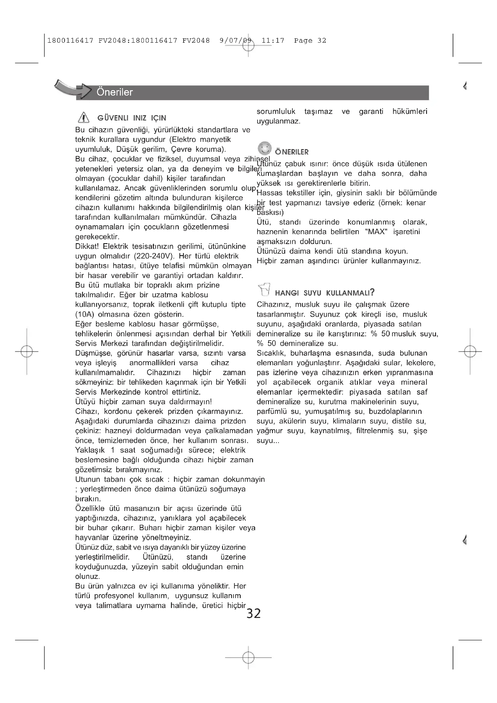NERILER Ütünüz çabuk ısınır: önce düşük ısıda ütülenen kumaşlardan başlayın ve daha sonra, daha yüksek ısı gerektirenlerle bitirin. Hassas tekstiller için, giysinin saklı bir bölümünde bir test yapmanızı tavsiye ederiz (örnek: kenar baskısı) Ütü, standı üzerinde konumlanmış olarak, haznenin kenarında belirtilen "MAX" işaretini aşmaksızın doldurun. Ütünüzü daima kendi ütü standına koyun. Hiçbir zaman aşındırıcı ürünler kullanmayınız. HANGI SUYU KULLANMALI? Cihazınız, musluk suyu ile çalışmak üzere tasarlanmıştır. Suyunuz çok kireçli ise, musluk suyunu, aşağıdaki oranlarda, piyasada satılan demineralize su ile karıştırınız: % 50 musluk suyu, % 50 demineralize su. Sıcaklık, buharlaşma esnasında, suda bulunan elemanları yoğunlaştırır. Aşağıdaki sular, lekelere, pas izlerine veya cihazınızın erken yıpranmasına yol açabilecek organik atıklar veya mineral elemanlar içermektedir: piyasada satılan saf demineralize su, kurutma makinelerinin suyu, parfümlü su, yumuşatılmış su, buzdolaplarının suyu, akülerin suyu, klimaların suyu, distile su, yağmur suyu, kaynatılmış, filtrelenmiş su, şişe suyu... Öneriler 1800116417 FV2048:1800116417 FV2048 9/07/09 11:17 Page 3233