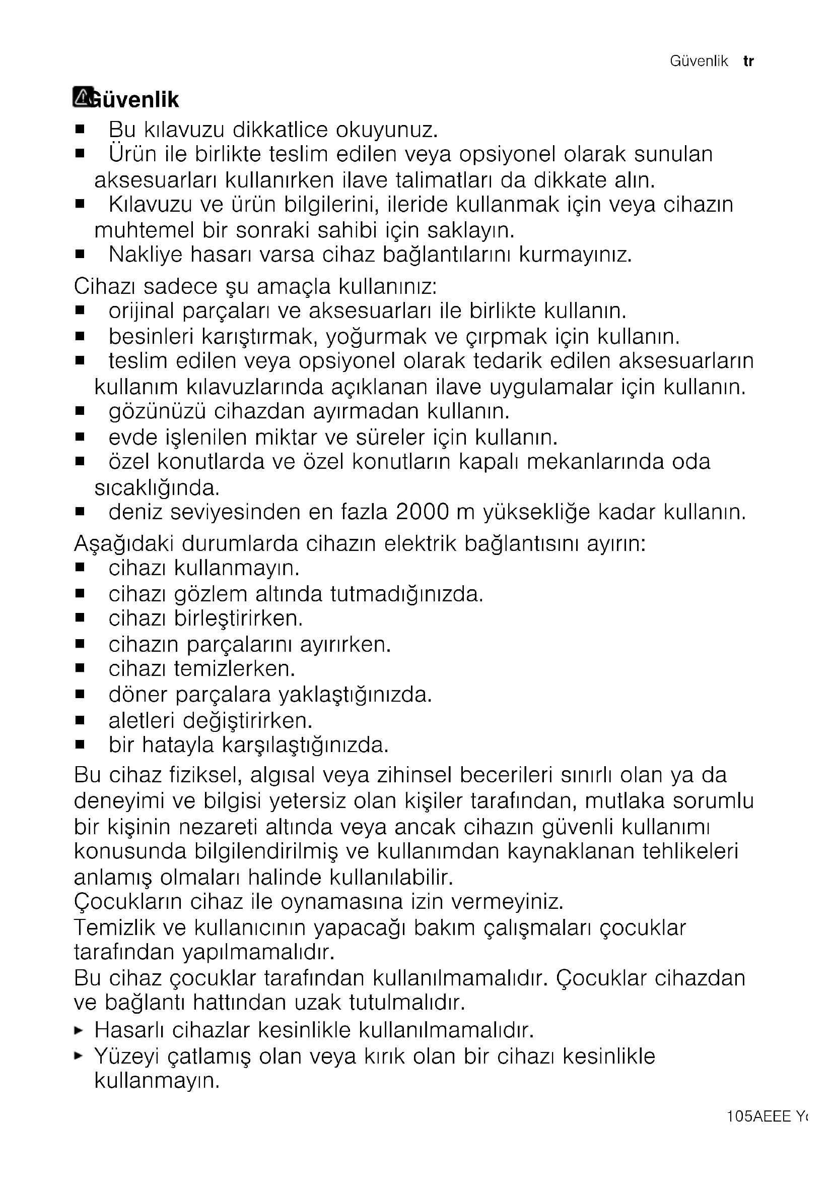 104Güvenlik tr Güvenlik Güvenlik ¡ Bu kılavuzu dikkatlice okuyunuz. ¡ Ürün ile birlikte teslim edilen veya opsiyonel olarak sunulan aksesuarları kullanırken ilave talimatları da dikkate alın. ¡ Kılavuzu ve ürün bilgilerini, ileride kullanmak için veya cihazın muhtemel bir sonraki sahibi için saklayın. ¡ Nakliye hasarı varsa cihaz bağlantılarını kurmayınız. Cihazı sadece şu amaçla kullanınız: ¡ orijinal parçaları ve aksesuarları ile birlikte kullanın. ¡ besinleri karıştırmak, yoğurmak ve çırpmak için kullanın. ¡ teslim edilen veya opsiyonel olarak tedarik edilen aksesuarların kullanım kılavuzlarında açıklanan ilave uygulamalar için kullanın. ¡ gözünüzü cihazdan ayırmadan kullanın. ¡ evde işlenilen miktar ve süreler için kullanın. ¡ özel konutlarda ve özel konutların kapalı mekanlarında oda sıcaklığında. ¡ deniz seviyesinden en fazla 2000m yüksekliğe kadar kullanın. Aşağıdaki durumlarda cihazın elektrik bağlantısını ayırın: ¡ cihazı kullanmayın. ¡ cihazı gözlem altında tutmadığınızda. ¡ cihazı birleştirirken. ¡ cihazın parçalarını ayırırken. ¡ cihazı temizlerken. ¡ döner parçalara yaklaştığınızda. ¡ aletleri değiştirirken. ¡ bir hatayla karşılaştığınızda. Bu cihaz fiziksel, algısal veya zihinsel becerileri sınırlı olan ya da deneyimi ve bilgisi yetersiz olan kişiler tarafından, mutlaka sorumlu bir kişinin nezareti altında veya ancak cihazın güvenli kullanımı konusunda bilgilendirilmiş ve kullanımdan kaynaklanan tehlikeleri anlamış olmaları halinde kullanılabilir. Çocukların cihaz ile oynamasına izin vermeyiniz. Temizlik ve kullanıcının yapacağı bakım çalışmaları çocuklar tarafından yapılmamalıdır. Bu cihaz çocuklar tarafından kullanılmamalıdır. Çocuklar cihazdan ve bağlantı hattından uzak tutulmalıdır. Hasarlı cihazlar kesinlikle kullanılmamalıdır. Yüzeyi çatlamış olan veya kırık olan bir cihazı kesinlikle kullanmayın. 105AEEE Yönetmeliǧine Uygundur. PCB içermez.tr Güvenlik Cihazı elektrik şebekesinden ayırmak için kesinlikle şebeke bağlantı kablosundan tutularak çekilmemelidir. Her zaman şebeke bağlantı kablosunun fişinden tutularak çekilmelidir. Cihaz veya şebeke bağlantı kablosu arızalıysa fiş derhal çekilmeli veya sigorta kutusundan sigorta kapatılmalıdır. Müşteri hizmetlerini arayınız.