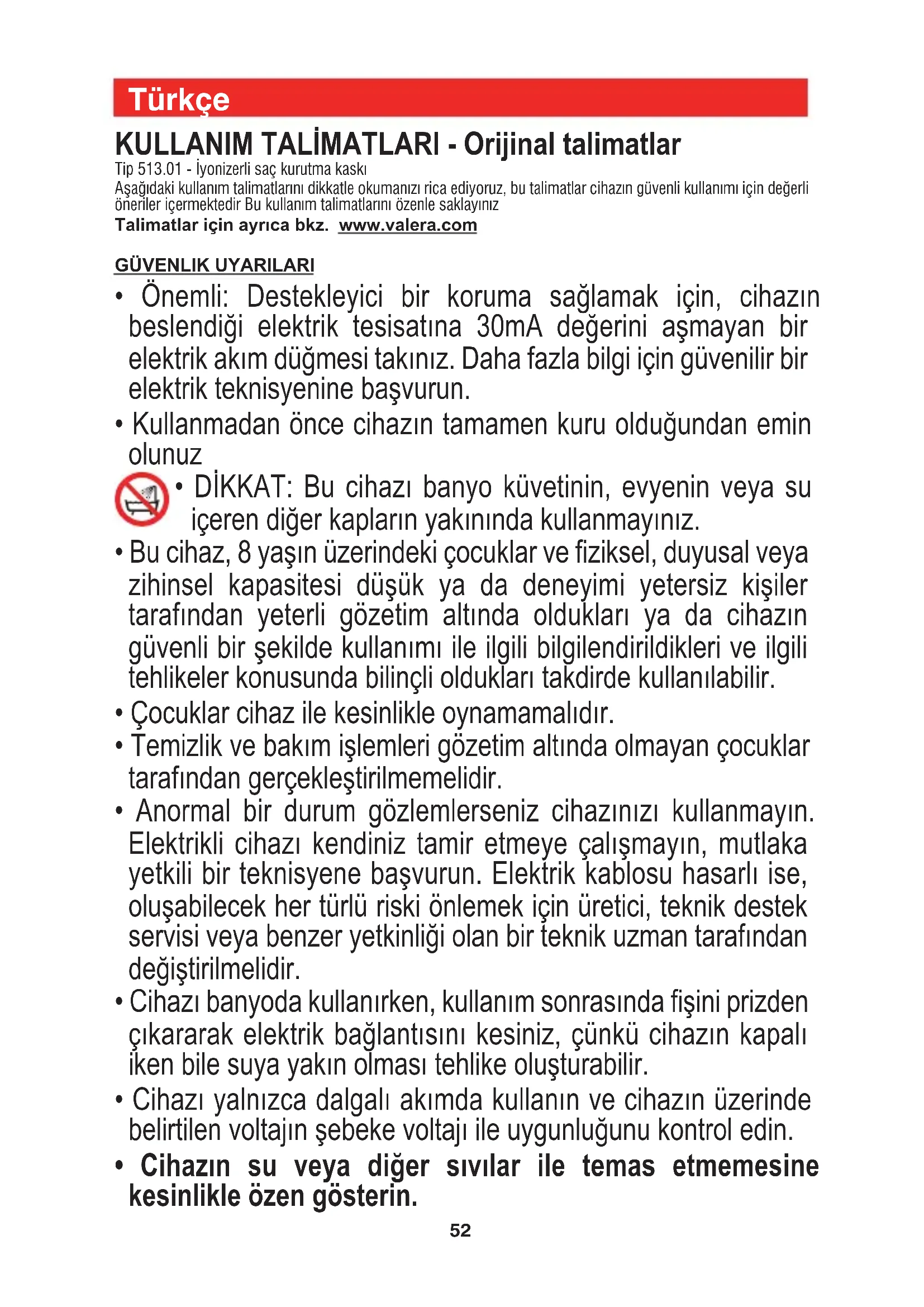 - DİKKAT: Bu cihazı banyo küvetinin, evyenin veya su içeren diğer kapların yakınında kullanmayınız.
