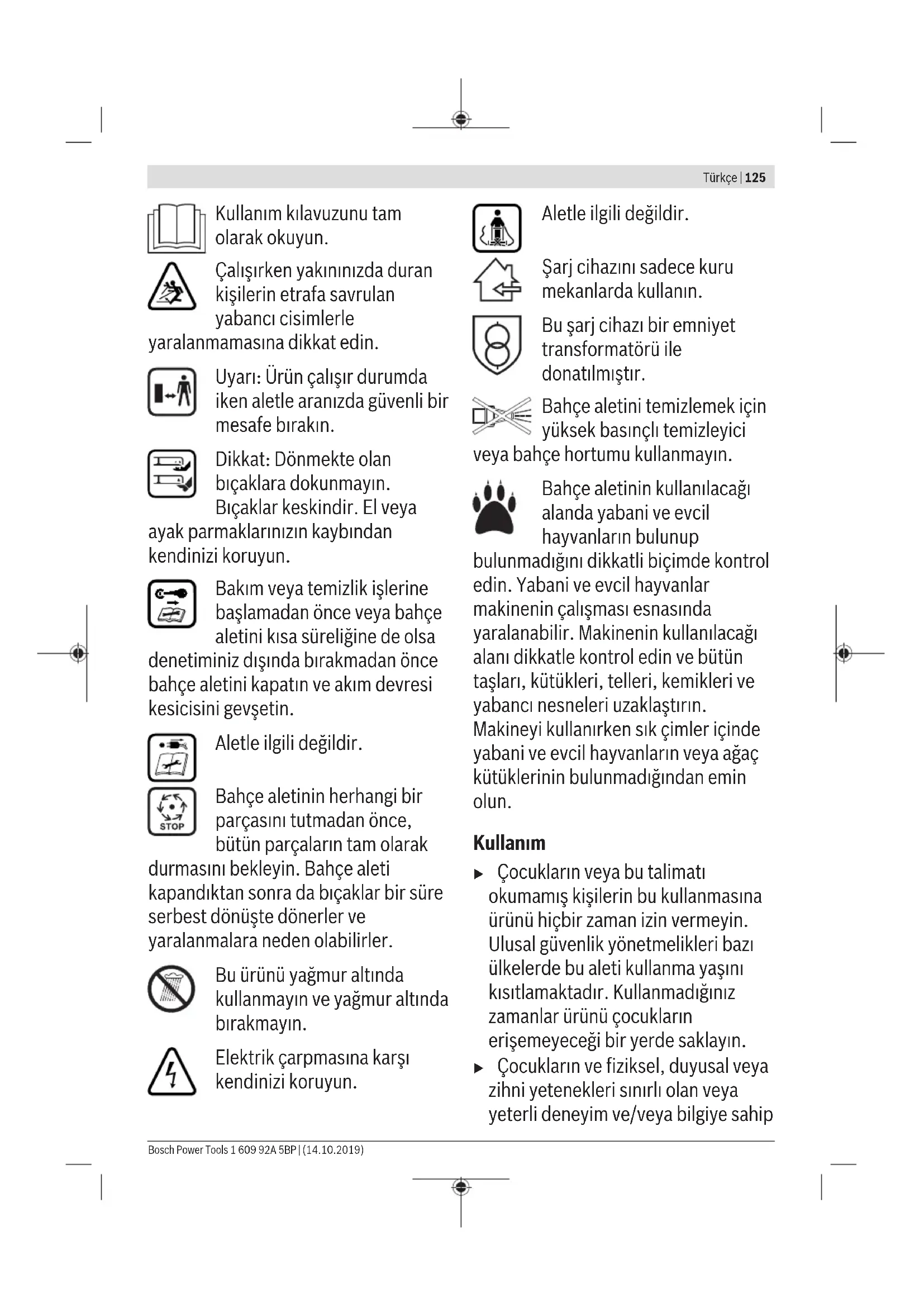 Τα μηχανήματα κήπου, οι μπαταρίες, τα εξαρτήματα και οι συσκευασίες πρέπει να ανακυκλώνονται με τρόπο φιλικό προς το περιβάλλον. Μην ρίξετε τα μηχανήματα κήπου και τις μπαταρίες στα απορρίμματα του σπιτιού σας! Μόνο για χώρες τηςΕΕ: Σύμφωνα με την Κοινοτική Οδηγία 2012/19/EE οι άχρηστες ηλεκτρικές και ηλεκτρονικές συσκευές και σύμφωνα με την Κοινοτική Οδηγία 2006/66/EΚ οι χαλασμένες ή αναλωμένες μπαταρίες πρέπει να συλλέγονται ξεχωριστά για να ανακυκλωθούν με τρόπο φιλικό προς το περιβάλλον. Μπαταρίες/Επαναφορτιζόμενες μπαταρίες: Μπαταρίες ιόντων λιθίου: Παρακαλούμε δώστε προσοχή στο κεφάλαιο Μεταφορά. Türkçe Güvenlik Talimatı Dikkat! Aşağıdaki talimatı dikkatlice okuyun. Kumanda elemanlarının işlevini ve ürünün usulüne uygun olarak kullanılmasını öğrenin. Bu kullanım kılavuzunu ileride başvurmak üzere güvenli bir yerde saklayın. Bahçe aleti, şarj cihazı ve akü üzerindeki sembollerin açıklaması Genel tehlike uyarısı. 1 609 92A 5BP | (14.10.2019) Bosch Power ToolsTürkçe | 125 Kullanım kılavuzunu tam olarak okuyun. Çalışırken yakınınızda duran kişilerin etrafa savrulan yabancı cisimlerle yaralanmamasına dikkat edin. Uyarı: Ürün çalışır durumda iken aletle aranızda güvenli bir mesafe bırakın. Dikkat: Dönmekte olan bıçaklara dokunmayın. Bıçaklar keskindir. El veya ayak parmaklarınızın kaybından kendinizi koruyun. Bakım veya temizlik işlerine başlamadan önce veya bahçe aletini kısa süreliğine de olsa denetiminiz dışında bırakmadan önce bahçe aletini kapatın ve akım devresi kesicisini gevşetin. Aletle ilgili değildir. Bahçe aletinin herhangi bir parçasını tutmadan önce, bütün parçaların tam olarak durmasını bekleyin. Bahçe aleti kapandıktan sonra da bıçaklar bir süre serbest dönüşte dönerler ve yaralanmalara neden olabilirler. Bu ürünü yağmur altında kullanmayın ve yağmur altında bırakmayın. Elektrik çarpmasına karşı kendinizi koruyun. Aletle ilgili değildir. Şarj cihazını sadece kuru mekanlarda kullanın. Bu şarj cihazı bir emniyet transformatörü ile donatılmıştır. Bahçe aletini temizlemek için yüksek basınçlı temizleyici veya bahçe hortumu kullanmayın. Bahçe aletinin kullanılacağı alanda yabani ve evcil hayvanların bulunup bulunmadığını dikkatli biçimde kontrol edin. Yabani ve evcil hayvanlar makinenin çalışması esnasında yaralanabilir. Makinenin kullanılacağı alanı dikkatle kontrol edin ve bütün taşları, kütükleri, telleri, kemikleri ve yabancı nesneleri uzaklaştırın. Makineyi kullanırken sık çimler içinde yabani ve evcil hayvanların veya ağaç kütüklerinin bulunmadığından emin olun. Kullanım u Çocukların veya bu talimatı okumamış kişilerin bu kullanmasına ürünü hiçbir zaman izin vermeyin. Ulusal güvenlik yönetmelikleri bazı ülkelerde bu aleti kullanma yaşını kısıtlamaktadır. Kullanmadığınız zamanlar ürünü çocukların erişemeyeceği bir yerde saklayın. u Çocukların ve fiziksel, duyusal veya zihni yetenekleri sınırlı olan veya yeterli deneyim ve/veya bilgiye sahip Bosch Power Tools 1 609 92A 5BP | (14.10.2019)126 | Türkçe olmayan ve/veya aletin nasıl kullanılacağına dair talimat almayan kişilerin bahçe aletini kullanmasına hiçbir zaman izin vermeyin. u Ürün ile oynamamaları için çocuklara göz kulak olunmalıdır. u Bahçe aletini özellikle çocukların ve evcil hayvanların çok yakınında kullanmayın. u Bu aleti kullananlar başkalarının başına gelebilecek kazalardan veya bunların özel mülkiyetinde bulunan mallarda meydana gelebilecek hasarlardan sorumludur. u Bu ürünü kullanırken açık lastik ayakkabılar veya sandaletler kullanmayın. Sağlam iş ayakkabıları ve uzun pantolon kullanın. u İşleyeceğiniz yüzeyi dikkatli biçimde inceleyin ve taş, dal, tel, kemik ve benzeri yabancı nesneleri temizleyin. u Aleti kullanmaya başlamadan önce daima bıçakların, bıçak cıvatalarının veya kesme modülünün aşınmış veya hasarlı olup olmadığını kontrol edin. Balanssız çalışmayı önlemek için aşınmış veya hasar görmüş bıçakları ve bıçak cıvatalarını her zaman takım halinde değiştirin. u Sadece gün ışığında veya iyi aydınlatma koşullarında biçme yapın. u Elverişsiz hava koşullarında, özellikle fırtına ve sağanak yağış beklenirken çim biçme makinesi ile çalışmayın. u Bahçe aletini mümkün olduğu kadar ıslak çimlerde kullanmayın. u Her zaman sakin çalışın, acele etmeyin. u Bahçe aletini arızalı koruma donanımlarıyla, kapaklarla ve örneğin çarpma emniyeti ve/veya çim tutma selesi gibi emniyet donanımları olmadan kullanmayın. u Kendi sağlığınız açısından koruyucu kulaklık kullanmanızı tavsiye ederiz. u Yorgun veya hastaysanız veya alkol, hap veya aldığınız ilaçların etkisi altındaysanız ürünü kullanmayın. u Meyilli yüzeylerde çalışmak tehlikeli olabilir: –Çok meyilli yüzeylerde biçme yapmayın. –Meyilli yüzeylerde veya ıslak çimlerde yere sağlam basmaya dikkat edin. –Dik yüzeylerde her zaman enine biçme yapın, aşağı yukarı yapmayın. –Dik yerlerde yön değiştirirken özellikle dikkatli olun. u Geriye doğru giderken veya bahçe aletini çekerken çok dikkatli olun. u Biçme yaparken bahçe aletini daima öne doğru itin ve hiçbir zaman kendinize doğru çekmeyin. u Taşımak için bahçe aletini devirdiğinizde, çimle kapl