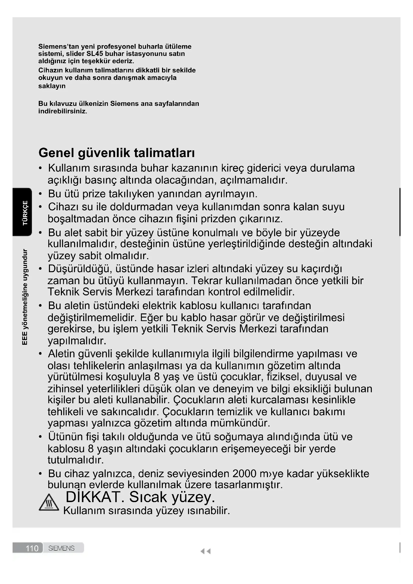 - Bu cihaz yalnızca, deniz seviyesinden 2000 m›ye kadar yükseklikte bulunan evlerde kullanılmak üzere tasarlanmıştır. DİKKAT. Sıcak yüzey. Kullanım sırasında yüzey ısınabilir. EEE yönetmeliğine uygundur111 S I E M E N S
