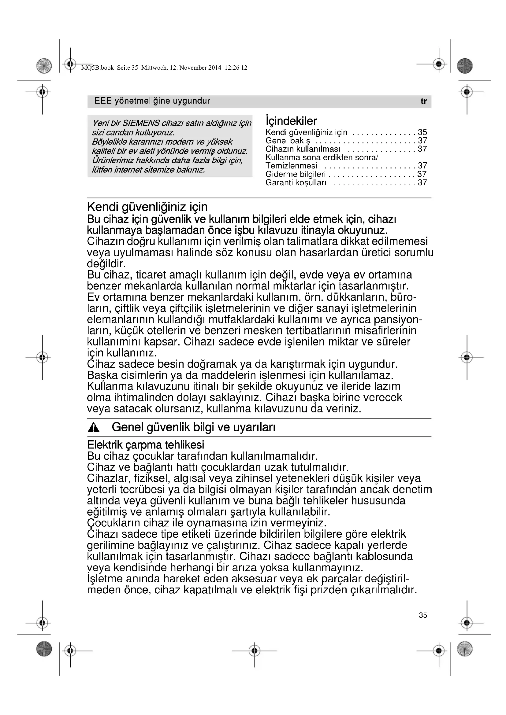 - Garanti koşulları Kendi güvenliğiniz için Bu cihaz için güvenlik ve kullanım bilgileri elde etmek için, cihazı kullanmaya başlamadan önce işbu kılavuzu itinayla okuyunuz. Cihazın doğru kullanımı için verilmiş olan talimatlara dikkat edilmemesi veya uyulmaması halinde söz konusu olan hasarlardan üretici sorumlu değildir. Bu cihaz, ticaret amaçlı kullanım için değil, evde veya ev ortamına benzer mekanlarda kullanılan normal miktarlar için tasarlanmıştır. Ev ortamına benzer mekanlardaki kullanım, örn. dükkanların, büro- ların, çiftlik veya çiftçilik işletmelerinin ve diğer sanayi işletmelerinin elemanlarının kullandığı mutfaklardaki kullanımı ve ayrıca pansiyon- ların, küçük otellerin ve benzeri mesken tertibatlarının misafirlerinin kullanımını kapsar. Cihazı sadece evde işlenilen miktar ve süreler için kullanınız. Cihaz sadece besin doğramak ya da karıştırmak için uygundur. Başka cisimlerin ya da maddelerin işlenmesi için kullanılamaz. Kullanma kılavuzunu itinalı bir şekilde okuyunuz ve ileride lazım olma ihtimalinden dolayı saklayınız. Cihazı başka birine verecek veya satacak olursanız, kullanma kılavuzunu da veriniz. , Genel güvenlik bilgi ve uyarıları Elektrik çarpma tehlikesi Bu cihaz çocuklar tarafından kullanılmamalıdır. Cihaz ve bağlantı hattı çocuklardan uzak tutulmalıdır. Cihazlar, fiziksel, algısal veya zihinsel yetenekleri düşük kişiler veya yeterli tecrübesi ya da bilgisi olmayan kişiler tarafından ancak denetim altında veya güvenli kullanım ve buna bağlı tehlikeler hususunda eğitilmiş ve anlamış olmaları şartıyla kullanılabilir. Çocukların cihaz ile oynamasına izin vermeyiniz. Cihazı sadece tipe etiketi üzerinde bildirilen bilgilere göre elektrik gerilimine bağlayınız ve çalıştırınız. Cihaz sadece kapalı yerlerde kullanılmak için tasarlanmıştır. Cihazı sadece bağlantı kablosunda veya kendisinde herhangi bir arıza yoksa kullanmayınız. İşletme anında hareket eden aksesuar veya ek parçalar değiştiril- meden önce, cihaz kapatılmalı ve elektrik fişi prizden çıkarılmalıdır. Yeni bir SIEMENS cihazı satın aldığınız için sizi candan kutluyoruz. Böylelikle kararınızı modern ve yüksek kaliteli bir ev aleti yönünde vermiş oldunuz. Ürünlerimiz hakkında daha fazla bilgi için, lütfen internet sitemize bakınız. EEE yönetmeliğine uygundur p. 37