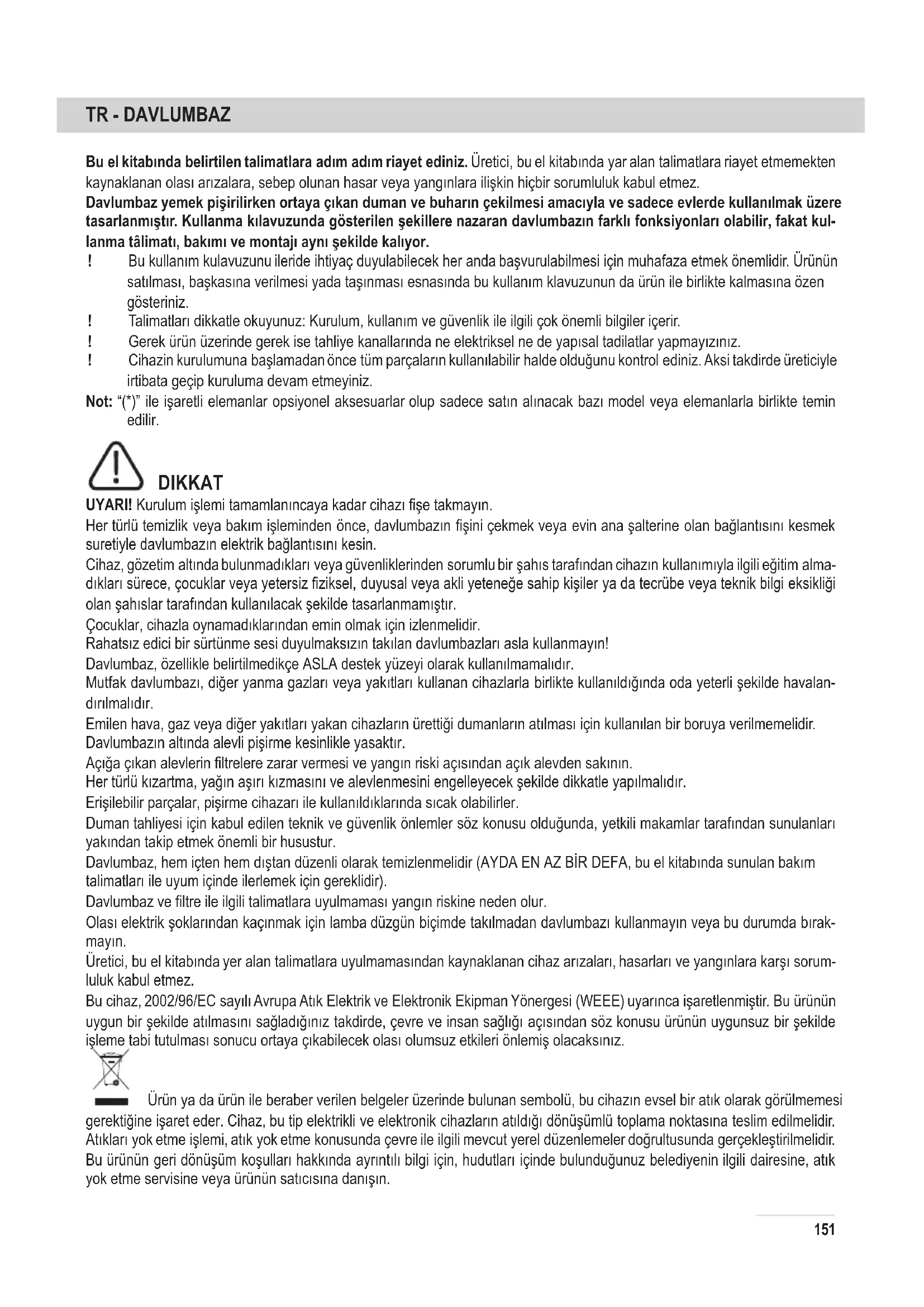 Bu el kitabında belirtilen talimatlara adım adım riayet ediniz. Üretici, bu el kitabında yar alan talimatlara riayet etmemekten kaynaklanan olası arızalara, sebep olunan hasar veya yangınlara ilişkin hiçbir sorumluluk kabul etmez. Davlumbaz yemek pişirilirken ortaya çıkan duman ve buharın çekilmesi amacıyla ve sadece evlerde kullanılmak üzere tasarlanmıştır. Kullanma kılavuzunda gösterilen şekillere nazaran davlumbazın farklı fonksiyonları olabilir, fakat kul- lanma tâlimatı, bakımı ve montajı aynı şekilde kalıyor. ! Bu kullanım kulavuzunu ileride ihtiyaç duyulabilecek her anda başvurulabilmesi için muhafaza etmek önemlidir. Ürünün satılması, başkasına verilmesi yada taşınması esnasında bu kullanım klavuzunun da ürün ile birlikte kalmasına özen gösteriniz. ! Talimatları dikkatle okuyunuz: Kurulum, kullanım ve güvenlik ile ilgili çok önemli bilgiler içerir. ! Gerek ürün üzerinde gerek ise tahliye kanallarında ne elektriksel ne de yapısal tadilatlar yapmayızınız. ! Cihazin kurulumuna başlamadan önce tüm parçaların kullanılabilir halde olduğunu kontrol ediniz. Aksi takdirde üreticiyle irtibata geçip kuruluma devam etmeyiniz. Not: “(*)” ile işaretli elemanlar opsiyonel aksesuarlar olup sadece satın alınacak bazı model veya elemanlarla birlikte temin edilir. DIKKAT UYARI! Kurulum işlemi tamamlanıncaya kadar cihazı şe takmayın. Her türlü temizlik veya bakım işleminden önce, davlumbazın şini çekmek veya evin ana şalterine olan bağlantısını kesmek suretiyle davlumbazın elektrik bağlantısını kesin. Cihaz, gözetim altında bulunmadıkları veya güvenliklerinden sorumlu bir şahıs tarafından cihazın kullanımıyla ilgili eğitim alma- dıkları sürece, çocuklar veya yetersiz ziksel, duyusal veya akli yeteneğe sahip kişiler ya da tecrübe veya teknik bilgi eksikliği olan şahıslar tarafından kullanılacak şekilde tasarlanmamıştır. Çocuklar, cihazla oynamadıklarından emin olmak için izlenmelidir. Rahatsız edici bir sürtünme sesi duyulmaksızın takılan davlumbazları asla kullanmayın! Davlumbaz, özellikle belirtilmedikçe ASLA destek yüzeyi olarak kullanılmamalıdır. Mutfak davlumbazı, diğer yanma gazları veya yakıtları kullanan cihazlarla birlikte kullanıldığında oda yeterli şekilde havalan- dırılmalıdır. Emilen hava, gaz veya diğer yakıtları yakan cihazların ürettiği dumanların atılması için kullanılan bir boruya verilmemelidir. Davlumbazın altında alevli pişirme kesinlikle yasaktır. Açığa çıkan alevlerin ltrelere zarar vermesi ve yangın riski açısından açık alevden sakının. Her türlü kızartma, yağın aşırı kızmasını ve alevlenmesini engelleyecek şekilde dikkatle yapılmalıdır. Erişilebilir parçalar, pişirme cihazarı ile kullanıldıklarında sıcak olabilirler. Duman tahliyesi için kabul edilen teknik ve güvenlik önlemler söz konusu olduğunda, yetkili makamlar tarafından sunulanları yakından takip etmek önemli bir husustur. Davlumbaz, hem içten hem dıştan düzenli olarak temizlenmelidir (AYDA EN AZ BİR DEFA, bu el kitabında sunulan bakım talimatları ile uyum içinde ilerlemek için gereklidir). Davlumbaz ve ltre ile ilgili talimatlara uyulmaması yangın riskine neden olur. Olası elektrik şoklarından kaçınmak için lamba düzgün biçimde takılmadan davlumbazı kullanmayın veya bu durumda bırak- mayın. Üretici, bu el kitabında yer alan talimatlara uyulmamasından kaynaklanan cihaz arızaları, hasarları ve yangınlara karşı sorum- luluk kabul etmez. Bu cihaz, 2002/96/EC sayılı Avrupa Atık Elektrik ve Elektronik Ekipman Yönergesi (WEEE) uyarınca işaretlenmiştir. Bu ürünün uygun bir şekilde atılmasını sağladığınız takdirde, çevre ve insan sağlığı açısından söz konusu ürünün uygunsuz bir şekilde işleme tabi tutulması sonucu ortaya çıkabilecek olası olumsuz etkileri önlemiş olacaksınız. Ürün ya da ürün ile beraber verilen belgeler üzerinde bulunan sembolü, bu cihazın evsel bir atık olarak görülmemesi gerektiğine işaret eder. Cihaz, bu tip elektrikli ve elektronik cihazların atıldığı dönüşümlü toplama noktasına teslim edilmelidir. Atıkları yok etme işlemi, atık yok etme konusunda çevre ile ilgili mevcut yerel düzenlemeler doğrultusunda gerçekleştirilmelidir. Bu ürünün geri dönüşüm koşulları hakkında ayrıntılı bilgi için, hudutları içinde bulunduğunuz belediyenin ilgili dairesine, atık yok etme servisine veya ürünün satıcısına danışın.152 Bu aygıt aşağıda belirtilenlere göre tasarlanmış, test edilmiş ve üretilmiştir: