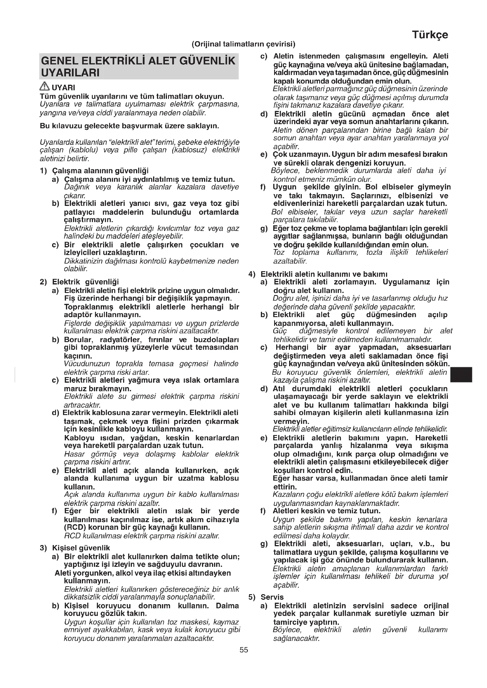 a) Elektrikli aletinizin servisini sadece orijinal yedek parçalar kullanmak suretiyle uzman bir tamirciye yaptırın. Böylece, elektrikli aletin güvenli kullanımı sağlanacaktır. GENEL ELEKTRİKLİ ALET GÜVENLİK UYARILARI UYARI Tüm güvenlik uyarılarını ve tüm talimatları okuyun. Uyarılara ve talimatlara uyulmaması elektrik çarpmasına, yangına ve/veya ciddi yaralanmaya neden olabilir. Bu kılavuzu gelecekte başvurmak üzere saklayın. Uyarılarda kullanılan “elektrikli alet” terimi, şebeke elektriğiyle çalışan (kablolu) veya pille çalışan (kablosuz) elektrikli aletinizi belirtir.