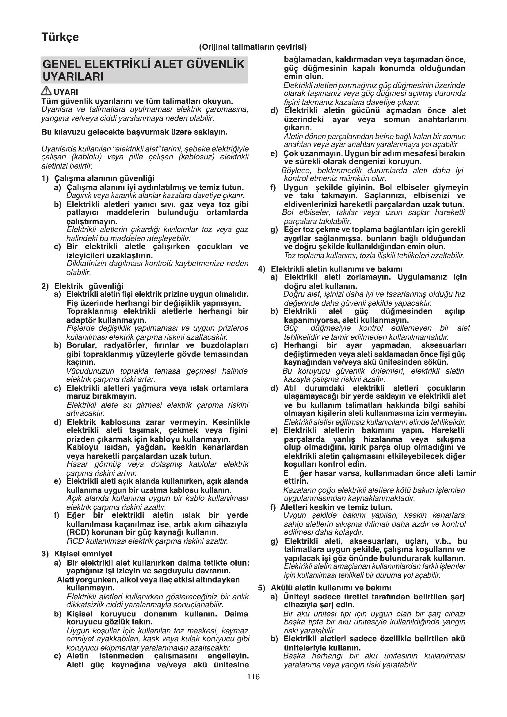 a) Üniteyi sadece üretici tarafından belirtilen şarj cihazıyla şarj edin. Bir akü ünitesi tipi için uygun olan bir şarj cihazı başka tipte bir akü ünitesiyle kullanıldığında yangın riski yaratabilir. b) Elektrikli aletleri sadece özellikle belirtilen akü üniteleriyle kullanın. Başka herhangi bir akü ünitesinin kullanılması yaralanma veya yangın riski yaratabilir. GENEL ELEKTRİKLİ ALET GÜVENLİK UYARILARI UYARI Tüm güvenlik uyarılarını ve tüm talimatları okuyun. Uyarılara ve talimatlara uyulmaması elektrik çarpmasına, yangına ve/veya ciddi yaralanmaya neden olabilir. Bu kılavuzu gelecekte başvurmak üzere saklayın. Uyarılarda kullanılan “elektrikli alet” terimi, şebeke elektriğiyle çalışan (kablolu) veya pille çalışan (kablosuz) elektrikli aletinizi belirtir.
