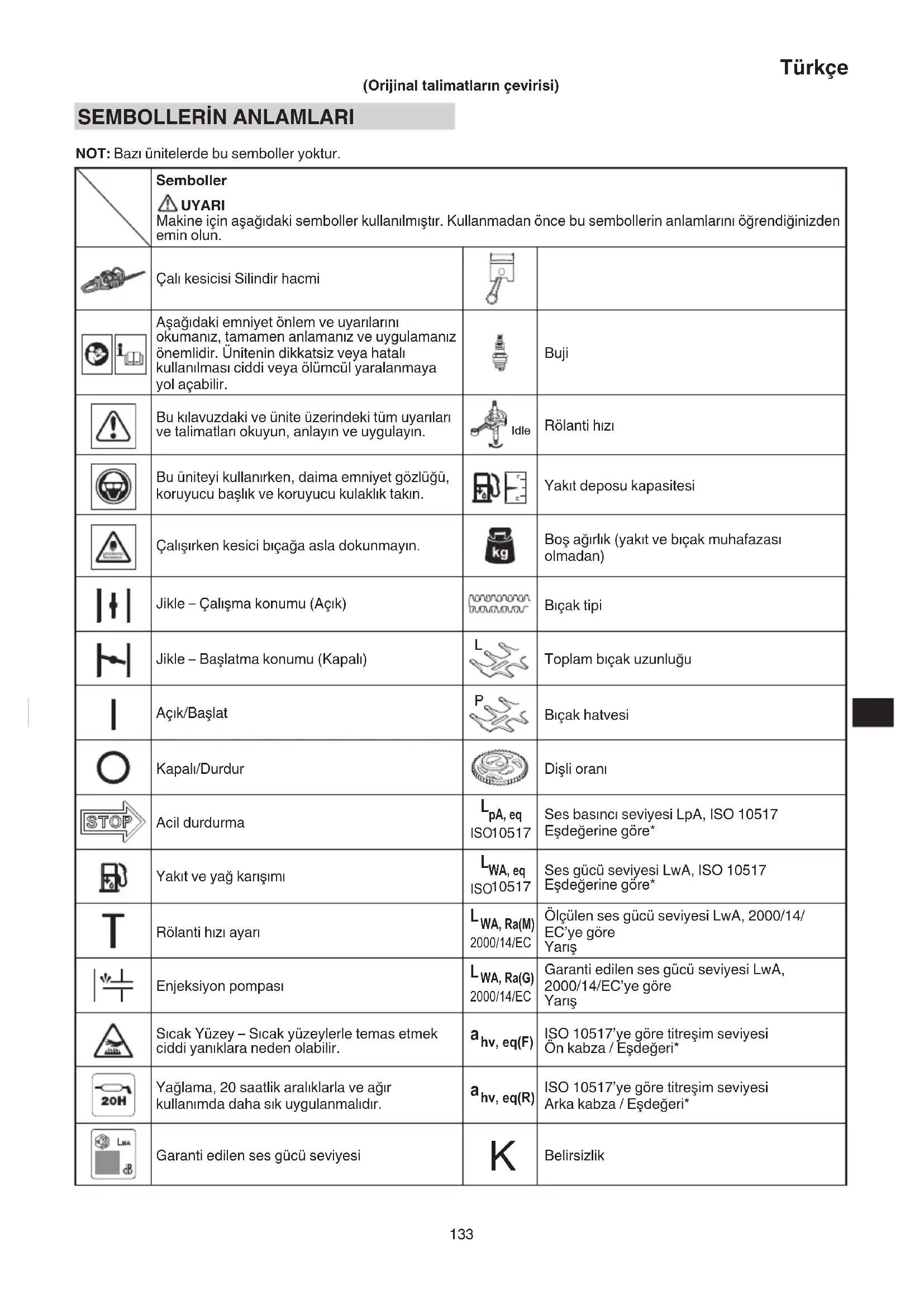 NOT: Bazı ünitelerde bu semboller yoktur. Semboller UYARI Makine için aşağıdaki semboller kullanılmıştır. Kullanmadan önce bu sembollerin anlamlarını öğrendiğinizden emin olun. Çalı kesicisi Silindir hacmi Aşağıdaki emniyet önlem ve uyarılarını okumanız, tamamen anlamanız ve uygulamanız önemlidir. Ünitenin dikkatsiz veya hatalı kullanılması ciddi veya ölümcül yaralanmaya yol açabilir. Buji Bu kılavuzdaki ve ünite üzerindeki tüm uyarıları ve talimatları okuyun, anlayın ve uygulayın. Idle Rölanti hızı Bu üniteyi kullanırken, daima emniyet gözlüğü, koruyucu başlık ve koruyucu kulaklık takın. Yakıt deposu kapasitesi Çalışırken kesici bıçağa asla dokunmayın. Boş ağırlık (yakıt ve bıçak muhafazası olmadan) Jikle – Çalışma konumu (Açık) Bıçak tipi Jikle – Başlatma konumu (Kapalı)