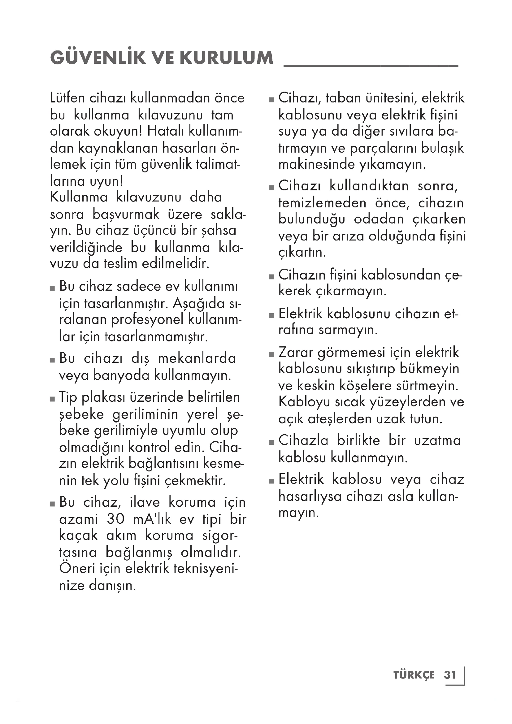 Lütfen cihazı kullanmadan önce bu kullanma kılavuzunu tam olarak okuyun! Hatalı kullanım- dan kaynaklanan hasarları ön- lemek için tüm güvenlik talimat- larına uyun! Kullanma kılavuzunu daha sonra başvurmak üzere sakla- yın. Bu cihaz üçüncü bir şahsa verildiğinde bu kullanma kıla- vuzu da teslim edilmelidir.
