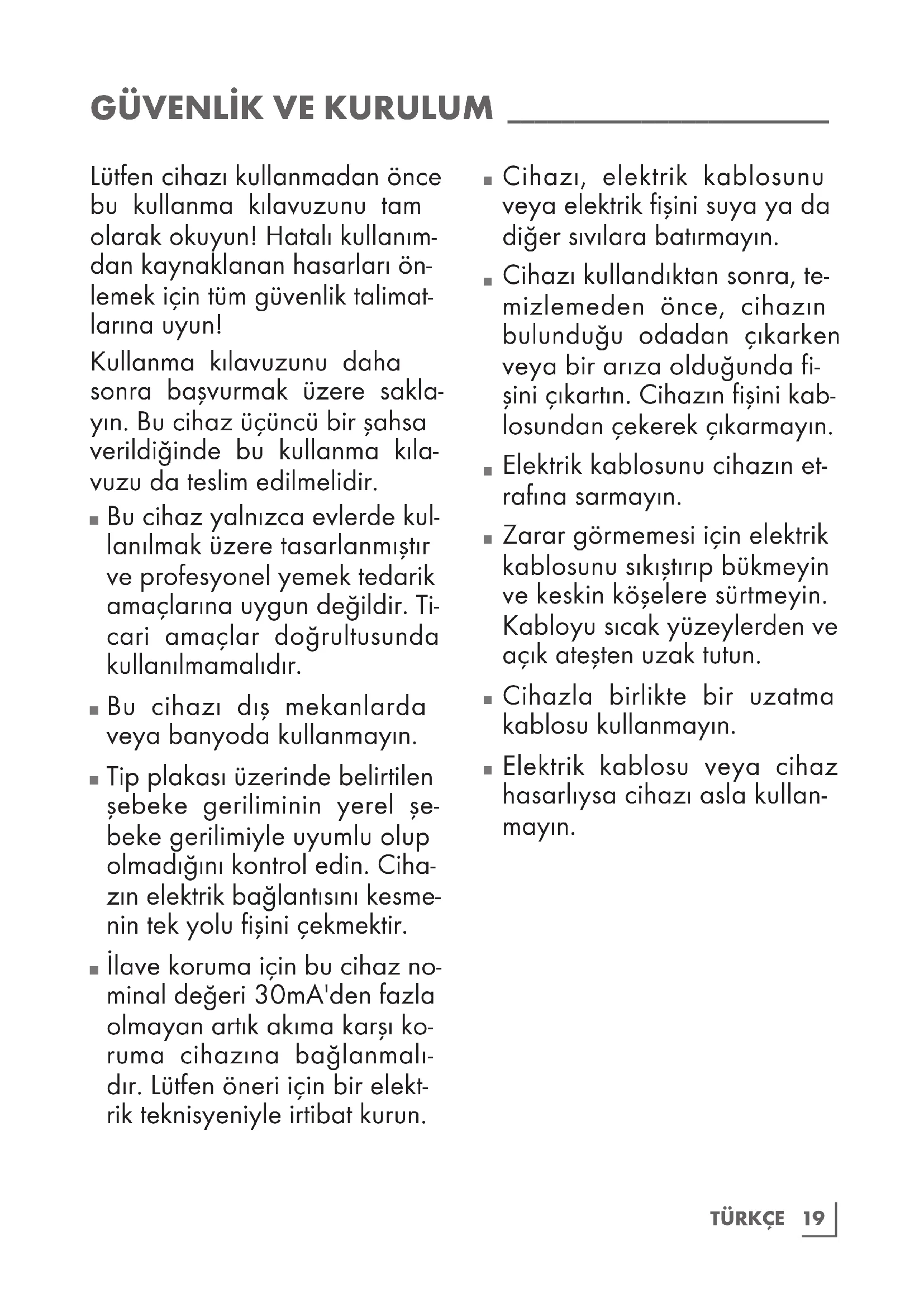 Lütfen cihazı kullanmadan önce bu kullanma kılavuzunu tam olarak okuyun! Hatalı kullanım- dan kaynaklanan hasarları ön- lemek için tüm güvenlik talimat- larına uyun! Kullanma kılavuzunu daha sonra başvurmak üzere sakla- yın. Bu cihaz üçüncü bir şahsa verildiğinde bu kullanma kıla- vuzu da teslim edilmelidir.