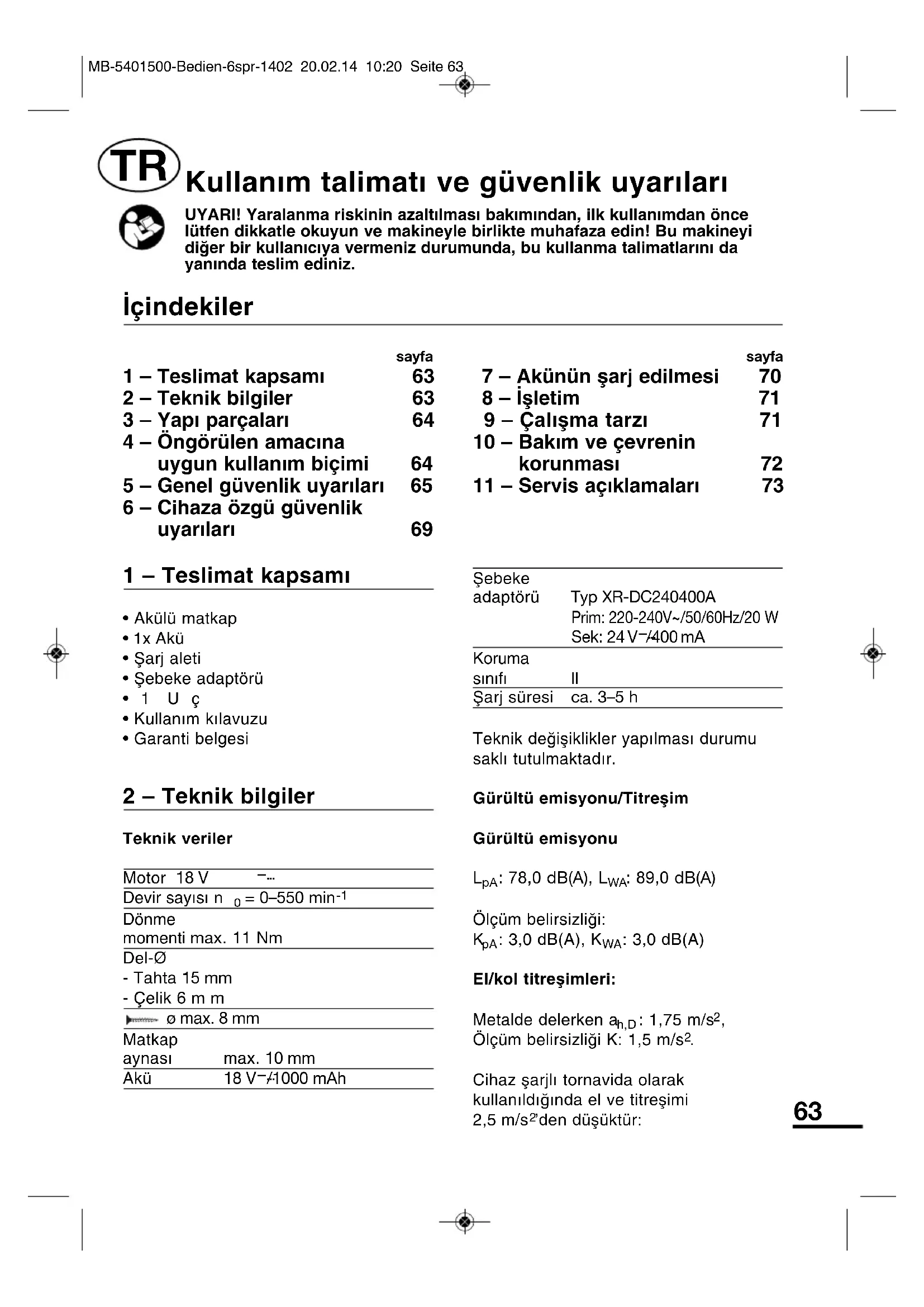 Cihaz μarjl∂ tornavida olarakkullan∂ld∂π∂nda el ve titreμimi2,5 m/s ’den düμüktür: Kullanım talimat∂ ve güvenlik uyarıları UYARI! Yaralanma riskinin azalt∂lmas∂ bak∂m∂ndan, ilk kullan∂mdan öncelütfen dikkatle okuyun ve makineyle birlikte muhafaza edin! Bu makineyidiπer bir kullan∂c∂ya vermeniz durumunda, bu kullanma talimatlar∂n∂ dayan∂nda teslim ediniz. sayfa 1 – Teslimat kapsam∂ 63 2 – Teknik bilgiler 63 3 – Yap∂ parçalar∂ 64 4 – Öngörülen amac∂na uygun kullan∂m biçimi 64 5 – Genel güvenlik uyar∂lar∂ 65 6 – Cihaza özgü güvenlik uyar∂lar∂ 69 sayfa 7 – Akünün μarj edilmesi 70 8 – ∑μletim 71 9 – Çal∂μma tarz∂ 71 10 – Bak∂m ve çevrenin korunmas∂ 72 11 – Servis aç∂klamalar∂ 73 ∑çindekiler MB-5401500-Bedien-6spr-1402 20.02.14 10:20 Seite 6364 Ses/Titreμim bilgisi Ölçüm deπerleri z EN 60745-1 uyar∂nca tespit edilmiμtir. Belirtilen sal∂n∂m emisyon deπeri, sat∂h taμlamada tespit edilmiμtir. Baμka tür uygulamalarda sal∂n∂m emisyon deπeri bundan sapma gösterebilir. Belirtilen sal∂n∂m emisyon deπeri normland∂r∂lm∂μ bir test yöntemine göre ölçülmüμ olup, elektrikli bir aletin bir baμka aletle k∂yaslanmas∂nda kullan∂labilir. Belirtilen sal∂n∂m emisyon deπeri, muhtemel bir olumsuz etki için ilk tahmin olarak da kullan∂labilir. D∑KKAT! Sal∂n∂m emisyon deπeri, elektrikli aletin kullan∂lmas∂ s∂ras∂nda, elektrikli aletin ne tür kullan∂ld∂π∂na baπl∂ olarak belirtilen deπerden farkl∂l∂k gösterebilir. Kullan∂c∂n∂n korunmas∂ aç∂s∂ndan güvenlik önlemleri belirlenmesi zorunludur. Burada, muhtemel olumsuz etki hakk∂nda reel uygulama koμullar∂ gözönüne al∂narak tahmin yap∂l∂r. (Bunda iμletim döngüsünün pay∂ da, yani elektrikli aletin kapal∂ olduπu süreler ve de aletin gerçi aç∂k olduπu ama herhangi bir zorlanma olmadan çal∂μt∂π∂ süreler de dikkate al∂nmal∂d∂r.) D∑KKAT! Bu cihaz, kaç∂n∂lmaz olarak, belirli bir gürültü ç∂kar∂r. O nedenle, fazla gürültü yapacak iμleri sadece buna izin verilen saatlerde gerçekleμtiriniz. Varsa gürültü yapman∂n yasak olduπu saatlere riayet ediniz ve çal∂μma süresini gerektiπince s∂n∂rlay∂n∂z. D∑KKAT! Gürültü iμitme hasarlar∂na yol açabilir. O nedenle iμe uygun bir kulakl∂k takarak çal∂μ∂n∂z. Etraf∂n∂zdakilerin de kulakl∂k takmas∂ gerekir. 3 – Yap∂ parçalar∂ 1 Matkap aynas∂ 2 Dönme momenti ayar∂ 16+1 3 Açma-/Kapatma μalteri 4 Saπa/Sola hareket 5 Akü 6 Ωarj aleti 7 Ωebeke adaptörü 8 Ωarj fiμi 4 – Öngörülen amaçlara uygun kullan∂m Tahta ve metalde delme iμlemi, vidalama. Makineyi, μarj aletini ve aksesuarlar∂n∂ sadece amaca uygun μekilde kullan∂n∂z (üretici bilgilerini de dikkate al∂n∂z)! Amac∂ d∂μ∂nda tüm kullan∂mlar yasakt∂r. Bu cihaz, güvenliklerinden sorumlu bir kiμinin denetimi olmaks∂z∂n ya da bu kiμi taraf∂ndan cihaz∂n nas∂l kullan∂lacaπ∂ tarif edilmeden s∂n∂rl∂ fiziki, duyusal veya zihinsel yetilere sahip kiμiler (çocuklar dahil) taraf∂ndan ya da tecrübesizce ve/veya bilgisizce kullan∂lamaz. Çocuklar∂n cihazla oynamamalar∂n∂n saπlanmas∂ aç∂s∂ndan kontrol alt∂nda tutulmas∂ gerekmektedir. Bu alet sadece evde yapılacak olan iμlerde kullanılmak için belirlenmiμtir. Amac∂na uygun olmayan kullan∂m Cihaz∂n "Amac∂na uygun kullan∂m" bölümünde belirtilmeyen her tür kullan∂m∂ amac∂na uygun olmayan kullan∂md∂r. MB-5401500-Bedien-6spr-1402 20.02.14 10:20 Seite 6465 Bu elektrikli aletle öngörülmeyen uygulamalarda bulunulmas∂, tehlike ve yaralanmalara yol açabilir. Özel olarak bu elektrikli alet için öngörülmemiμ olan aksam∂ kullanmay∂n∂z. Bu takdirde yaralanma tehlikesi vard∂r. Hatal∂ kullan∂mdan dolay∂ meydana gelebilecek tüm maddi hasarlardan veya yaralanmalardan, cihaz∂ kullanan∂n kendisi sorumluluk taμ∂r. Makinede baμka veya orijinal olmayan parçalar∂n kullan∂lmas∂, üretici taraf∂ndan verilen garantinin yanmas∂na yol açar. Muhtemel riskler: ∑μbu elektrikli aletin iμletme talimat∂, elektrikli aletlerin emniyetli kullan∂labilmesine iliμkin önemli uyar∂lar içerir. Yine de her elektrikli alet, mevcut koruyucu tertibatlara raπmen tamamen ihtimal d∂μ∂ b∂rak∂lamayacak muhtemel riskler içerir. O nedenle elektrikli aletleri her zaman gereken itinayla kullan∂n∂z. Muhtemel riskler örneπin μunlar olabilir:
