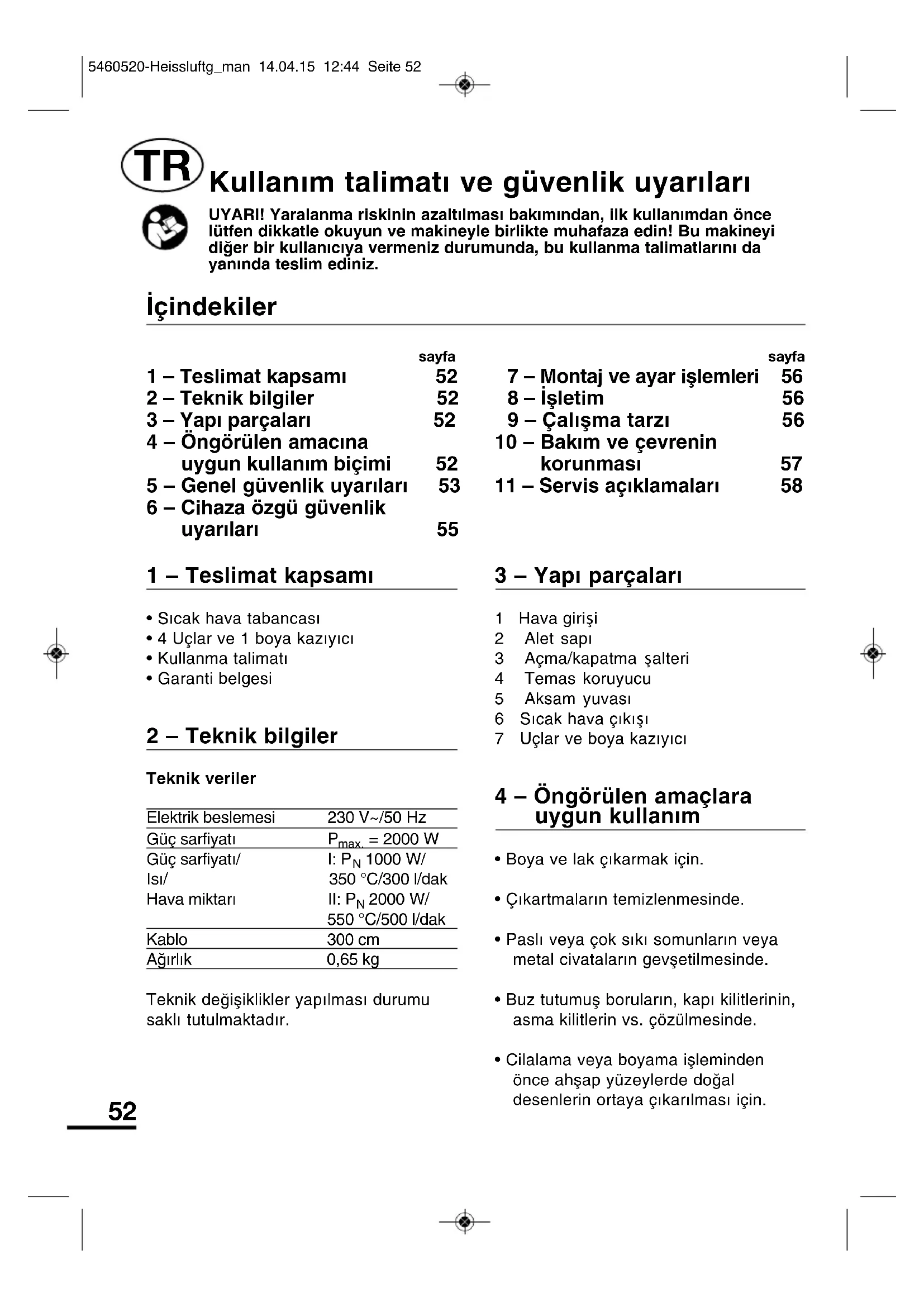sayfa 1 – Teslimat kapsam∂ 52 2 – Teknik bilgiler 52 3 – Yap∂ parçalar∂ 52 4 – Öngörülen amac∂na uygun kullan∂m biçimi 52 5 – Genel güvenlik uyar∂lar∂ 53 6 – Cihaza özgü güvenlik uyar∂lar∂ 55 sayfa 7 – Montaj ve ayar iμlemleri 56 8 – ∑μletim 56 9 – Çal∂μma tarz∂ 56 10 – Bak∂m ve çevrenin korunmas∂ 57 11 – Servis aç∂klamalar∂ 58 ∑çindekiler 5460520-Heissluftg_man 14.04.15 12:44 Seite 5253