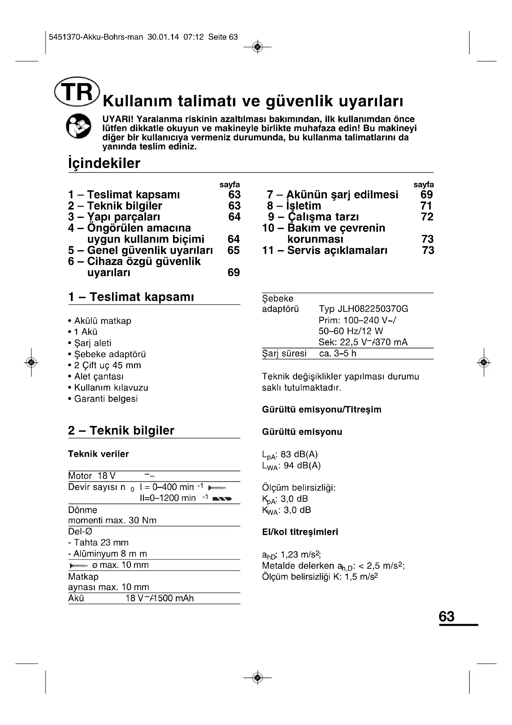 Kullanım talimat∂ ve güvenlik uyarıları UYARI! Yaralanma riskinin azalt∂lmas∂ bak∂m∂ndan, ilk kullan∂mdan öncelütfen dikkatle okuyun ve makineyle birlikte muhafaza edin! Bu makineyidiπer bir kullan∂c∂ya vermeniz durumunda, bu kullanma talimatlar∂n∂ dayan∂nda teslim ediniz. sayfa 1 – Teslimat kapsam∂ 63 2 – Teknik bilgiler 63 3 – Yap∂ parçalar∂ 64 4 – Öngörülen amac∂na uygun kullan∂m biçimi 64 5 – Genel güvenlik uyar∂lar∂ 65 6 – Cihaza özgü güvenlik uyar∂lar∂ 69 sayfa 7 – Akünün μarj edilmesi 69 8 – ∑μletim 71 9 – Çal∂μma tarz∂ 72 10 – Bak∂m ve çevrenin korunmas∂ 73 11 – Servis aç∂klamalar∂ 73 ∑çindekiler 5451370-Akku-Bohrs-man 30.01.14 07:12 Seite 6364 Ses/Titreμim bilgisi Ölçüm deπerleri z EN 60745-1, EN 60745-2-1, EN 60745-2-2 uyar∂nca tespit edilmiμtir. Belirtilen sal∂n∂m emisyon deπeri normland∂r∂lm∂μ bir test yöntemine göre ölçülmüμ olup, elektrikli bir aletin bir baμka aletle k∂yaslanmas∂nda kullan∂labilir. Belirtilen sal∂n∂m emisyon deπeri, muhtemel bir olumsuz etki için ilk tahmin olarak da kullan∂labilir. D∑KKAT! Sal∂n∂m emisyon deπeri, elektrikli aletin kullan∂lmas∂ s∂ras∂nda, aletin ne tür kullan∂ld∂π∂na baπl∂ olarak belirtilen deπerden farkl∂l∂k gösterebilir. Kullan∂c∂n∂n korunmas∂ aç∂s∂ndan güvenlik önlemleri belirlenmesi zorunludur. Burada, muhtemel olumsuz etki hakk∂nda reel uygulama koμullar∂ gözönüne al∂narak tahmin yap∂l∂r. (Bunda iμletim döngüsünün pay∂ da, yani aletin kapal∂ olduπu süreler ve de aletin gerçi aç∂k olduπu ama herhangi bir zorlanma olmadan çal∂μt∂π∂ süreler de dikkate al∂nmal∂d∂r.) 3 – Yap∂ parçalar∂ 1 Matkap aynas∂ 2 Dönme momenti ayar∂ 16+1 3 Açma-/Kapatma μalteri 4 Saπa/Sola hareket 5 Akü 6 Ωarj aleti 7 Ωebeke adaptörü 8 Ωarj fiμi 9 Kilit açma düπmesi 10 SPEED μalteri (1./2.devir) 11 M∂knat∂sl∂ altl∂k 12 Akü μarj göstergesi 13 Ωarj kontrol-LED 14 LED çal∂μma lâmbas∂ 15 2 Çift uç 45 mm 4 – Öngörülen amaçlara uygun kullan∂m Tahta ve metalde delme iμlemi, vidalama. Makineyi, μarj aletini ve aksesuarlar∂n∂ sadece amaca uygun μekilde kullan∂n∂z (üretici bilgilerini de dikkate al∂n∂z)! Amac∂ d∂μ∂nda tüm kullan∂mlar yasakt∂r. Bu alet sadece evde yapılacak olan iμlerde kullanılmak için belirlenmiμtir. Bu cihaz, güvenliklerinden sorumlu bir kiμinin denetimi olmaks∂z∂n ya da bu kiμi taraf∂ndan cihaz∂n nas∂l kullan∂lacaπ∂ tarif edilmeden s∂n∂rl∂ fiziki, duyusal veya zihinsel yetilere sahip kiμiler (çocuklar dahil) taraf∂ndan ya da tecrübesizce ve/veya bilgisizce kullan∂lamaz. Çocuklar∂n cihazla oynamamalar∂n∂n saπlanmas∂ aç∂s∂ndan kontrol alt∂nda tutulmas∂ gerekmektedir. Amac∂na uygun olmayan kullan∂m Cihaz∂n "Amac∂na uygun kullan∂m" bölümünde belirtilmeyen her tür kullan∂m∂ amac∂na uygun olmayan kullan∂md∂r. Bu elektrikli aletle öngörülmeyen uygulamalarda bulunulmas∂, tehlike ve yaralanmalara yol açabilir. Özel olarak bu elektrikli alet için öngörülmemiμ olan aksam∂ kullanmay∂n∂z. Bu takdirde yaralanma tehlikesi vard∂r. Hatal∂ kullan∂mdan dolay∂ meydana gelebilecek tüm maddi hasarlardan veya yaralanmalardan, cihaz∂ kullanan∂n kendisi sorumluluk taμ∂r. 5451370-Akku-Bohrs-man 30.01.14 07:12 Seite 6465 Makinede baμka veya orijinal olmayan parçalar∂n kullan∂lmas∂, üretici taraf∂ndan verilen garantinin yanmas∂na yol açar. Muhtemel riskler: ∑μbu elektrikli aletin iμletme talimat∂, elektrikli aletlerin emniyetli kullan∂labilmesine iliμkin önemli uyar∂lar içerir. Yine de her elektrikli alet, mevcut koruyucu tertibatlara raπmen tamamen ihtimal d∂μ∂ b∂rak∂lamayacak muhtemel riskler içerir. O nedenle elektrikli aletleri her zaman gereken itinayla kullan∂n∂z. Muhtemel riskler örneπin μunlar olabilir: