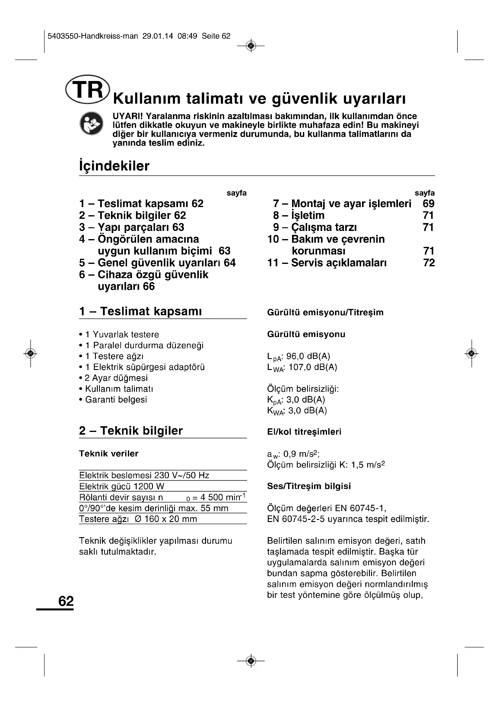Ölçüm belirsizliπi K: 1,5 m/s Ses/Titreμim bilgisiÖlçüm deπerleri EN 60745-1,EN 60745-2-5 uyar∂nca tespit edilmiμtir.Belirtilen sal∂n∂m emisyon deπeri, sat∂htaμlamada tespit edilmiμtir. Baμka türuygulamalarda sal∂n∂m emisyon deπeribundan sapma gösterebilir. Belirtilensal∂n∂m emisyon deπeri normland∂r∂lm∂μbir test yöntemine göre ölçülmüμ olup, Kullanım talimat∂ ve güvenlik uyarıları UYARI! Yaralanma riskinin azalt∂lmas∂ bak∂m∂ndan, ilk kullan∂mdan öncelütfen dikkatle okuyun ve makineyle birlikte muhafaza edin! Bu makineyidiπer bir kullan∂c∂ya vermeniz durumunda, bu kullanma talimatlar∂n∂ dayan∂nda teslim ediniz. sayfa 1 – Teslimat kapsam∂ 62 2 – Teknik bilgiler 62 3 – Yap∂ parçalar∂ 63 4 – Öngörülen amac∂na uygun kullan∂m biçimi 63 5 – Genel güvenlik uyar∂lar∂ 64 6 – Cihaza özgü güvenlik uyar∂lar∂ 66 sayfa 7 – Montaj ve ayar iμlemleri 69 8 – ∑μletim 71 9 – Çal∂μma tarz∂ 71 10 – Bak∂m ve çevrenin korunmas∂ 71 11 – Servis aç∂klamalar∂ 72 ∑çindekiler
