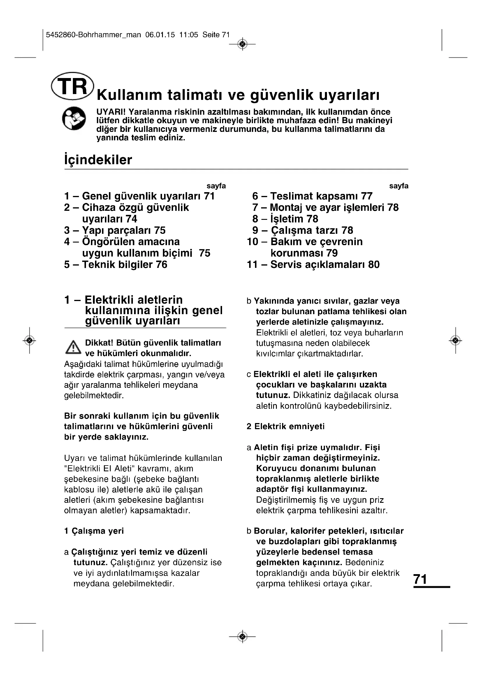 - Także po upływie okresu gwarancyjnego jesteśmy do Państwa dyspozycji i oferujemy naprawę urządzeń Meister w atrakcyjnych cenach. 5452860-Bohrhammer_man 06.01.15 11:05 Seite 7071 1 – Elektrikli aletlerin kullan∂m∂na iliμkin genel güvenlik uyar∂lar∂ Dikkat! Bütün güvenlik talimatlar∂ve hükümleri okunmal∂d∂r.Aμaπ∂daki talimat hükümlerine uyulmad∂π∂takdirde elektrik çarpmas∂, yang∂n ve/veyaaπ∂r yaralanma tehlikeleri meydanagelebilmektedir. Bir sonraki kullan∂m için bu güvenliktalimatlar∂n∂ ve hükümlerini güvenlibir yerde saklay∂n∂z. Uyar∂ ve talimat hükümlerinde kullan∂lan"Elektrikli EI Aleti" kavram∂, ak∂mμebekesine baπl∂ (μebeke baπlant∂kablosu ile) aletlerle akü ile çal∂μanaletleri (ak∂m μebekesine baπlant∂s∂olmayan aletler) kapsamaktad∂r. 1 Çal∂μma yeri a Çal∂μt∂π∂n∂z yeri temiz ve düzenlitutunuz. Çal∂μt∂π∂n∂z yer düzensiz iseve iyi ayd∂nlat∂lmam∂μsa kazalarmeydana gelebilmektedir.b Yak∂n∂nda yan∂c∂ s∂v∂lar, gazlar veyatozlar bulunan patlama tehlikesi olanyerlerde aletinizle çal∂μmay∂n∂z.Elektrikli el aletleri, toz veya buharlar∂ntutuμmas∂na neden olabilecekk∂v∂lc∂mlar ç∂kartmaktad∂rlar. c Elektrikli el aleti ile çal∂μ∂rkençocuklar∂ ve baμkalar∂n∂ uzaktatutunuz. Dikkatiniz daπ∂lacak olursaaletin kontrolünü kaybedebilirsiniz. 2 Elektrik emniyeti a Aletin fiμi prize uymal∂d∂r. Fiμihiçbir zaman deπiμtirmeyiniz.Koruyucu donan∂m∂ bulunantopraklanm∂μ aletlerle birlikteadaptör fiμi kullanmay∂n∂z.Deπiμtirilmemiμ fiμ ve uygun prizelektrik çarpma tehlikesini azalt∂r. b Borular, kalorifer petekleri, ∂s∂t∂c∂larve buzdolaplar∂ gibi topraklanm∂μyüzeylerle bedensel temasagelmekten kaç∂n∂n∂z. Bedeniniztoprakland∂π∂ anda büyük bir elektrikçarpma tehlikesi ortaya ç∂kar. Kullanım talimat∂ ve güvenlik uyarıları UYARI! Yaralanma riskinin azalt∂lmas∂ bak∂m∂ndan, ilk kullan∂mdan öncelütfen dikkatle okuyun ve makineyle birlikte muhafaza edin! Bu makineyidiπer bir kullan∂c∂ya vermeniz durumunda, bu kullanma talimatlar∂n∂ dayan∂nda teslim ediniz. sayfa 1 – Genel güvenlik uyar∂lar∂ 71 2 – Cihaza özgü güvenlik uyar∂lar∂ 74 3 – Yap∂ parçalar∂ 75 4 – Öngörülen amac∂na uygun kullan∂m biçimi 75 5 – Teknik bilgiler 76 sayfa 6 – Teslimat kapsam∂ 77 7 – Montaj ve ayar iμlemleri 78 8 – ∑μletim 78 9 – Çal∂μma tarz∂ 78 10 – Bak∂m ve çevrenin korunmas∂ 79 11 – Servis aç∂klamalar∂ 80 ∑çindekiler 5452860-Bohrhammer_man 06.01.15 11:05 Seite 71c Aleti yaπmur alt∂nda veya nemli yerlerde b∂rakmay∂n∂z. Suyun elektrikli el aleti içine s∂zmas∂ elektrik çarpma tehlikesini yükseltir. d Aleti kablosundan tutarak taμ∂may∂n∂z, kabloyu kullanarak asmay∂n∂z veya kablodan çekerek fiμi ç∂kartmay∂n∂z. Kabloyu ∂s∂dan, yaπdan, keskin kenarl∂ cisimlerden veya aletin hareketli parçalar∂ndan uzak tutunuz. Hasarl∂ veya dolanm∂μ kablo elektrik çarpma tehlikesini yükseltir. e Bir elektrikli el aleti ile aç∂k havada çal∂μ∂rken, mutlaka aç∂k havada kullan∂lmaya onayl∂ olan bir uzatma kablosu kullan∂n∂z. Aç∂k havada kullan∂lmaya uygun uzatma kablosunun kullan∂lmas∂ elektrik çarpma tehlikesini azalt∂r. 3 Kiμilerin Güvenliπi a Dikkatli olunuz, ne yapt∂π∂n∂za dikkat ediniz, elektrikli el aleti ile iμinizi makul bir tempo ve yöntemle yürütünüz. Yorgunsan∂z, ald∂π∂n∂z haplar∂n, ilaçlar∂n veya alkolün etkisinde iseniz aletinizi kullanmay∂n∂z. Aleti kullan∂rken bir anl∂k dikkatsizlik önemli yaralanmalara neden olabilir. b Daima kiμisel koruyucu donan∂m ve koruyucu gözlük kullan∂n∂z. Yapt∂π∂n∂z iμe göre kullanacaπ∂n∂z∂ toz maskesi, kaymayan iμ ayakkab∂lar∂, kask ve kulakl∂k yaralanma tehlikesini azalt∂r. c Aletin kontrol d∂μ∂ çal∂μmamas∂ için gerekli önlemleri al∂n∂z. Aleti ak∂m μebekesine veya aküye baπlamadan önce, kald∂rmadan veya taμ∂maya baμlamadan önce kapal∂ olduπundan emin olunuz. Aleti taμ∂rken parmaπ∂n∂z μalter üzerinde olursa veya aleti aç∂k durumda ak∂m μebekesine baπlarsan∂z kazalara neden olabilirsiniz. d Aleti çal∂μt∂rmadan önce ayar aletlerini veya anahtarlar∂ aletten ç∂kart∂n∂z. Aletin dönen parçalar∂n∂n içinde bulunabilecek bir yard∂mc∂ alet yaralanmalara neden olabilir. e Kendinize çok fazla güvenmeyiniz. Çal∂μ∂rken duruμunuz güvenli olsun ve dengenizi her zaman saπlay∂n∂z. Bu sayede aleti beklenmedik durumlarda daha iyi kontrol edebilirsiniz. f Uygun iμ elbiseleri giyiniz. Geniμ giysiler giymeyiniz ve tak∂ takmay∂n∂z. Saçlar∂n∂z∂, giysilerinizi ve eldivenlerinizi aletin hareketli parçalar∂ndan uzak tutunuz. Bol giysiler, uzun saçlar veya tak∂lar, aletin hareketli parçalar∂ taraf∂ndan tutulabilir. g Tutamaklar∂ kuru, temiz ve yaπs∂z tutunuz. Yaπl∂ tutamaklar kayabilir ve aletin kontrolünü kaybedebilirsiniz. h Toz emme donan∂m∂ veya toz tutma tertibat∂ kullan∂rken, bunlar∂n baπl∂ olduπundan ve doπru kullan∂ld∂π∂ndan emin olunuz. Bu donan∂mlar∂n kullan∂lmas∂ tozdan kaynaklanacak tehlikeleri azalt∂r. 4 Elektrikli el aletlerinin özenle kullan∂m∂ ve bak∂m∂ a Aleti aμr∂ ölçüde zorlamay∂n∂z. Yapt∂π∂n∂z iμe uygun elektrikli el aletleri kullan∂n∂z. Uygun performansl∂ elektrikli el aleti ile belirlenen çal∂μma alan∂nda daha iyi ve güvenli çal∂μ∂rs∂n∂z. b Ωalteri bozuk olan elektrikli el aletini kullanmay∂n∂z. Aç∂l∂p