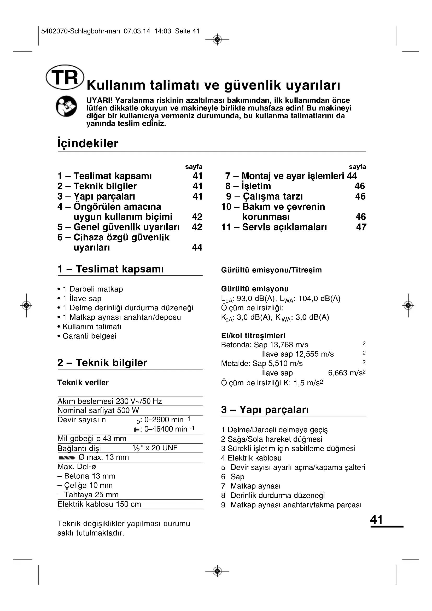 3 – Yap∂ parçalar∂ 1 Delme/Darbeli delmeye geçiμ2 Saπa/Sola hareket düπmesi3 Sürekli iμletim için sabitleme düπmesi4 Elektrik kablosu5 Devir say∂s∂ ayarl∂ açma/kapama μalteri6Sap7 Matkap aynas∂8 Derinlik durdurma düzeneπi9 Matkap aynas∂ anahtar∂/takma parças∂ Kullanım talimat∂ ve güvenlik uyarıları UYARI! Yaralanma riskinin azalt∂lmas∂ bak∂m∂ndan, ilk kullan∂mdan öncelütfen dikkatle okuyun ve makineyle birlikte muhafaza edin! Bu makineyidiπer bir kullan∂c∂ya vermeniz durumunda, bu kullanma talimatlar∂n∂ dayan∂nda teslim ediniz. sayfa 1 – Teslimat kapsam∂ 41 2 – Teknik bilgiler 41 3 – Yap∂ parçalar∂ 41 4 – Öngörülen amac∂na uygun kullan∂m biçimi 42 5 – Genel güvenlik uyar∂lar∂ 42 6 – Cihaza özgü güvenlik uyar∂lar∂ 44 sayfa 7 – Montaj ve ayar iμlemleri 44 8 – ∑μletim 46 9 – Çal∂μma tarz∂ 46 10 – Bak∂m ve çevrenin korunmas∂ 46 11 – Servis aç∂klamalar∂ 47 ∑çindekiler 5402070-Schlagbohr-man 07.03.14 14:03 Seite 4142 4 – Öngörülen amaçlara uygun kullan∂m Tahta ve metale delme, betona darbeli delme. Makine, alet ve aksesuarlar∂ baμka iμler için sadece amac∂na uygun biçimde kullan∂n∂z (üretici bilgilerini dikkate al∂n∂z). Amac∂ d∂μ∂nda tüm kullan∂mlar yasakt∂r. D∑KKAT! Makinede amac∂na uygun kullan∂m d∂μ∂ndaki müdahaleler, garanti hakk∂n∂n yanmas∂na neden olur. Bu cihaz sadece evde kullanım için belirlenmiμtir. 5 – Elektrikli aletlerin kullan∂m∂na iliμkin genel güvenlik uyar∂lar∂ Dikkat! Bütün güvenlik talimatlar∂ ve hükümleri okunmal∂d∂r. Aμaπ∂daki talimat hükümlerine uyulmad∂π∂ takdirde elektrik çarpmas∂, yang∂n ve/veya aπ∂r yaralanma tehlikeleri meydana gelebilmektedir. Bir sonraki kullan∂m için bu güvenlik talimatlar∂n∂ ve hükümlerini güvenli bir yerde saklay∂n∂z. Uyar∂ ve talimat hükümlerinde kullan∂lan "Elektrikli EI Aleti" kavram∂, ak∂m μebekesine baπl∂ (μebeke baπlant∂ kablosu ile) aletlerle akü ile çal∂μan aletleri (ak∂m μebekesine baπlant∂s∂ olmayan aletler) kapsamaktad∂r. 1 Çal∂μma yeri a Çal∂μt∂π∂n∂z yeri temiz ve düzenli tutunuz. Çal∂μt∂π∂n∂z yer düzensiz ise ve iyi ayd∂nlat∂lmam∂μsa kazalar meydana gelebilmektedir. b Yak∂n∂nda yan∂c∂ s∂v∂lar, gazlar veya tozlar bulunan patlama tehlikesi olan yerlerde aletinizle çal∂μmay∂n∂z. Elektrikli el aletleri, toz veya buharlar∂n tutuμmas∂na neden olabilecek k∂v∂lc∂mlar ç∂kartmaktad∂rlar. c Elektrikli el aleti ile çal∂μ∂rken çocuklar∂ ve baμkalar∂n∂ uzakta tutunuz. Dikkatiniz daπ∂lacak olursa aletin kontrolünü kaybedebilirsiniz. 2 Elektrik emniyeti a Aletin fiμi prize uymal∂d∂r. Fiμi hiçbir zaman deπiμtirmeyiniz. Koruyucu donan∂m∂ bulunan topraklanm∂μ aletlerle birlikte adaptör fiμi kullanmay∂n∂z. Deπiμtirilmemiμ fiμ ve uygun priz elektrik çarpma tehlikesini azalt∂r. b Borular, kalorifer petekleri, ∂s∂t∂c∂lar ve buzdolaplar∂ gibi topraklanm∂μ yüzeylerle bedensel temasa gelmekten kaç∂n∂n∂z. Bedeniniz toprakland∂π∂ anda büyük bir elektrik çarpma tehlikesi ortaya ç∂kar. c Aleti yaπmur alt∂nda veya nemli yerlerde b∂rakmay∂n∂z. Suyun elektrikli el aleti içine s∂zmas∂ elektrik çarpma tehlikesini yükseltir. d Aleti kablosundan tutarak taμ∂may∂n∂z, kabloyu kullanarak asmay∂n∂z veya kablodan çekerek fiμi ç∂kartmay∂n∂z. Kabloyu ∂s∂dan, yaπdan, keskin kenarl∂ cisimlerden veya aletin hareketli parçalar∂ndan uzak tutunuz. Hasarl∂ veya dolanm∂μ kablo elektrik çarpma tehlikesini yükseltir. e Bir elektrikli el aleti ile aç∂k havada çal∂μ∂rken, mutlaka aç∂k havada kullan∂lmaya onayl∂ olan bir uzatma kablosu kullan∂n∂z. Aç∂k havada 5402070-Schlagbohr-man 07.03.14 14:03 Seite 4243 kullan∂lmaya uygun uzatma kablosunun kullan∂lmas∂ elektrik çarpma tehlikesini azalt∂r. 3 Kiμilerin Güvenliπi a Dikkatli olunuz, ne yapt∂π∂n∂za dikkat ediniz, elektrikli el aleti ile iμinizi makul bir tempo ve yöntemle yürütünüz. Yorgunsan∂z, ald∂π∂n∂z haplar∂n, ilaçlar∂n veya alkolün etkisinde iseniz aletinizi kullanmay∂n∂z. Aleti kullan∂rken bir anl∂k dikkatsizlik önemli yaralanmalara neden olabilir. b Daima kiμisel koruyucu donan∂m ve koruyucu gözlük kullan∂n∂z. Yapt∂π∂n∂z iμe göre kullanacaπ∂n∂z∂ toz maskesi, kaymayan iμ ayakkab∂lar∂, kask ve kulakl∂k yaralanma tehlikesini azalt∂r. c Aletin kontrol d∂μ∂ çal∂μmamas∂ için gerekli önlemleri al∂n∂z. Aleti ak∂m μebekesine veya aküye baπlamadan önce, kald∂rmadan veya taμ∂maya baμlamadan önce kapal∂ olduπundan emin olunuz. Aleti taμ∂rken parmaπ∂n∂z μalter üzerinde olursa veya aleti aç∂k durumda ak∂m μebekesine baπlarsan∂z kazalara neden olabilirsiniz. d Aleti çal∂μt∂rmadan önce ayar aletlerini veya anahtarlar∂ aletten ç∂kart∂n∂z. Aletin dönen parçalar∂n∂n içinde bulunabilecek bir yard∂mc∂ alet yaralanmalara neden olabilir. e Kendinize çok fazla güvenmeyiniz. Çal∂μ∂rken duruμunuz güvenli olsun ve dengenizi her zaman saπlay∂n∂z. Bu sayede aleti beklenmedik durumlarda daha iyi kontrol edebilirsiniz. f Uygun iμ elbiseleri giyiniz. Geniμ giysiler giymeyiniz ve tak∂ takmay∂n∂z. Saçlar∂n∂z∂, giysilerinizi ve eldivenlerinizi aletin hareketli parçalar∂ndan uzak tutunuz. Bol giysiler, uzun saçlar veya tak∂lar, aletin hareketli parçalar∂ taraf∂ndan tutulabilir. g Tutamaklar∂ kuru, temiz ve yaπs∂z tutunuz. Yaπl∂ tutamaklar kayabilir ve aletin kontrolünü kaybedebilirsiniz. h Toz emme donan∂m∂ veya toz tutma tertibat∂ kullan∂rken, bunlar∂n baπl∂ olduπundan ve doπru kullan∂ld∂π∂ndan emin olunuz. Bu donan∂mlar∂n kullan