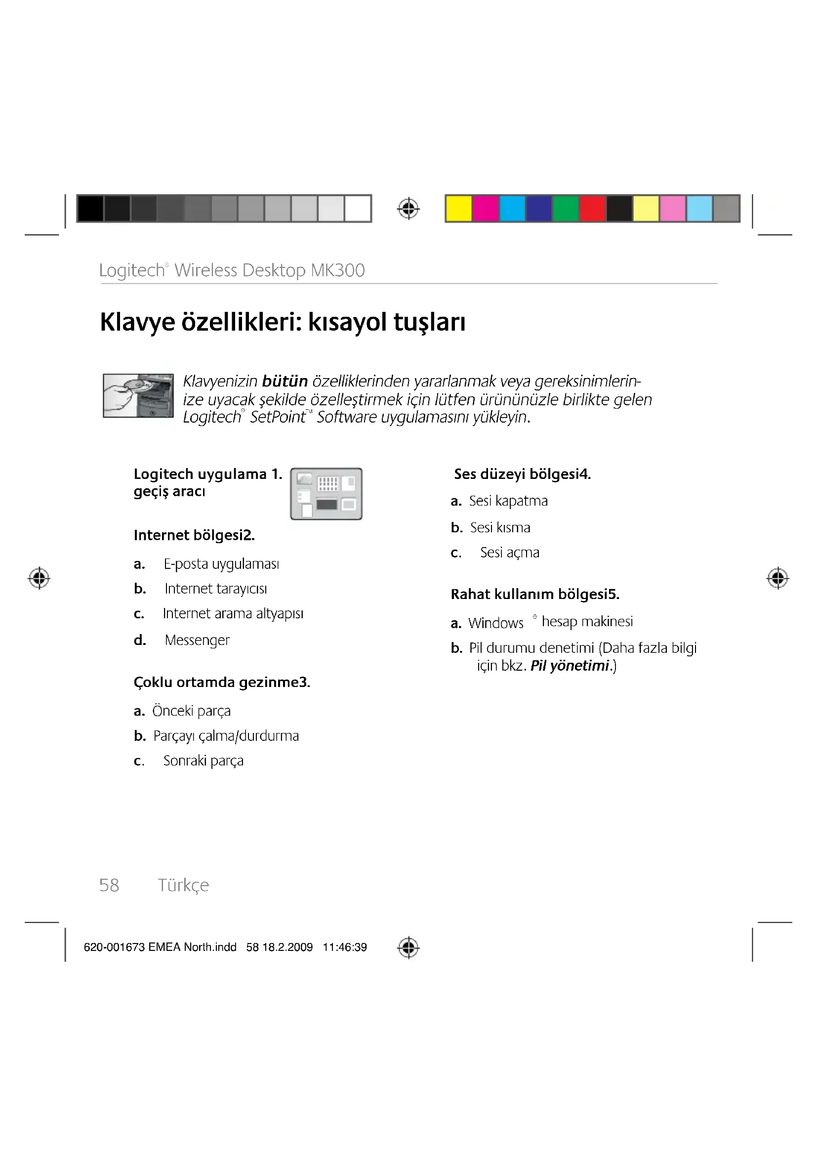 Software uygulamasını yükleyin. Logitech uygulama 1. geçiş aracı Internet bölgesi2. a. E-postauygulaması b. Internettarayıcısı c. Internetaramaaltyapısı d. Messenger Çoklu ortamda gezinme3. a. Öncekiparça b. Parçayıçalma/durdurma c. Sonrakiparça Ses düzeyi bölgesi4. a. Sesikapatma b. Sesikısma c. Sesiaçma Rahat kullanım bölgesi5. a. Windows