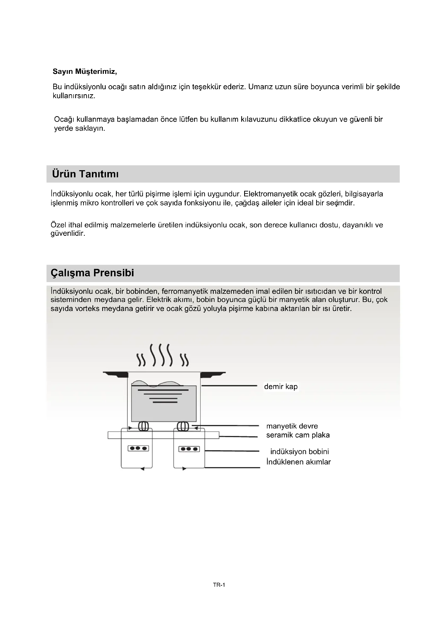 SI-18Sayın Müşterimiz, Bu indüksiyonlu ocağı satın aldığınız için teşekkür ederiz. Umarız uzun süre boyunca verimli bir şekilde kullanırsınız. Ocağı kullanmaya başlamadan önce lütfen bu kullanım kılavuzunu dikkatlice okuyun ve güvenli bir yerde saklayın. Ürün Tanıtımı İndüksiyonlu ocak, her türlü pişirme işlemi için uygundur. Elektromanyetik ocak gözleri, bilgisayarla işlenmiş mikro kontrolleri ve çok sayıda fonksiyonu ile, çağdaş aileler için ideal bir seçimdir. Özel ithal edilmiş malzemelerle üretilen indüksiyonlu ocak, son derece kullanıcı dostu, dayanıklı ve güvenlidir. Çalışma Prensibi İndüksiyonlu ocak, bir bobinden, ferromanyetik malzemeden imal edilen bir ısıtıcıdan ve bir kontrol sisteminden meydana gelir. Elektrik akımı, bobin boyunca güçlü bir manyetik alan oluşturur. Bu, çok sayıda vorteks meydana getirir ve ocak gözü yoluyla pişirme kabına aktarılan bir ısı üretir. demir kap manyetik devre seramik cam plaka indüksiyon bobini İndüklenen akımlar TR-1Emniyet Kurulum Bu ocak, ev içi kullanım için özel olarak üretilmiştir. Ürünlerinin sürekli olarak geliştirilmesi için süregelen arayış neticesinde, cihazın her türlü teknik, program veya estetik yönü, her an değiştirilebilir.
