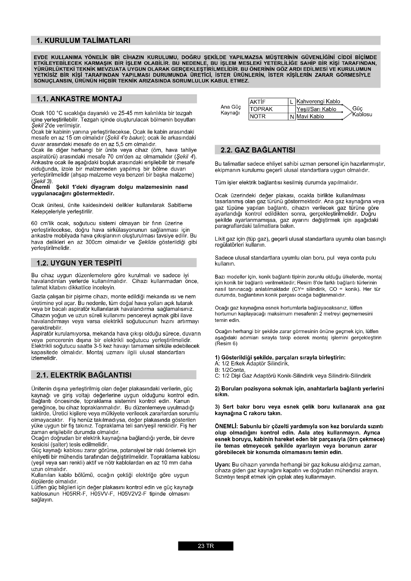 1.1. Ankastre Montaj 1.2. Uygun Yer Tespiti 2.1. Elektrik Bağlantısı 2.2. Gaz Bağlantısı 2.3. Ocağın Farklı Gaz Türlerine Uyarlanması 2.4. Minimum Alevin Ayarlanması