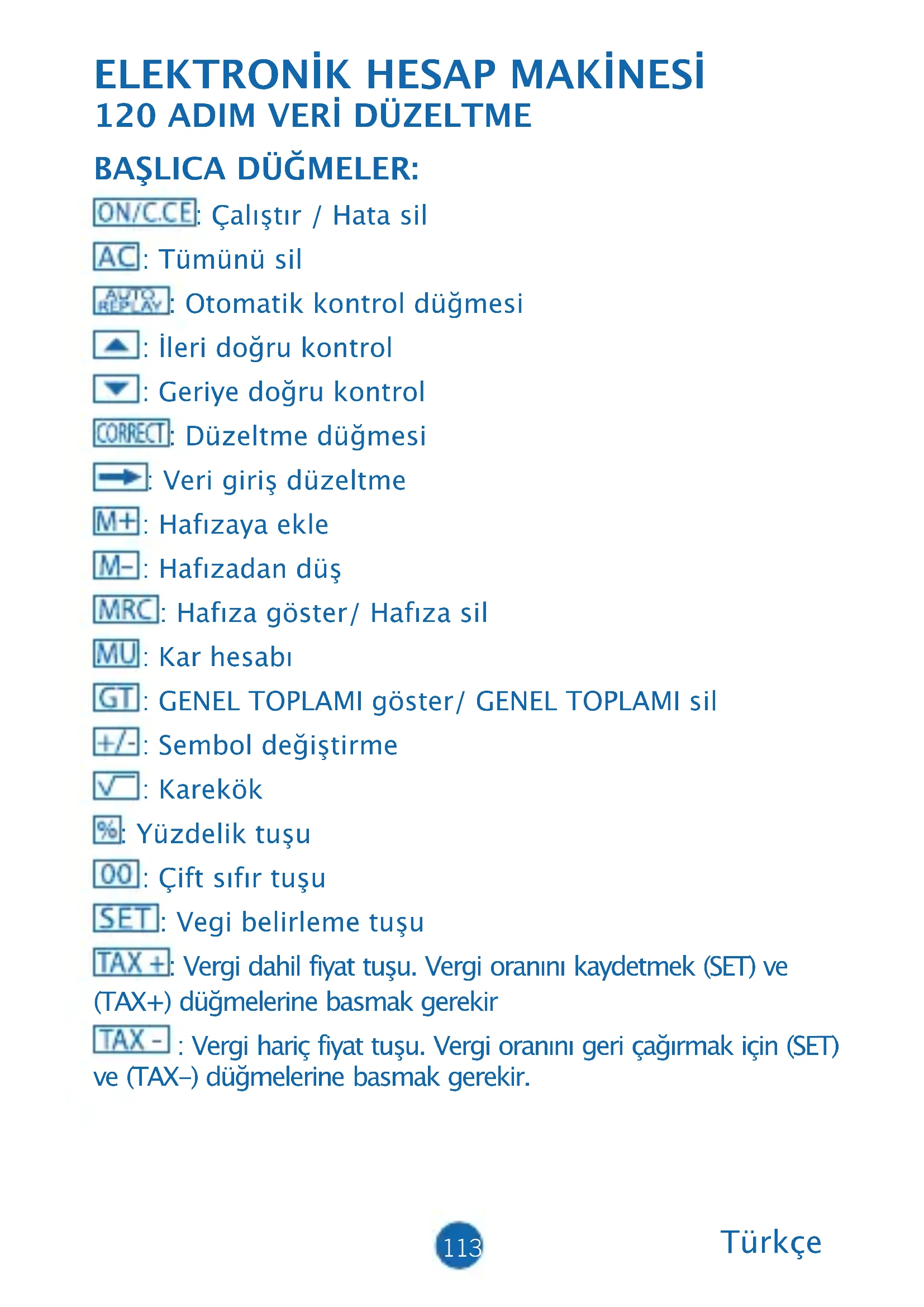 BAŞLICA DÜĞMELER: : Çalıştır / Hata sil : Tümünü sil : Otomatik kontrol düğmesi : İleri doğru kontrol : Geriye doğru kontrol : Düzeltme düğmesi : Veri giriş düzeltme : Hafızaya ekle : Hafızadan düş : Hafıza göster/ Hafıza sil : Kar hesabı : GENEL TOPLAMI göster/ GENEL TOPLAMI sil : Sembol değiştirme : Karekök : Yüzdelik tuşu : Çift sıfır tuşu : Vegi belirleme tuşu : Vergi dahil fiyat tuşu. Vergi oranını kaydetmek (SET) ve (TAX+) düğmelerine basmak gerekir : Vergi hariç fiyat tuşu. Vergi oranını geri çağırmak için (SET) ve (TAX-) düğmelerine basmak gerekir. Türkçe114 SELEKTÖRLERİN TANIMI: