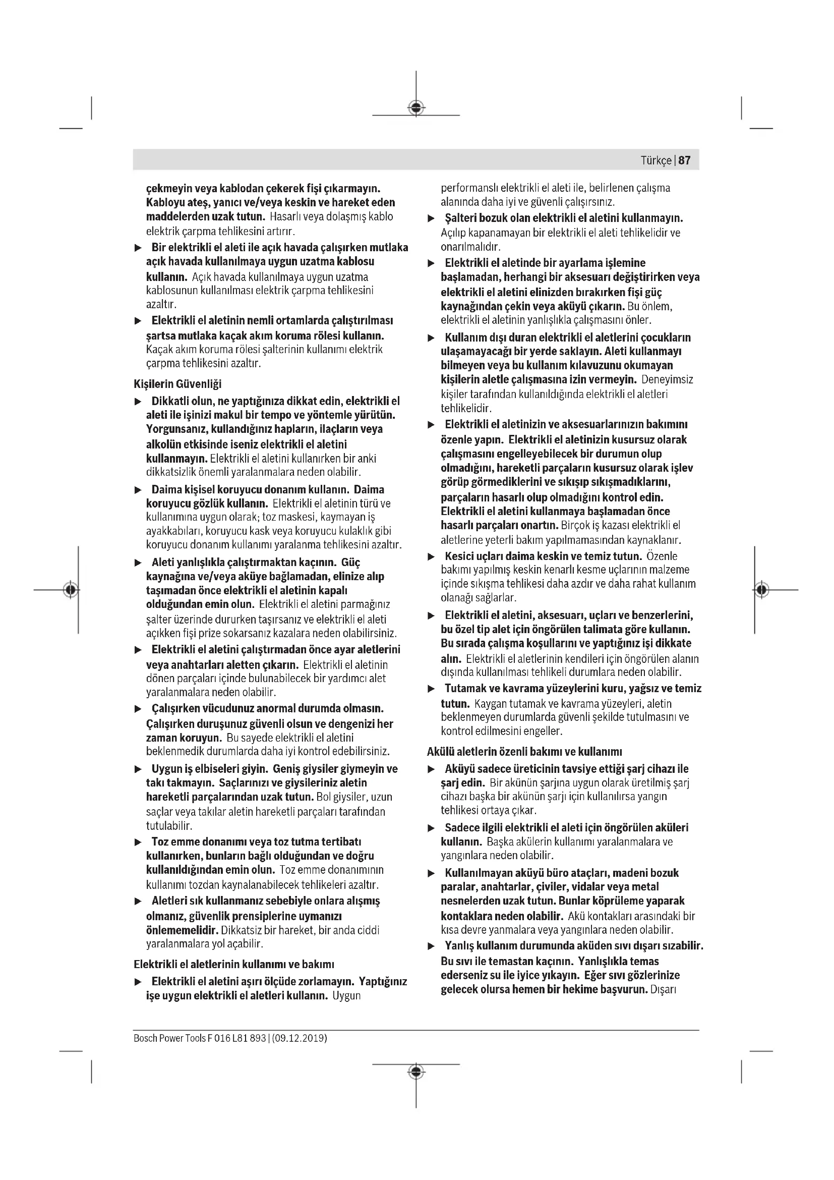 Τα μηχανήματα κήπου, οι μπαταρίες, τα εξαρτήματα και οι συσκευασίες πρέπει να ανακυκλώνονται με τρόπο φιλικό προς το περιβάλλον. Μη ρίχνετε τα ηλιακά φωτιστικά και τις μπαταρίες στα οικιακά απορρίμματα! Μόνο για χώρες τηςΕΕ: Σύμφωνα με την Ευρωπαϊκή Οδηγία 2012/19/EE, τα άχρηστα ηλεκτρικά εργαλεία, καθώς και σύμφωνα με την Κοινοτική Οδηγία 2006/66/EΚ, οι χαλασμένες ή αναλωμένες μπαταρίες πρέπει να συλλέγονται ξεχωριστά για να ανακυκλωθούν με τρόπο φιλικό προς το περιβάλλον. Μπαταρίες/Επαναφορτιζόμενες μπαταρίες: Li-Ion: Προσέξτε παρακαλώ τις υποδείξεις στην ενότητα Μεταφορά (βλέπε «Μεταφορά», Σελίδα86). u Οι ενσωματωμένες επαναφορτιζόμενες μπαταρίες επιτρέπεται να αφαιρεθούν για απόσυρση μόνο από ειδικευμένο προσωπικό. Με το άνοιγμα του κελύφους του περιβλήματος μπορεί το προϊόν να καταστραφεί. Για την αφαίρεση της μπαταρίας από το προϊόν, θέστε το σε λειτουργία ώσπου να αδειάσει εντελώς η μπαταρία. Ξεβιδώστε τις βίδες στο περίβλημα και αφαιρέστε το κέλυφος του περιβλήματος, για να αφαιρέσετε την μπαταρία. Για την αποφυγή βραχυκυκλώματος, αποσυνδέστε τις συνδέσεις στην μπαταρία ξεχωριστά τη μια μετά την άλλη και μονώστε στη συνέχεια τους πόλους. Ακόμα και σε κατάσταση πλήρης αποφόρτισης, υπάρχει ακόμα υπόλοιπο φορτίο στην μπαταρία, που σε περίπτωση βραχυκυκλώματος μπορεί να ελευθερωθεί. Türkçe Güvenlik Talimatı Sembollerin açıklaması Kullanım kılavuzunu tam olarak okuyun. Çalışırken yakınınızda duran kişilerin etrafa savrulan yabancı cisimlerle yaralanmamasına dikkat edin. Uyarı: Ürün çalışır durumda iken aletle aranızda güvenli bir mesafe bırakın. Bu ürünü yağmur altında kullanmayın ve yağmur altında bırakmayın. Dikkat: Kesici bıçak, ürün kapandıktan sonra da bir süre serbest dönüşte döner! Ellerinizi bıçaktan uzak tutun. Elektrikli el aletleri için genel güvenlik uyarıları UYARI Bu elektrikli el aletiyle birlikte gelen tüm güvenlik uyarılarını, talimatları, resim ve açıklamaları okuyun. Aşağıda bulunan talimatlara uyulmaması halinde elektrik çarpmalarına, yangınlara ve/veya ağır yaralanmalara neden olabilir. Bütün uyarıları ve talimat hükümlerini ileride kullanmak üzere saklayın. Uyarı ve talimat hükümlerinde kullanılan "elektrikli el aleti" terimi, akım şebekesine bağlı (elektrikli) aletlerle akü ile çalışan aletleri (akülü) kapsamaktadır. Çalışma yeri güvenliği u Çalıştığınız yeri temiz tutun ve iyi aydınlatın. Dağınık veya karanlık alanlar kazalara davetiye çıkarır. u Yakınında patlayıcı maddeler, yanıcı sıvı, gaz veya tozların bulunduğu yerlerde elektrikli el aleti ile çalışmayın. Elektrikli el aletleri, toz veya buharların tutuşmasına neden olabilecek kıvılcımlar çıkarırlar. u Elektrikli el aleti ile çalışırken çocukları ve etraftaki kişileri uzakta tutun. Dikkatiniz dağılacak olursa aletin kontrolünü kaybedebilirsiniz. Elektrik Güvenliği u Elektrikli el aletinin fişi prize uymalıdır. Fişi hiçbir zaman değiştirmeyin. Korumalı (topraklanmış) elektrikli el aletleri ile birlikte adaptör fiş kullanmayın. Değiştirilmemiş fiş ve uygun priz elektrik çarpma tehlikesini azaltır. u Borular, kalorifer petekleri, ısıtıcılar ve buzdolapları gibi topraklanmış yüzeylerle vücudunuzun temas etmesinden kaçının. Vücudunuz topraklandığı anda büyük bir elektrik çarpma tehlikesi ortaya çıkar. u Elektrikli el aletlerini yağmur altında veya nemli ortamlarda bırakmayın. Suyun elektrikli el aleti içine sızması elektrik çarpma tehlikesini artırır. u Kabloya zarar vermeyin. Elektrikli el aletini kablosundan tutarak taşımayın, kabloyu kullanarak F 016 L81 893 | (09.12.2019) Bosch Power ToolsTürkçe | 87 çekmeyin veya kablodan çekerek fişi çıkarmayın. Kabloyu ateş, yanıcı ve/veya keskin ve hareket eden maddelerden uzak tutun. Hasarlı veya dolaşmış kablo elektrik çarpma tehlikesini artırır. u Bir elektrikli el aleti ile açık havada çalışırken mutlaka açık havada kullanılmaya uygun uzatma kablosu kullanın. Açık havada kullanılmaya uygun uzatma kablosunun kullanılması elektrik çarpma tehlikesini azaltır. u Elektrikli el aletinin nemli ortamlarda çalıştırılması şartsa mutlaka kaçak akım koruma rölesi kullanın. Kaçak akım koruma rölesi şalterinin kullanımı elektrik çarpma tehlikesini azaltır. Kişilerin Güvenliği u Dikkatli olun, ne yaptığınıza dikkat edin, elektrikli el aleti ile işinizi makul bir tempo ve yöntemle yürütün. Yorgunsanız, kullandığınız hapların, ilaçların veya alkolün etkisinde iseniz elektrikli el aletini kullanmayın. Elektrikli el aletini kullanırken bir anki dikkatsizlik önemli yaralanmalara neden olabilir. u Daima kişisel koruyucu donanım kullanın. Daima koruyucu gözlük kullanın. Elektrikli el aletinin türü ve kullanımına uygun olarak; toz maskesi, kaymayan i