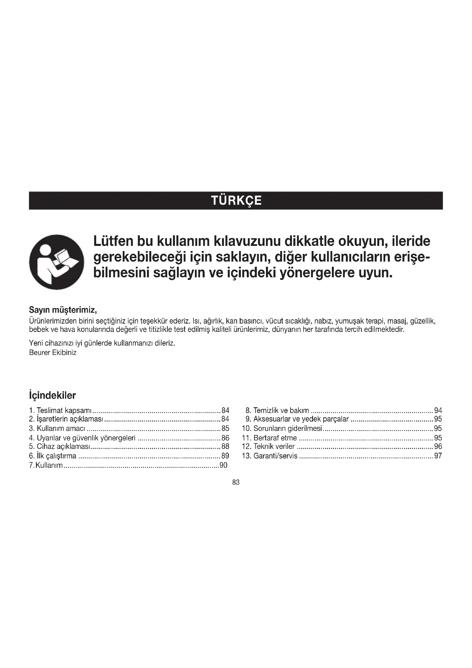 bilmesini sağlayın ve içindeki yönergelere uyun. Sayın müşterimiz, Ürünlerimizden birini seçtiğiniz için teşekkür ederiz. Isı, ağırlık, kan basıncı, vücut sıcaklığı, nabız, yumuşak terapi, masaj, güzellik, bebek ve hava konularında değerli ve titizlikle test edilmiş kaliteli ürünlerimiz, dünyanın her tarafında tercih edilmektedir. Yeni cihazınızı iyi günlerde kullanmanızı dileriz. Beurer Ekibiniz İçindekiler