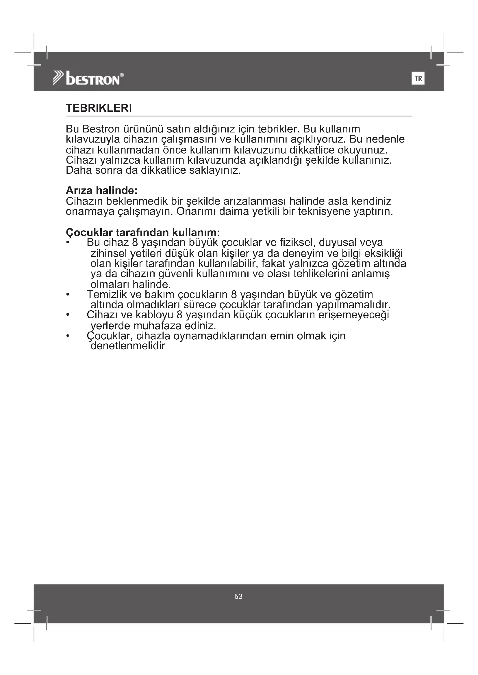 teBrikler! BuBestronürününüsatınaldığınıziçintebrikler.Bukullanım kılavuzuylacihazınçalışmasınıvekullanımınıaçıklıyoruz.Bunedenle cihazıkullanmadanöncekullanımkılavuzunudikkatliceokuyunuz. Cihazıyalnızcakullanımkılavuzundaaçıklandığışekildekullanınız. Dahasonradadikkatlicesaklayınız.