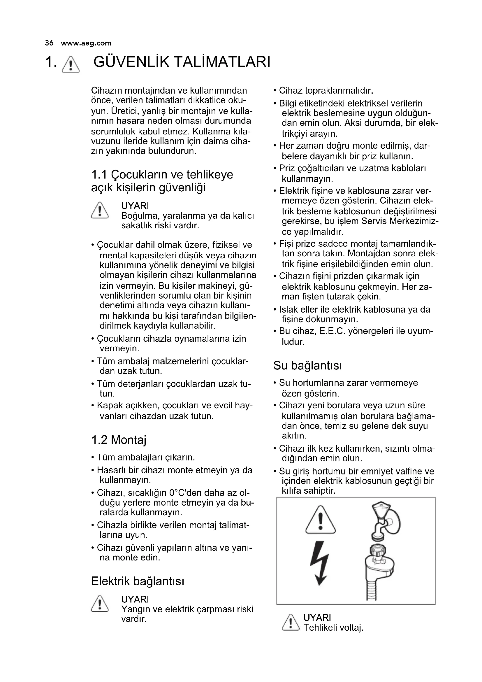 www.aeg.com• Eğer su giriş hortumu hasar görürse, cihazın fişini derhal prizden çekin. Su giriş hortumunu değiştirmek için yetkili servise başvurun.