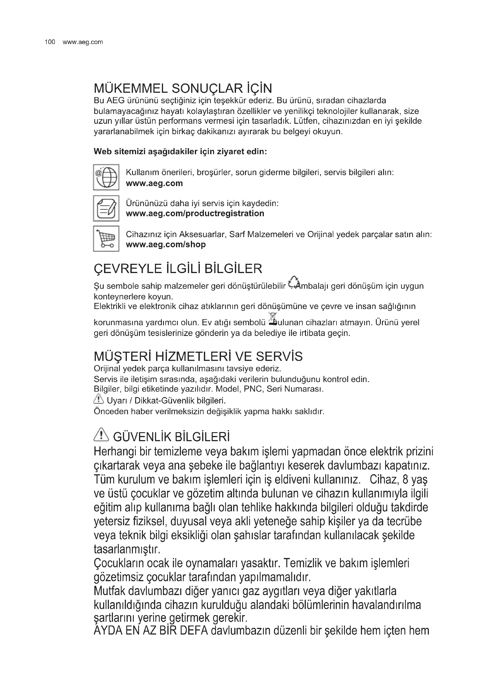 Bu AEG ürününü seçtiğiniz için teşekkür ederiz. Bu ürünü, sıradan cihazlarda bulamayacağınız hayatı kolaylaştıran özellikler ve yenilikçi teknolojiler kullanarak, size uzun yıllar üstün performans vermesi için tasarladık. Lütfen, cihazınızdan en iyi şekilde yararlanabilmek için birkaç dakikanızı ayırarak bu belgeyi okuyun. Web sitemizi aşağıdakiler için ziyaret edin: Kullanım önerileri, broşürler, sorun giderme bilgileri, servis bilgileri alın: www.aeg.com Ürününüzü daha iyi servis için kaydedin: www.aeg.com/productregistration Cihazınız için Aksesuarlar, Sarf Malzemeleri ve Orijinal yedek parçalar satın alın: www.aeg.com/shop