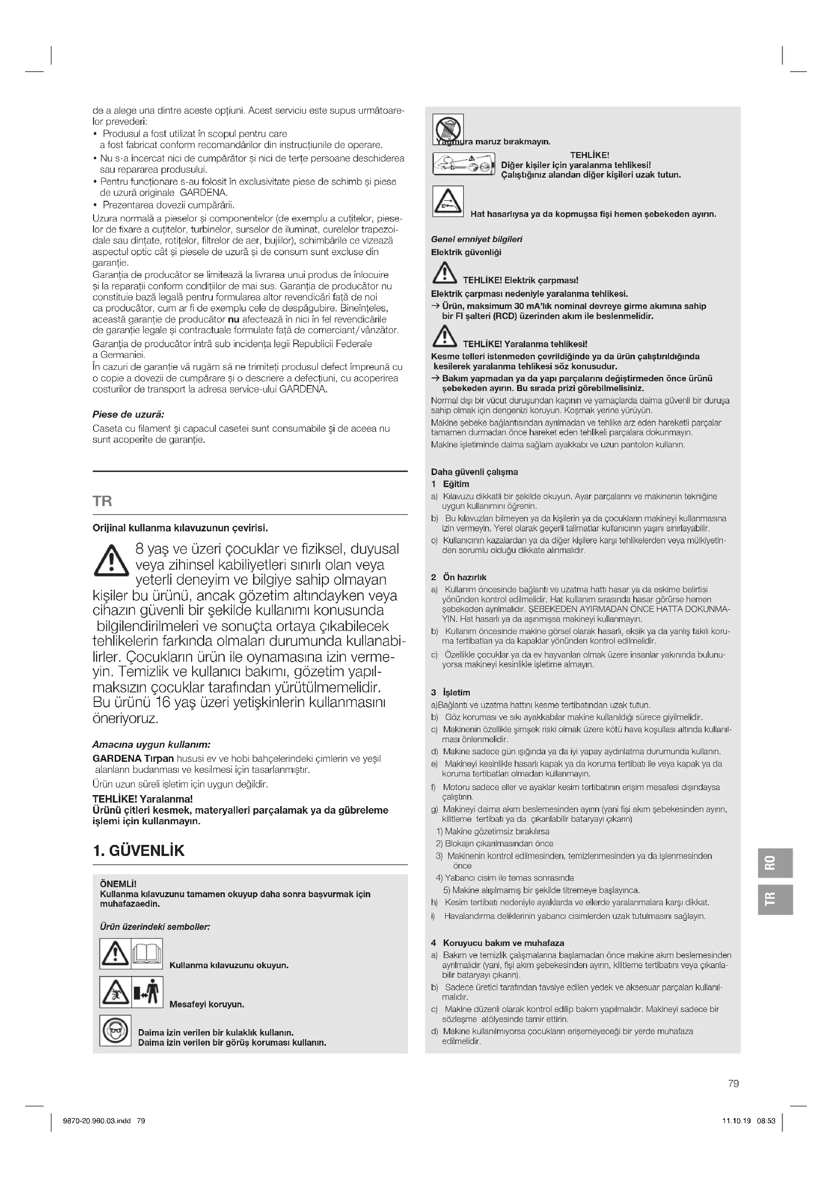 Orijinal kullanma kılavuzunun çevirisi. 8 yaş ve üzeri çocuklar ve fiziksel, duyusal veya zihinsel kabiliyetleri sınırlı olan veya yeterli deneyim ve bilgiye sahip olmayan kişiler bu ürünü, ancak gözetim altındayken veya cihazın güvenli bir şekilde kullanımı konusunda bilgilendirilmeleri ve sonuçta ortaya çıkabilecek tehlikelerin farkında olmaları durumunda kullanabi- lirler. Çocukların ürün ile oynamasına izin verme- yin. Temizlik ve kullanıcı bakımı, gözetim yapıl- maksızın çocuklar tarafından yürütülmemelidir. Bu ürünü 16 yaş üzeri yetişkinlerin kullanmasını öneriyoruz. Amacına uygun kullanım: GARDENA Tırpan hususi ev ve hobi bahçelerindeki çimlerin ve yeşil alanların budanması ve kesilmesi için tasarlanmıştır. Ürün uzun süreli işletim için uygun değildir. TEHLİKE! Yaralanma! Ürünü çitleri kesmek, materyalleri parçalamak ya da gübreleme işlemi için kullanmayın. Yağmura maruz bırakmayın. TEHLİKE! Diğer kişiler için yaralanma tehlikesi! Çalıştığınız alandan diğer kişileri uzak tutun.