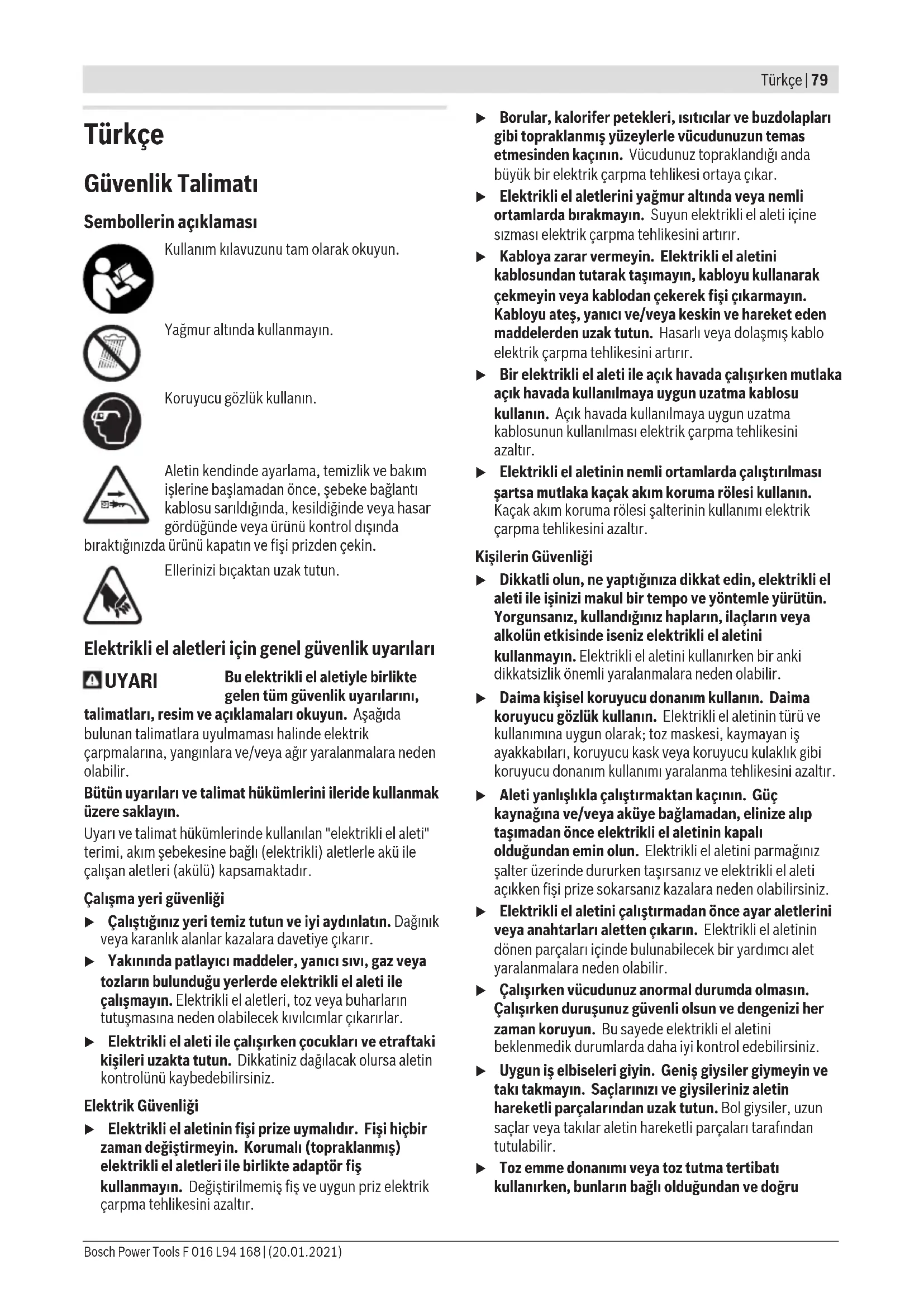Τα προϊόντα, τα εξαρτήματα και οι συσκευασίες πρέπει να ανακυκλώνονται με τρόπο φιλικό προς το περιβάλλον. Μην ρίχνετε τα προϊόντα στα απορρίμματα του σπιτιού σας! Μόνο για χώρες τηςΕΕ: Σύμφωνα με την Ευρωπαϊκή Οδηγία 2012/19/ΕΕ σχετικά με τις παλιές ηλεκτρικές και ηλεκτρονικές συσκευές και τη μεταφορά της οδηγίας αυτής σε εθνικό δίκαιο οι άχρηστες συσκευές πρέπει να συλλέγονται ξεχωριστά για να ανακυκλωθούν με τρόπο φιλικό προς το περιβάλλον. F 016 L94 168 | (20.01.2021) Bosch Power ToolsTürkçe | 79 Türkçe Güvenlik Talimatı Sembollerin açıklaması Kullanım kılavuzunu tam olarak okuyun. Yağmur altında kullanmayın. Koruyucu gözlük kullanın. Aletin kendinde ayarlama, temizlik ve bakım işlerine başlamadan önce, şebeke bağlantı kablosu sarıldığında, kesildiğinde veya hasar gördüğünde veya ürünü kontrol dışında bıraktığınızda ürünü kapatın ve fişi prizden çekin. Ellerinizi bıçaktan uzak tutun. Elektrikli el aletleri için genel güvenlik uyarıları UYARI Bu elektrikli el aletiyle birlikte gelen tüm güvenlik uyarılarını, talimatları, resim ve açıklamaları okuyun. Aşağıda bulunan talimatlara uyulmaması halinde elektrik çarpmalarına, yangınlara ve/veya ağır yaralanmalara neden olabilir. Bütün uyarıları ve talimat hükümlerini ileride kullanmak üzere saklayın. Uyarı ve talimat hükümlerinde kullanılan "elektrikli el aleti" terimi, akım şebekesine bağlı (elektrikli) aletlerle akü ile çalışan aletleri (akülü) kapsamaktadır. Çalışma yeri güvenliği u Çalıştığınız yeri temiz tutun ve iyi aydınlatın. Dağınık veya karanlık alanlar kazalara davetiye çıkarır. u Yakınında patlayıcı maddeler, yanıcı sıvı, gaz veya tozların bulunduğu yerlerde elektrikli el aleti ile çalışmayın. Elektrikli el aletleri, toz veya buharların tutuşmasına neden olabilecek kıvılcımlar çıkarırlar. u Elektrikli el aleti ile çalışırken çocukları ve etraftaki kişileri uzakta tutun. Dikkatiniz dağılacak olursa aletin kontrolünü kaybedebilirsiniz. Elektrik Güvenliği u Elektrikli el aletinin fişi prize uymalıdır. Fişi hiçbir zaman değiştirmeyin. Korumalı (topraklanmış) elektrikli el aletleri ile birlikte adaptör fiş kullanmayın. Değiştirilmemiş fiş ve uygun priz elektrik çarpma tehlikesini azaltır. u Borular, kalorifer petekleri, ısıtıcılar ve buzdolapları gibi topraklanmış yüzeylerle vücudunuzun temas etmesinden kaçının. Vücudunuz topraklandığı anda büyük bir elektrik çarpma tehlikesi ortaya çıkar. u Elektrikli el aletlerini yağmur altında veya nemli ortamlarda bırakmayın. Suyun elektrikli el aleti içine sızması elektrik çarpma tehlikesini artırır. u Kabloya zarar vermeyin. Elektrikli el aletini kablosundan tutarak taşımayın, kabloyu kullanarak çekmeyin veya kablodan çekerek fişi çıkarmayın. Kabloyu ateş, yanıcı ve/veya keskin ve hareket eden maddelerden uzak tutun. Hasarlı veya dolaşmış kablo elektrik çarpma tehlikesini artırır. u Bir elektrikli el aleti ile açık havada çalışırken mutlaka açık havada kullanılmaya uygun uzatma kablosu kullanın. Açık havada kullanılmaya uygun uzatma kablosunun kullanılması elektrik çarpma tehlikesini azaltır. u Elektrikli el aletinin nemli ortamlarda çalıştırılması şartsa mutlaka kaçak akım koruma rölesi kullanın. Kaçak akım koruma rölesi şalterinin kullanımı elektrik çarpma tehlikesini azaltır. Kişilerin Güvenliği u Dikkatli olun, ne yaptığınıza dikkat edin, elektrikli el aleti ile işinizi makul bir tempo ve yöntemle yürütün. Yorgunsanız, kullandığınız hapların, ilaçların veya alkolün etkisinde iseniz elektrikli el aletini kullanmayın. Elektrikli el aletini kullanırken bir anki dikkatsizlik önemli yaralanmalara neden olabilir. u Daima kişisel koruyucu donanım kullanın. Daima koruyucu gözlük kullanın. Elektrikli el aletinin türü ve kullanımına uygun olarak; toz maskesi, kaymayan iş ayakkabıları, koruyucu kask veya koruyucu kulaklık gibi koruyucu donanım kullanımı yaralanma tehlikesini azaltır. u Aleti yanlışlıkla çalıştırmaktan kaçının. Güç kaynağına ve/veya aküye bağlamadan, elinize alıp taşımadan önce elektrikli el aletinin kapalı olduğundan emin olun. Elektrikli el aletini parmağınız şalter üzerinde dururken taşırsanız ve elektrikli el aleti açıkken fişi prize sokarsanız kazalara neden olabilirsiniz. u Elektrikli el aletini çalıştırmadan önce ayar aletlerini veya anahtarları aletten çıkarın. Elektrikli el aletinin dönen parçaları içinde bulunabilecek bir yardımcı alet yaralanmalara neden olabilir. u Çalışırken vücudunuz anormal durumda olmasın. Çalışırken duruşunuz güvenli olsun ve dengenizi her zaman koruyun. Bu sayede elektrikli el aletini beklenmedik durumlarda daha iyi kontrol edebilirsiniz. u Uygun iş elbiseleri giyin. Geniş giysiler giymeyin ve takı takmayın. Saçlarınızı ve giysileriniz aletin hareketli parçalarından uzak tutun. Bol giysiler, uzun saçlar veya takılar aletin hareketli parçaları tarafından tutulabilir. u Toz emme donanımı veya toz tutma tertibatı kullanırken, bunların bağlı olduğundan ve doğru Bosch Power Tools F 016 L94 168 | (20.01.2021)80 | Türkçe kullanıldığından emin olun. Toz emme donanımının kullanımı tozdan kaynalanabilecek tehlikeleri azaltır. u Aletleri sık kullanmanız sebebiyle onlara alışmış olmanız, güvenlik prensiplerine uymanızı önlememelidir. Dikkatsiz bir hareket, bir anda ciddi yaralanmalara yol açabilir. El