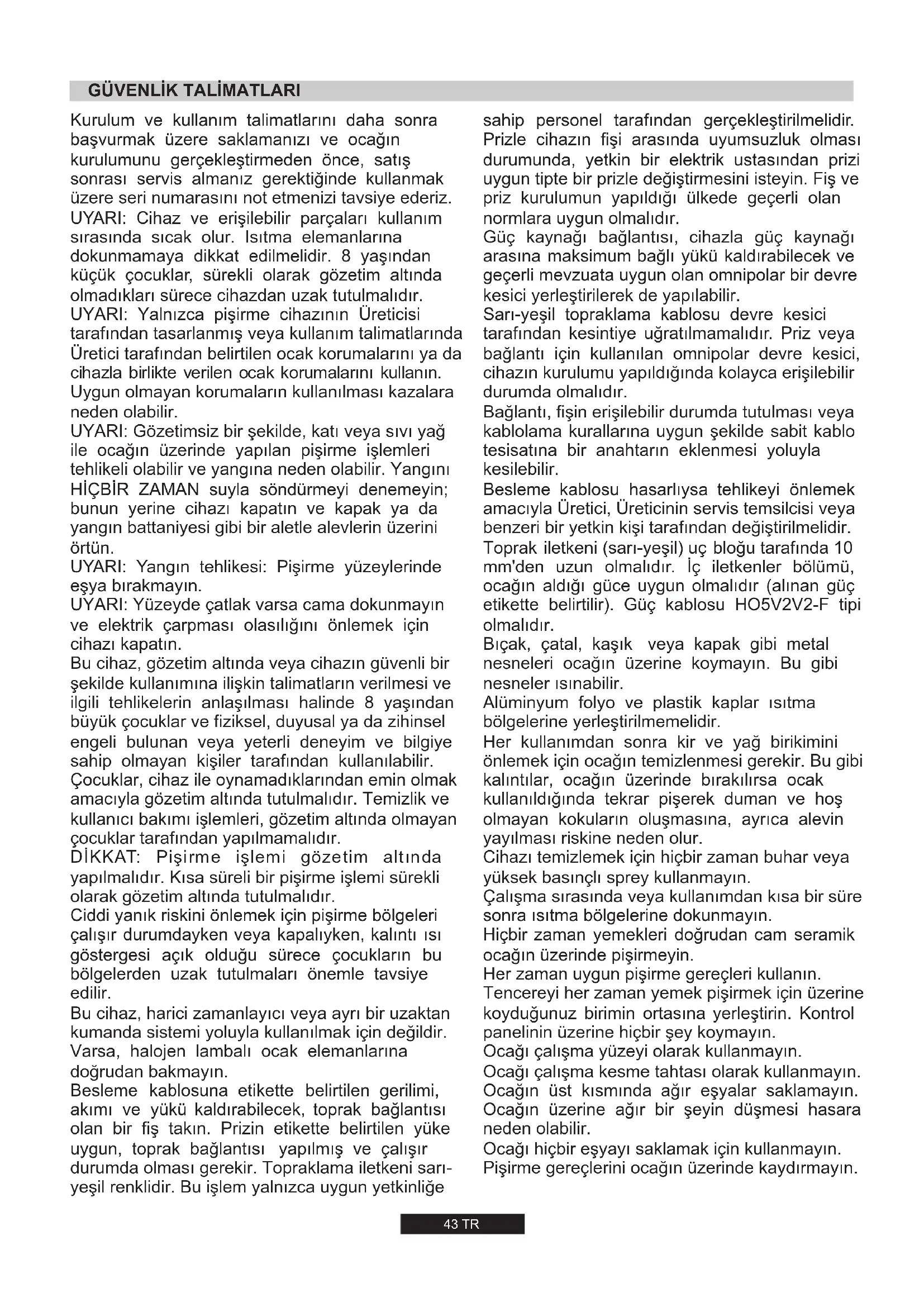 sahip personel tarafından gerçekleştirilmelidir. Prizle cihazın fişi arasında uyumsuzluk olması durumunda, yetkin bir elektrik ustasından prizi uygun tipte bir prizle değiştirmesini isteyin. Fiş ve priz kurulumun yapıldığı ülkede geçerli olan normlara uygun olmalıdır. Güç kaynağı bağlantısı, cihazla güç kaynağı arasına maksimum bağlı yükü kaldırabilecek ve geçerli mevzuata uygun olan omnipolar bir devre kesici yerleştirilerek de yapılabilir. Sarı-yeşil topraklama kablosu devre kesici tarafından kesintiye uğratılmamalıdır. Priz veya bağlantı için kullanılan omnipolar devre kesici, cihazın kurulumu yapıldığında kolayca erişilebilir durumda olmalıdır. Bağlantı, fişin erişilebilir durumda tutulması veya kablolama kurallarına uygun şekilde sabit kablo tesisatına bir anahtarın eklenmesi yoluyla kesilebilir. Besleme kablosu hasarlıysa tehlikeyi önlemek amacıyla Üretici, Üreticinin servis temsilcisi veya benzeri bir yetkin kişi tarafından değiştirilmelidir. Toprak iletkeni (sarı-yeşil) uç bloğu tarafında 10 mm'den uzun olmalıdır. İç iletkenler bölümü, ocağın aldığı güce uygun olmalıdır (alınan güç etikette belirtilir). Güç kablosu HO5V2V2-F tipi olmalıdır. Bıçak, çatal, kaşık veya kapak gibi metal nesneleri ocağın üzerine koymayın. Bu gibi nesneler ısınabilir. Alüminyum folyo ve plastik kaplar ısıtma bölgelerine yerleştirilmemelidir. Pişirme gereçlerini ocağın üzerinde kaydırmayın. Her kullanımdan sonra kir ve yağ birikimini önlemek için ocağın temizlenmesi gerekir. Bu gibi kalıntılar, ocağın üzerinde bırakılırsa ocak kullanıldığında tekrar pişerek duman ve hoş olmayan kokuların oluşmasına, ayrıca alevin yayılması riskine neden olur. Cihazı temizlemek için hiçbir zaman buhar veya yüksek basınçlı sprey kullanmayın. Ocağın üst kısmında ağır eşyalar saklamayın. Ocağın üzerine ağır bir şeyin düşmesi hasara neden olabilir. Ocağı çalışma yüzeyi olarak kullanmayın. Hiçbir zaman yemekleri doğrudan cam seramik ocağın üzerinde pişirmeyin. Ocağı çalışma kesme tahtası olarak kullanmayın. Her zaman uygun pişirme gereçleri kullanın. Ocağı hiçbir eşyayı saklamak için kullanmayın. Çalışma sırasında veya kullanımdan kısa bir süre sonra ısıtma bölgelerine dokunmayın. Tencereyi her zaman yemek pişirmek için üzerine koyduğunuz birimin ortasına yerleştirin. Kontrol panelinin üzerine hiçbir şey koymayın. 43 TROcakla arka duvar arasında en az 55 mm, yan taraflarda da ocakla dikey mobilya veya duvarlar arasında en az 150 mm mesafe bırakın. Ocağın üzerine bir mobilya monte edilecekse gereken minimum mesafe 700 mm'dir. Ocağın üzerine davlumbaz m o n t e e d e r k e n , l ü t f e n davlumbaz için belirtilen kurulum gereksinimlerine başvurun; ancak her durumda ocakla davlumbaz arasındaki mesafe en az 700 mm olmalıdır.