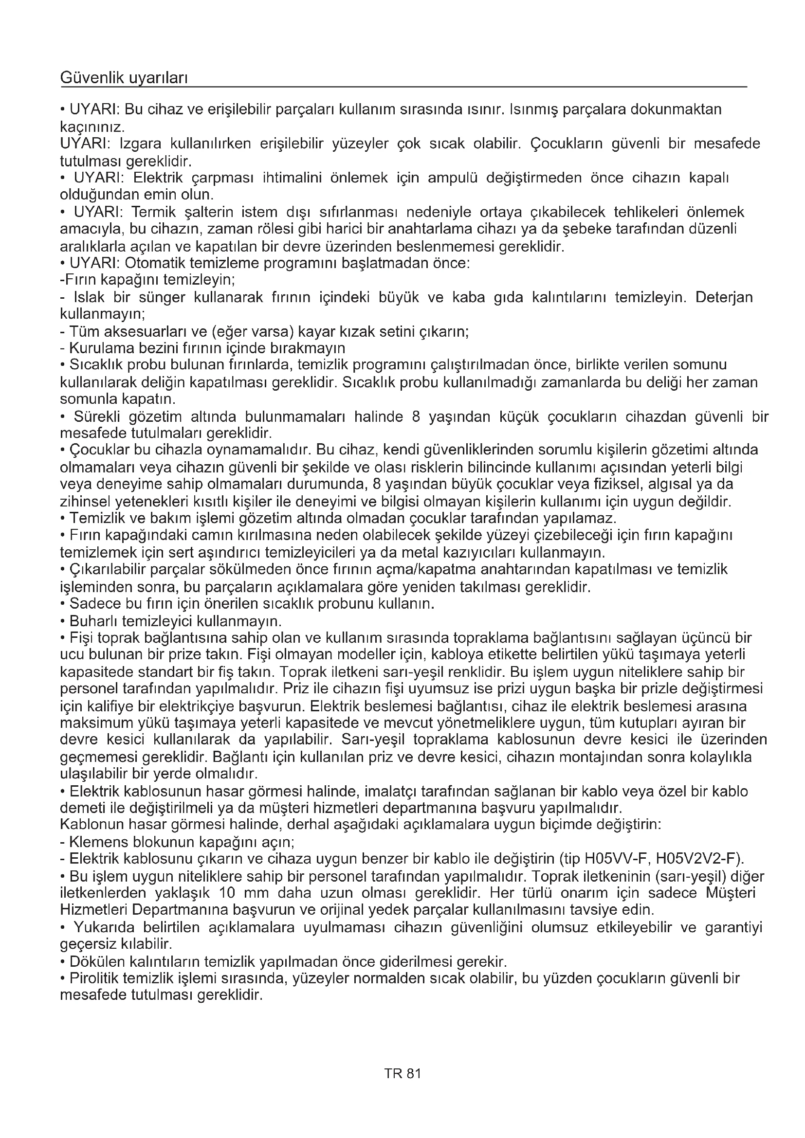 - Pirolitik temizlik işlemi sırasında, yüzeyler normalden sıcak olabilir, bu yüzden çocukların güvenli bir mesafede tutulması gereklidir. Güvenlik uyarıları TR 81Özet TR 82
