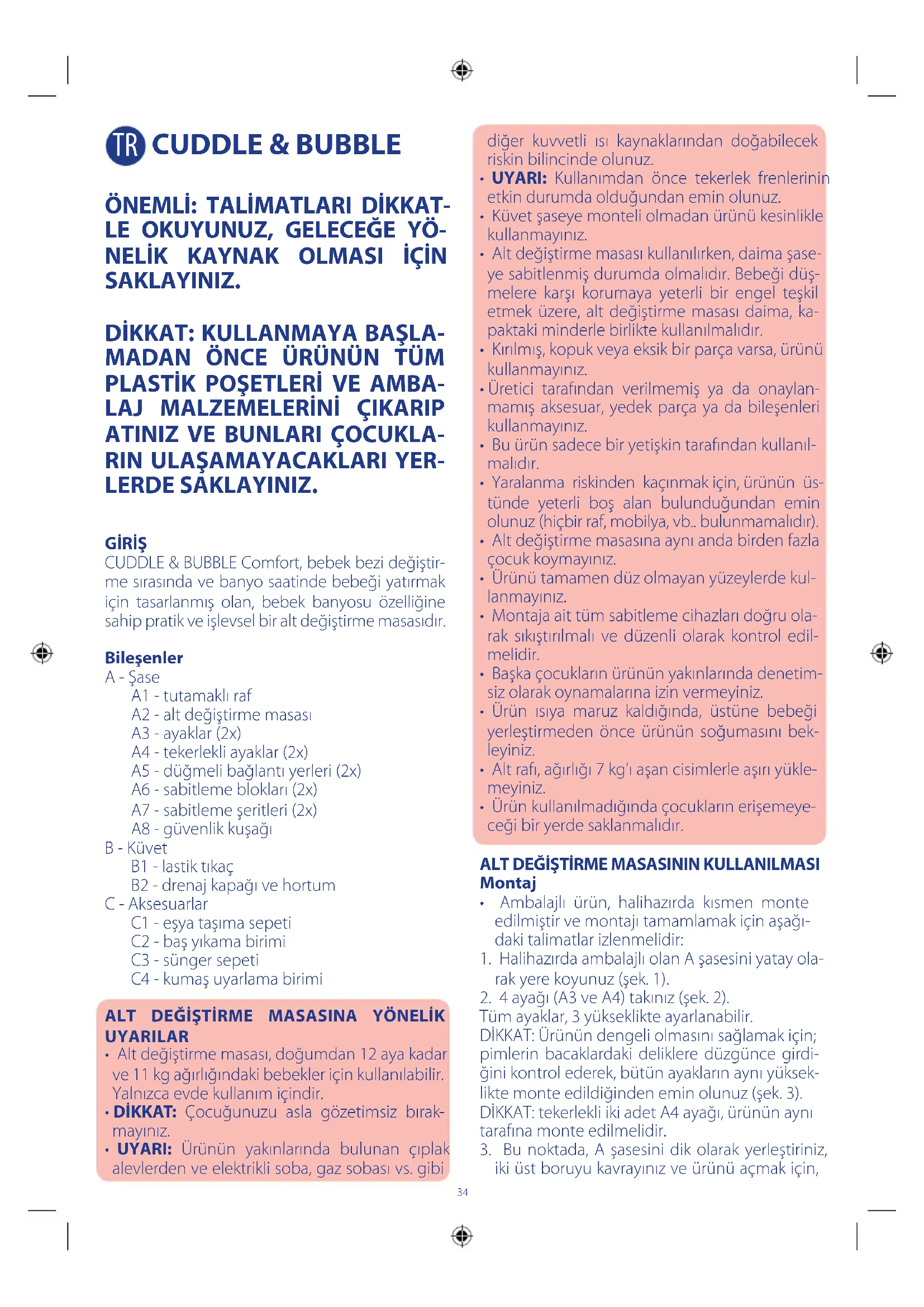 LERDE SAKLAYINIZ. GİRİŞ CUDDLE & BUBBLE Comfort, bebek bezi değiştir- me sırasında ve banyo saatinde bebeği yatırmak için tasarlanmış olan, bebek banyosu özelliğine sahip pratik ve işlevsel bir alt değiştirme masasıdır. Bileşenler A - Şase A1 - tutamaklı raf A2 - alt değiştirme masası A3 - ayaklar (2x) A4 - tekerlekli ayaklar (2x) A5 - düğmeli bağlantı yerleri (2x) A6 - sabitleme blokları (2x) A7 - sabitleme şeritleri (2x) A8 - güvenlik kuşağı B - Küvet B1 - lastik tıkaç B2 - drenaj kapağı ve hortum C - Aksesuarlar C1 - eşya taşıma sepeti C2 - baş yıkama birimi C3 - sünger sepeti C4 - kumaş uyarlama birimi ALT DEĞİŞTİRME MASASINA YÖNELİK UYARILAR