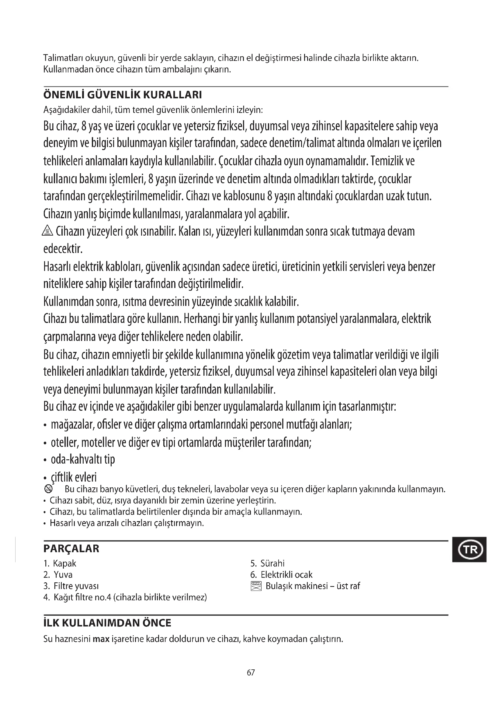 Aşağıdakiler dahil, tüm temel güvenlik önlemlerini izleyin: Bu cihaz, 8 yaş ve üzeri çocuklar ve yetersiz ziksel, duyumsal veya zihinsel kapasitelere sahip veya deneyim ve bilgisi bulunmayan kişiler tarafından, sadece denetim/talimat altında olmaları ve içerilen tehlikeleri anlamaları kaydıyla kullanılabilir. Çocuklar cihazla oyun oynamamalıdır. Temizlik ve kullanıcı bakımı işlemleri, 8 yaşın üzerinde ve denetim altında olmadıkları taktirde, çocuklar tarafından gerçekleştirilmemelidir. Cihazı ve kablosunu 8 yaşın altındaki çocuklardan uzak tutun. Cihazın yanlış biçimde kullanılması, yaralanmalara yol açabilir. h Cihazın yüzeyleri çok ısınabilir. Kalan ısı, yüzeyleri kullanımdan sonra sıcak tutmaya devam edecektir. Hasarlı elektrik kabloları, güvenlik açısından sadece üretici, üreticinin yetkili servisleri veya benzer niteliklere sahip kişiler tarafından değiştirilmelidir. Kullanımdan sonra, ısıtma devresinin yüzeyinde sıcaklık kalabilir. Cihazı bu talimatlara göre kullanın. Herhangi bir yanlış kullanım potansiyel yaralanmalara, elektrik çarpmalarına veya diğer tehlikelere neden olabilir. Bu cihaz, cihazın emniyetli bir şekilde kullanımına yönelik gözetim veya talimatlar verildiği ve ilgili tehlikeleri anladıkları takdirde, yetersiz ziksel, duyumsal veya zihinsel kapasiteleri olan veya bilgi veya deneyimi bulunmayan kişiler tarafından kullanılabilir. Bu cihaz ev içinde ve aşağıdakiler gibi benzer uygulamalarda kullanım için tasarlanmıştır: