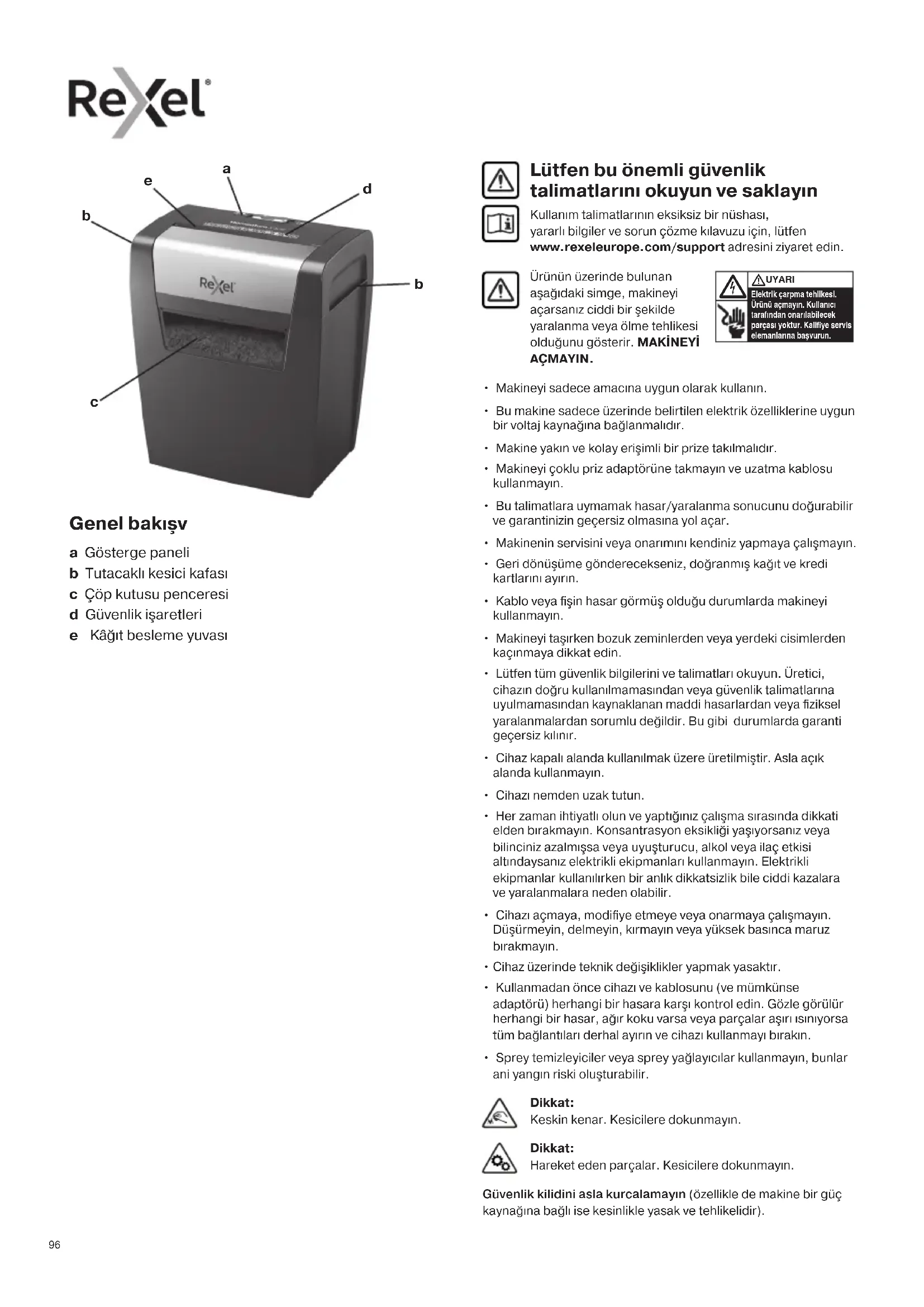 - Sprey temizleyiciler veya sprey yağlayıcılar kullanmayın, bunlar ani yangın riski oluşturabilir. Lütfen bu önemli güvenlik talimatlarını okuyun ve saklayın Kullanım talimatlarının eksiksiz bir nüshası, yararlı bilgiler ve sorun çözme kılavuzu için, lütfen www.rexeleurope.com/support adresini ziyaret edin. Ürünün üzerinde bulunan aşağıdaki simge, makineyi açarsanız ciddi bir şekilde yaralanma veya ölme tehlikesi olduğunu gösterir. MAKİNEYİ AÇMAYIN. Elektrik çarpma tehlikesi. Ürünü açmayın. Kullanıcı tarafından onarılabilecek parçası yoktur. Kaliye servis elemanlarına başvurun. UYARI