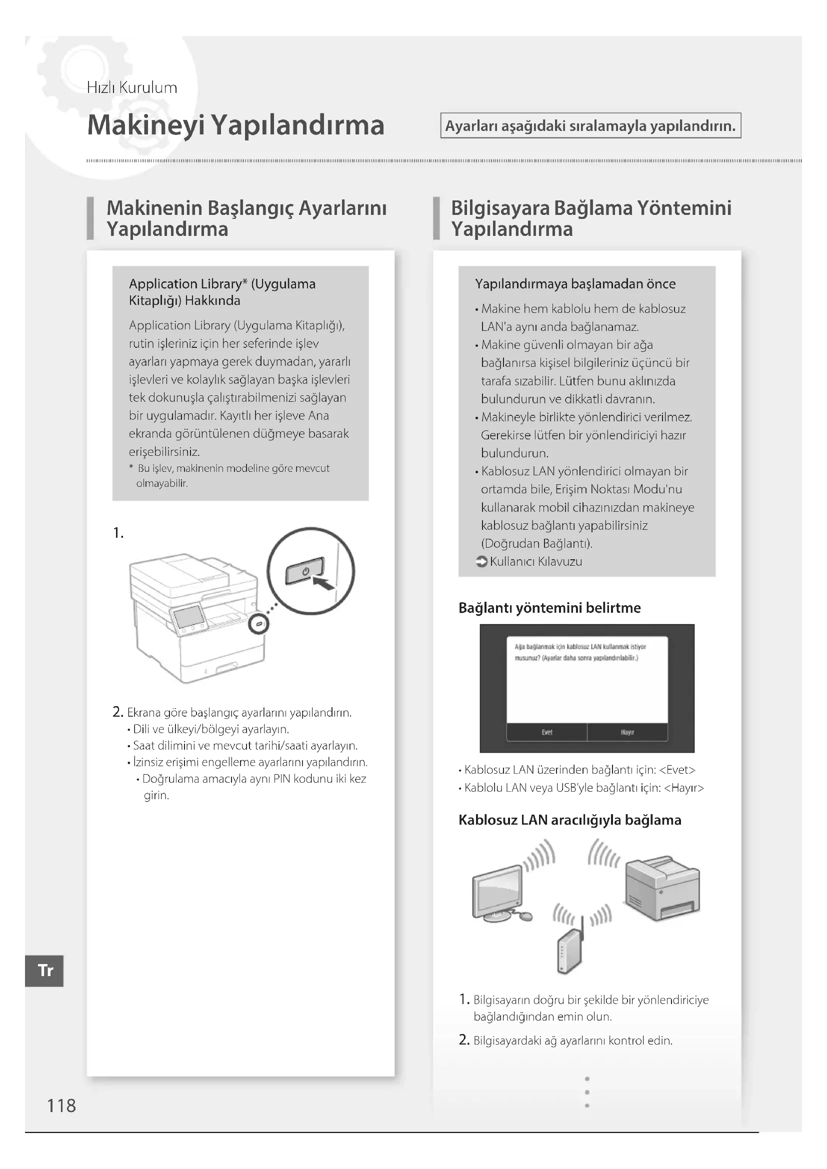 Ekrana göre başlangıç ayarlarını yapılandırın.• Dili ve ülkeyi/bölgeyi ayarlayın.• Saat dilimini ve mevcut tarihi/saati ayarlayın.• İzinsiz erişimi engelleme ayarlarını yapılandırın.• Doğrulama amacıyla aynı PIN kodunu iki kez girin.Yapılandırmaya başlamadan önce• Makine hem kablolu hem de kablosuz LAN'a aynı anda bağlanamaz.• Makine güvenli olmayan bir ağa bağlanırsa kişisel bilgileriniz üçüncü bir tarafa sızabilir. Lütfen bunu aklınızda bulundurun ve dikkatli davranın.• Makineyle birlikte yönlendirici verilmez. Gerekirse lütfen bir yönlendiriciyi hazır bulundurun.• Kablosuz LAN yönlendirici olmayan bir ortamda bile, Erişim Noktası Modu'nu kullanarak mobil cihazınızdan makineye kablosuz bağlantı yapabilirsiniz (Doğrudan Bağlantı). Kullanıcı KılavuzuBağlantı yöntemini belirtme• Kablosuz LAN üzerinden bağlantı için: <Evet>• Kablolu LAN veya USB’yle bağlantı için: <Hayır>Kablosuz LAN aracılığıyla bağlama Bilgisayarın doğru bir şekilde bir yönlendiriciye bağlandığından emin olun. Bilgisayardaki ağ ayarlarını kontrol edin.