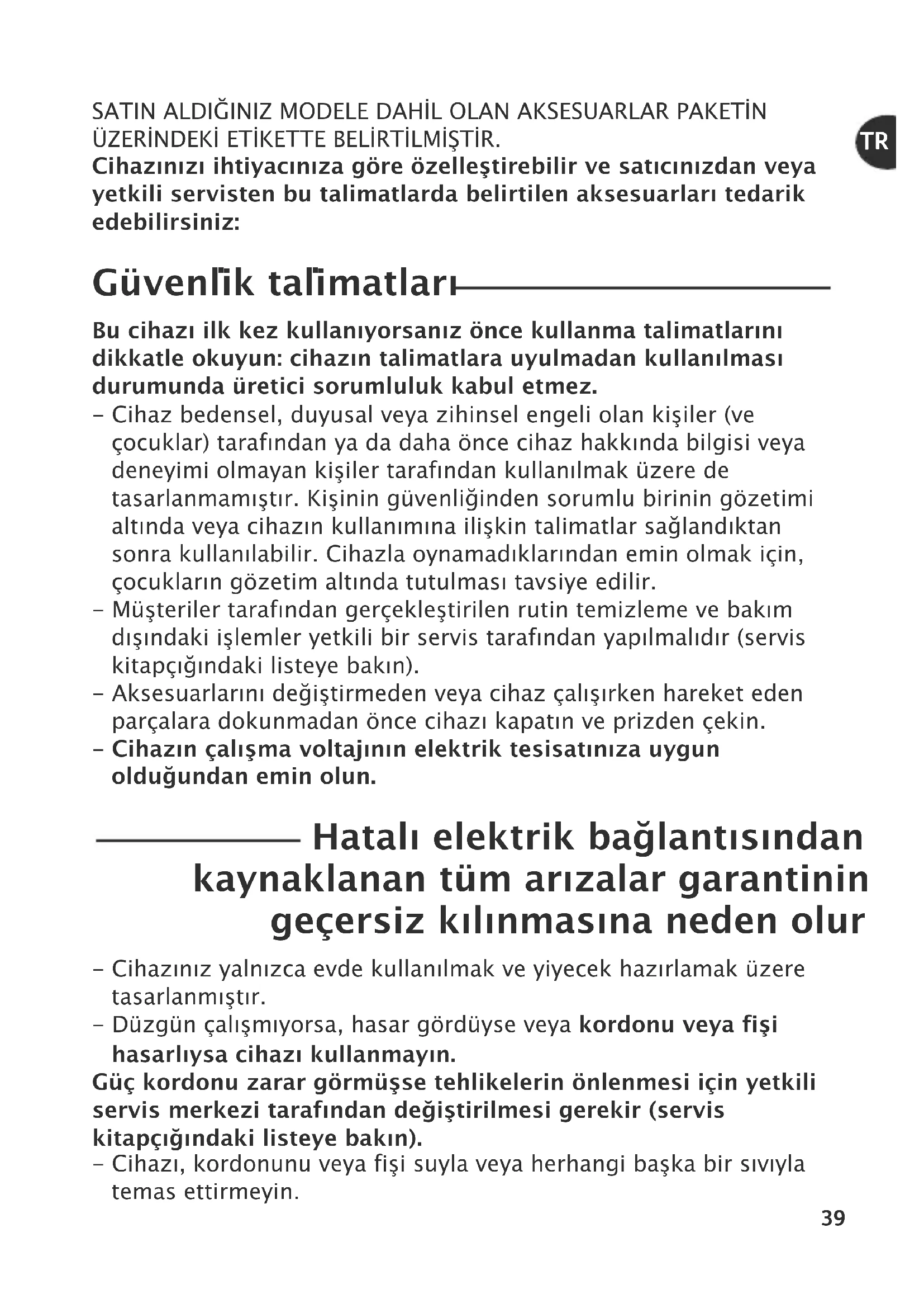 SATIN ALDIĞINIZ MODELE DAHİL OLAN AKSESUARLAR PAKETİN ÜZERİNDEKİ ETİKETTE BELİRTİLMİŞTİR. Cihazınızı ihtiyacınıza göre özelleştirebilir ve satıcınızdan veya yetkili servisten bu talimatlarda belirtilen aksesuarları tedarik edebilirsiniz: Güvenlik talimatları Bu cihazı ilk kez kullanıyorsanız önce kullanma talimatlarını dikkatle okuyun: cihazın talimatlara uyulmadan kullanılması durumunda üretici sorumluluk kabul etmez. - Cihaz bedensel, duyusal veya zihinsel engeli olan kişiler (ve çocuklar) tarafından ya da daha önce cihaz hakkında bilgisi veya deneyimi olmayan kişiler tarafından kullanılmak üzere de tasarlanmamıştır. Kişinin güvenliğinden sorumlu birinin gözetimi altında veya cihazın kullanımına ilişkin talimatlar sağlandıktan sonra kullanılabilir. Cihazla oynamadıklarından emin olmak için, çocukların gözetim altında tutulması tavsiye edilir. - Müşteriler tarafından gerçekleştirilen rutin temizleme ve bakım dışındaki işlemler yetkili bir servis tarafından yapılmalıdır (servis kitapçığındaki listeye bakın). - Aksesuarlarını değiştirmeden veya cihaz çalışırken hareket eden parçalara dokunmadan önce cihazı kapatın ve prizden çekin. - Cihazın çalışma voltajının elektrik tesisatınıza uygun olduğundan emin olun. Hatalı elektrik bağlantısından kaynaklanan tüm arızalar garantinin geçersiz kılınmasına neden olur - Cihazınız yalnızca evde kullanılmak ve yiyecek hazırlamak üzere tasarlanmıştır. - Düzgün çalışmıyorsa, hasar gördüyse veya kordonu veya fişi hasarlıysa cihazı kullanmayın. Güç kordonu zarar görmüşse tehlikelerin önlenmesi için yetkili servis merkezi tarafından değiştirilmesi gerekir (servis kitapçığındaki listeye bakın). - Cihazı, kordonunu veya fişi suyla veya herhangi başka bir sıvıyla temas ettirmeyin.- Güç kordonu çocukların erişebileceği yerlerden, cihazın ısınan parçalarından, herhangi bir ısı kaynağından ve sivri köşelerden uzak tutulmalıdır. - Güvenliğiniz için yalnızca cihazınıza uygun aksesuarlar ve yedek parçalar kullanın. - Besleme borusundaki yiyecekleri yönlendirmek için her zaman iticileri (b1, i1, L1*, L2*) kullanın, cihaz çalışır durumdayken hiçbir şekilde parmaklarınızı, çatal, kaşık, bıçak veya başka bir nesne kullanmayın. - Cihazınızı boşken çalıştırmayın. - Blender haznesini (h3) içinde malzeme olmadan, kapağı (h2) yokken veya içinde yalnızca kuru malzemeler varken çalıştırmayın ve içine kaynama derecesinde sıvılar koymayın. - Cihazınızı düz, temiz ve kuru bir yüzeyde kullanın. - Aksesuarları mikrodalga fırında kullanmayın ve sterilize etmeyin. - Çalışırken saç, eşarp, kravat veya herhangi başka bir şeyin aksesuarların üzerine sarkmasından kaçının. - Cihaz kullanılmadığı zamanlarda, temizlenirken veya elektrikler kesildiğinde prizden çıkarılmalıdır. - Metal bıçağı (d1), blender bıçağını (h), mini doğrayıcı (j), öğütücü (k) ve sebze doğrayıcı (e) diskleri tutarken dikkatli olun: son derece keskindirler. Hazne içindekileri boşaltmadan önce metal bıçağı (d1) iç kısımdaki çubuğun (c) üzerinden almanız gerekir. - Aksesuarları kap olarak kullanmayın (dondurma, pişirme veya sterilizasyon işlemleri için). - Katı meyve sıkacağının filtresi (i3) veya tabanı (i4) hasarlıysa bunları kullanmayın. - Mikseri (f2) veya çırpıcı diski (f1) sert hamur hazırlamak için kullanmayın. Temizleme - Cihazı fişten çekin. - Daha kolay temizlemek için kullandıktan sonra aksesuarları durulayın. - Aksesuarları temizleyin ve kurulayın: Mikserin (f2) ve motor ünitesinin (a) haricindeki aksesuarlar bulaşık makinesinde, su içinde veya musluğun altında yıkanabilir. Bunları nemli bir süngerle silin.
