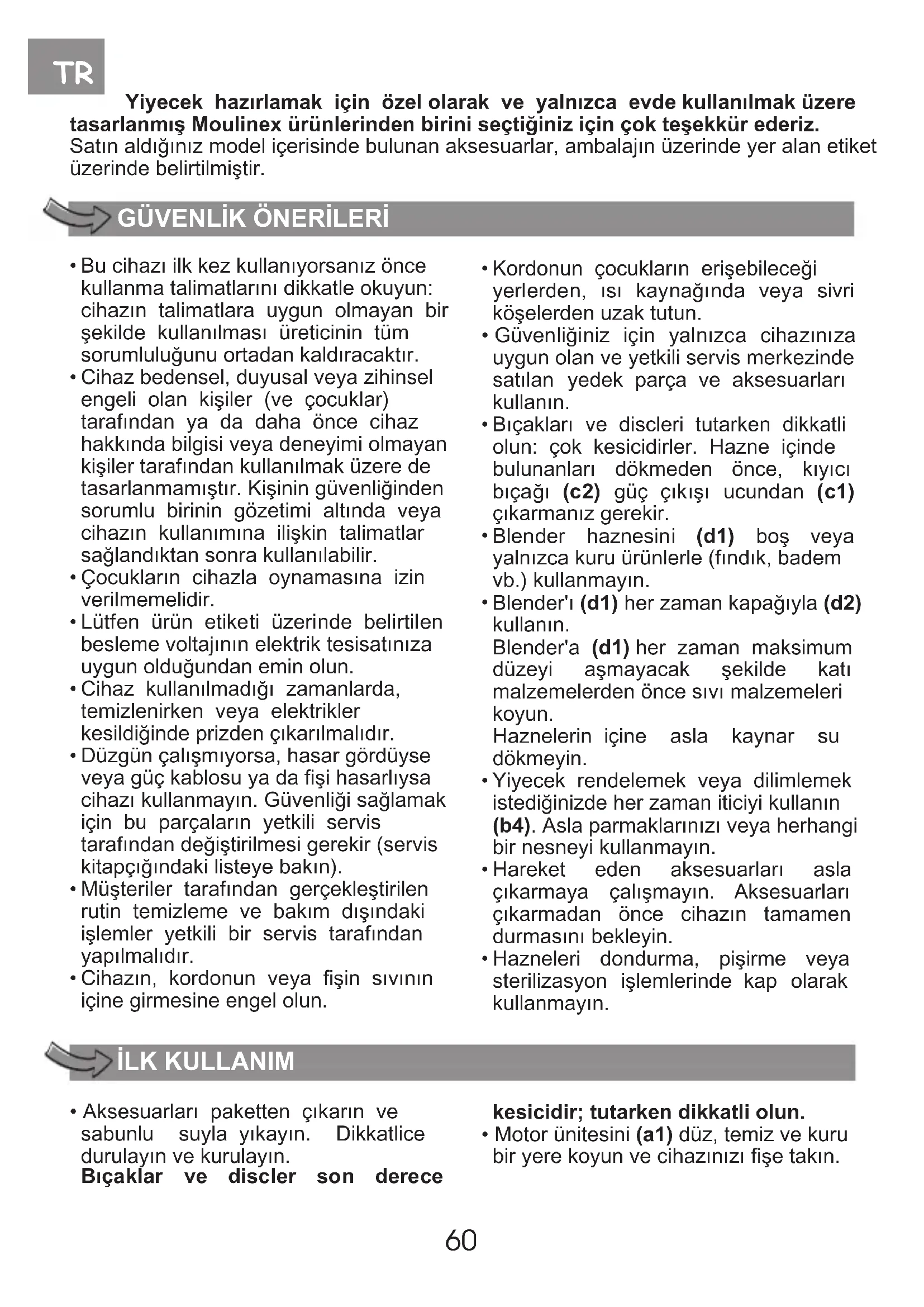 Blender'ın (d1) içine sıvı sabun damlatılmış sıcak su doldurun. Kapağı (d2) kapatın. Pulse düğmesine birkaç kez basın. Cihazı fişten çekin. Hazneyi çalkalayın ve kurumaya bırakın. Cihazınız çalışmıyorsa şunları kontrol edin: - cihazınızın elektrik bağlantısını. - haznenin doğru takıldığını (b1), kapağın doğru bir şekilde kilitlendiğini (b2), aksesuarların doğru takıldığını. - hız seçicinin doğru konumda olduğunu (a2). - kıyıcı haznesinin (b1) ve kapağının (b2) doğru bir şekilde kilitlendiğini blender'ı (d1) çalıştırmadan önce kontrol edin. Cihazınız özel bir koruma sistemine sahiptir. Cihazınız çalıştırılırken durursa kordonu prizden çekin ve karışım hazırlamaya devam etmeden önce 30 dakika soğumasını bekleyin. Tüm bu talimatları uyguladıysanız ve cihazınız hâlâ çalışmıyorsa: Yetkili servis ile iletişim kurun (Servis kitapçığındaki listeye bakın). Cihazınızı ihtiyacınıza göre özelleştirebilir ve satıcınızdan veya yetkili servisten şu aksesuarları tedarik edebilirsiniz: