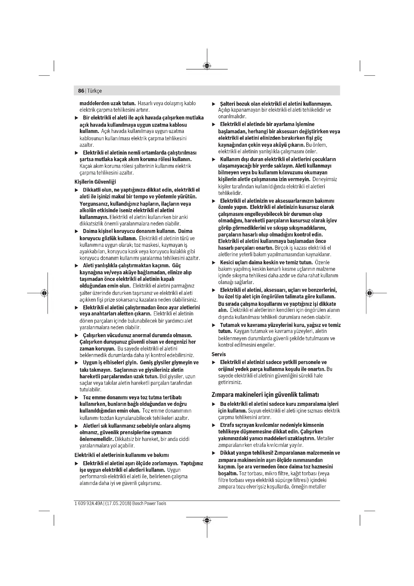 Τα ηλεκτρικά εργαλεία, τα εξαρτήματα και οι συσκευασίες πρέπει να ανακυκλώνονται με τρόπο φιλικό προς το περιβάλλον. Μην ρίχνετε τα ηλεκτρικά εργαλεία στα απορρίμματα του σπιτιού σας! Μόνο για χώρες τηςΕΕ: Σύμφωνα με την Ευρωπαϊκή Οδηγία 2012/19/ΕΕ σχετικά με τις παλιές ηλεκτρικές και ηλεκτρονικές συσκευές και τη μεταφορά της οδηγίας αυτής σε εθνικό δίκαιο δεν είναι πλέον υποχρεωτικό, τα άχρηστα ηλεκτρικά εργαλεία να συλλέγονται ξεχωριστά για να ανακυκλωθούν με τρόπο φιλικό προς το περιβάλλον. Türkçe Güvenlik talimatı Elektrikli el aletleri için genel güvenlik uyarıları UYARI Bu elektrikli el aletiyle birlikte gelen tüm güvenlik uyarılarını, talimatları, resim ve açıklamaları okuyun. Aşağıda bulunan talimatlara uyulmaması halinde elektrik çarpmalarına, yangınlara ve/veya ağır yaralanmalara neden olabilir. Bütün uyarıları ve talimat hükümlerini ileride kullanmak üzere saklayın. Uyarı ve talimat hükümlerinde kullanılan "elektrikli el aleti" terimi, akım şebekesine bağlı (elektrikli) aletlerle akü ile çalışan aletleri (akülü) kapsamaktadır. Çalışma yeri güvenliği u Çalıştığınız yeri temiz tutun ve iyi aydınlatın. Dağınık veya karanlık alanlar kazalara davetiye çıkarır. u Yakınında patlayıcı maddeler, yanıcı sıvı, gaz veya tozların bulunduğu yerlerde elektrikli el aleti ile çalışmayın. Elektrikli el aletleri, toz veya buharların tutuşmasına neden olabilecek kıvılcımlar çıkarırlar. u Elektrikli el aleti ile çalışırken çocukları ve etraftaki kişileri uzakta tutun. Dikkatiniz dağılacak olursa aletin kontrolünü kaybedebilirsiniz. Elektrik Güvenliği u Elektrikli el aletinin fişi prize uymalıdır. Fişi hiçbir zaman değiştirmeyin. Korumalı (topraklanmış) elektrikli el aletleri ile birlikte adaptör fiş kullanmayın. Değiştirilmemiş fiş ve uygun priz elektrik çarpma tehlikesini azaltır. u Borular, kalorifer petekleri, ısıtıcılar ve buzdolapları gibi topraklanmış yüzeylerle vücudunuzun temas etmesinden kaçının. Vücudunuz topraklandığı anda büyük bir elektrik çarpma tehlikesi ortaya çıkar. u Elektrikli el aletlerini yağmur altında veya nemli ortamlarda bırakmayın. Suyun elektrikli el aleti içine sızması elektrik çarpma tehlikesini artırır. u Kabloya zarar vermeyin. Elektrikli el aletini kablosundan tutarak taşımayın, kabloyu kullanarak çekmeyin veya kablodan çekerek fişi çıkarmayın. Kabloyu ateş, yanıcı ve/veya keskin ve hareket eden Türkçe | 85 Bosch Power Tools 1 609 92A 49A | (17.05.2018)86 | Türkçe 1 609 92A 49A | (17.05.2018) Bosch Power Tools maddelerden uzak tutun. Hasarlı veya dolaşmış kablo elektrik çarpma tehlikesini artırır. u Bir elektrikli el aleti ile açık havada çalışırken mutlaka açık havada kullanılmaya uygun uzatma kablosu kullanın. Açık havada kullanılmaya uygun uzatma kablosunun kullanılması elektrik çarpma tehlikesini azaltır. u Elektrikli el aletinin nemli ortamlarda çalıştırılması şartsa mutlaka kaçak akım koruma rölesi kullanın. Kaçak akım koruma rölesi şalterinin kullanımı elektrik çarpma tehlikesini azaltır. Kişilerin Güvenliği u Dikkatli olun, ne yaptığınıza dikkat edin, elektrikli el aleti ile işinizi makul bir tempo ve yöntemle yürütün. Yorgunsanız, kullandığınız hapların, ilaçların veya alkolün etkisinde iseniz elektrikli el aletini kullanmayın. Elektrikli el aletini kullanırken bir anki dikkatsizlik önemli yaralanmalara neden olabilir. u Daima kişisel koruyucu donanım kullanın. Daima koruyucu gözlük kullanın. Elektrikli el aletinin türü ve kullanımına uygun olarak; toz maskesi, kaymayan iş ayakkabıları, koruyucu kask veya koruyucu kulaklık gibi koruyucu donanım kullanımı yaralanma tehlikesini azaltır. u Aleti yanlışlıkla çalıştırmaktan kaçının. Güç kaynağına ve/veya aküye bağlamadan, elinize alıp taşımadan önce elektrikli el aletinin kapalı olduğundan emin olun. Elektrikli el aletini parmağınız şalter üzerinde dururken taşırsanız ve elektrikli el aleti açıkken fişi prize sokarsanız kazalara neden olabilirsiniz. u Elektrikli el aletini çalıştırmadan önce ayar aletlerini veya anahtarları aletten çıkarın. Elektrikli el aletinin dönen parçaları içinde bulunabilecek bir yardımcı alet yaralanmalara neden olabilir. u Çalışırken vücudunuz anormal durumda olmasın. Çalışırken duruşunuz güvenli olsun ve dengenizi her zaman koruyun. Bu sayede elektrikli el aletini beklenmedik durumlarda daha iyi kontrol edebilirsiniz. u Uygun iş elbiseleri giyin. Geniş giysiler giymeyin ve takı takmayın. Saçlarınızı ve giysileriniz aletin hareketli parçalarından uzak tutun. Bol giysiler, uzun saçlar veya takılar aletin hareketli parçaları tarafından tutulabilir. u Toz emme donanımı veya toz tutma tertibatı kullanırken, bunların bağlı olduğundan ve doğru kullanıldığından emin olun. Toz emme donanımının kullanımı tozdan kaynalanabilecek tehlikeleri azaltır. u Aletleri sık kullanmanız sebebiyle onlara alışmış olmanız, güvenlik prensiplerine uymanızı önlememelidir. Dikkatsiz bir hareket, bir anda ciddi yaralanmalara yol açabilir. Elektrikli el aletlerinin kullanımı ve bakımı u Elektrikli el aletini aşırı ölçüde zorlamayın. Yaptığınız işe uygun elektrikli el aletleri kullanın. Uygun performanslı elektrikli el aleti ile, belirlenen çalışma alanında daha iyi ve güvenli çalışırsınız. u Şalteri bozuk olan elektrikli el al