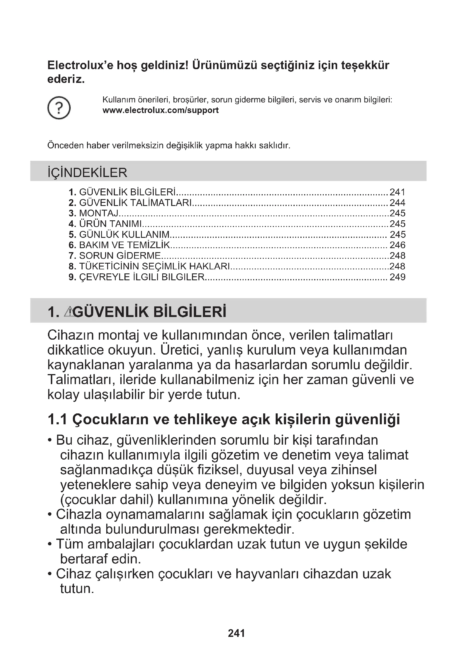 - Cihaz çalışırken çocukları ve hayvanları cihazdan uzak tutun. 241• Temizlik ve kullanıcı tarafından gerçekleştirilen bakım işlemleri, gözetim altında olmadıkları sürece çocuklar tarafından gerçekleştirilmemelidir.