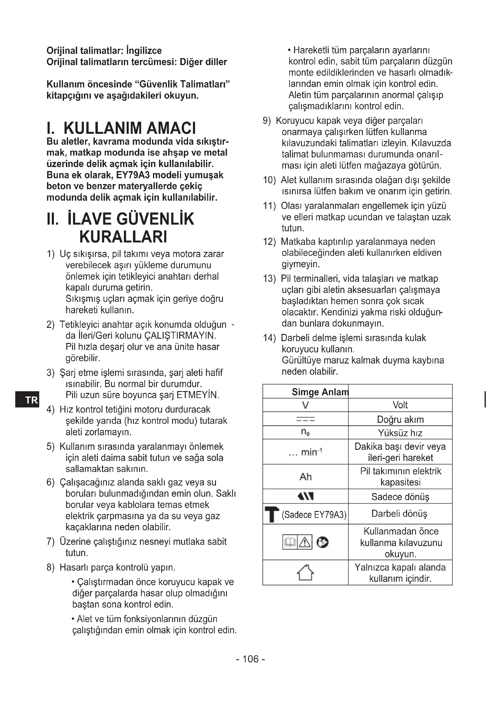 koruyucu kullanın. Gürültüye maruz kalmak duyma kaybına neden olabilir. Simge Anlam Volt Doğru akım Yüksüz hız Dakika başı devir veya ileri-geri hareket Pil takımının elektrik kapasitesi Sadece dönüş (Sadece EY79A3) Darbeli dönüş Kullanmadan önce kullanma kılavuzunu okuyun. Yalnızca kapalı alanda kullanım içindir.- 107 -